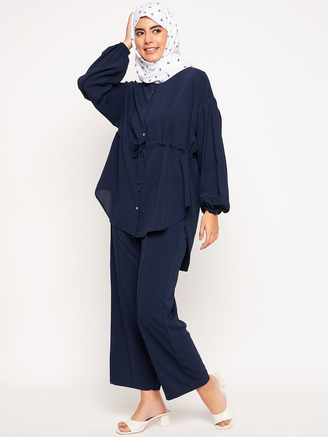 The Nabia Modest Matching Set combines a full-sleeved top with wide-leg pants, both made from premium Blue solid cy crush fabric. This ensemble strikes the perfect balance between style and modesty, offering a comfortable and fashionable option. Ideal for those embracing modest fashion, it allows for a modestly elegant and stylish look
