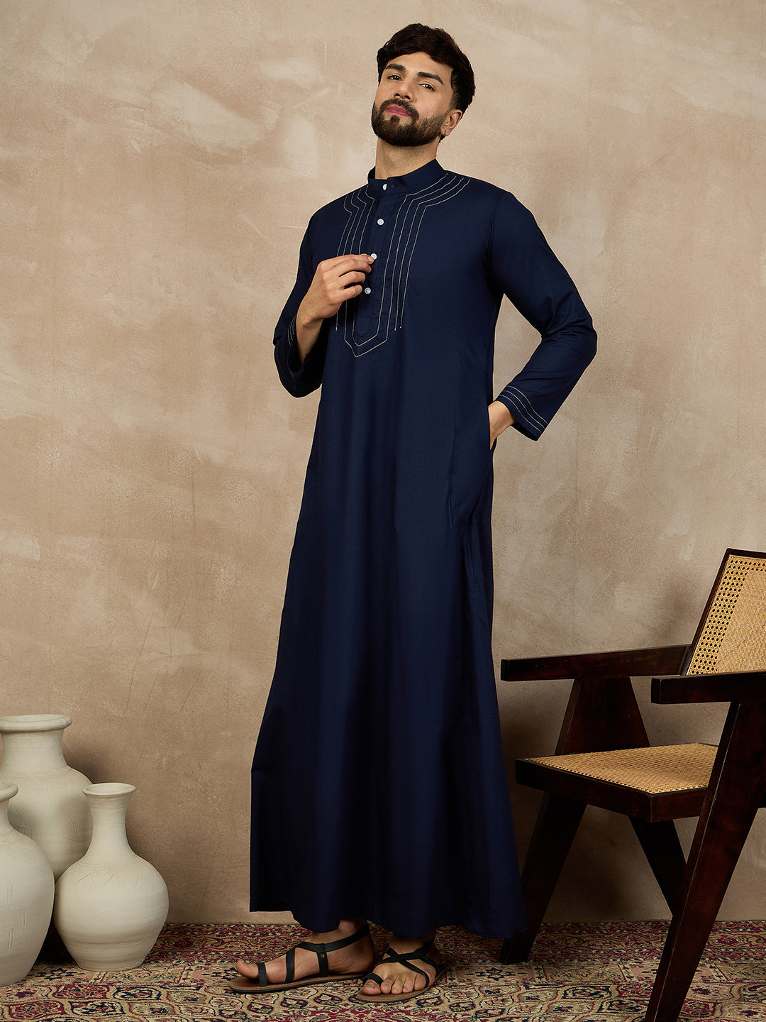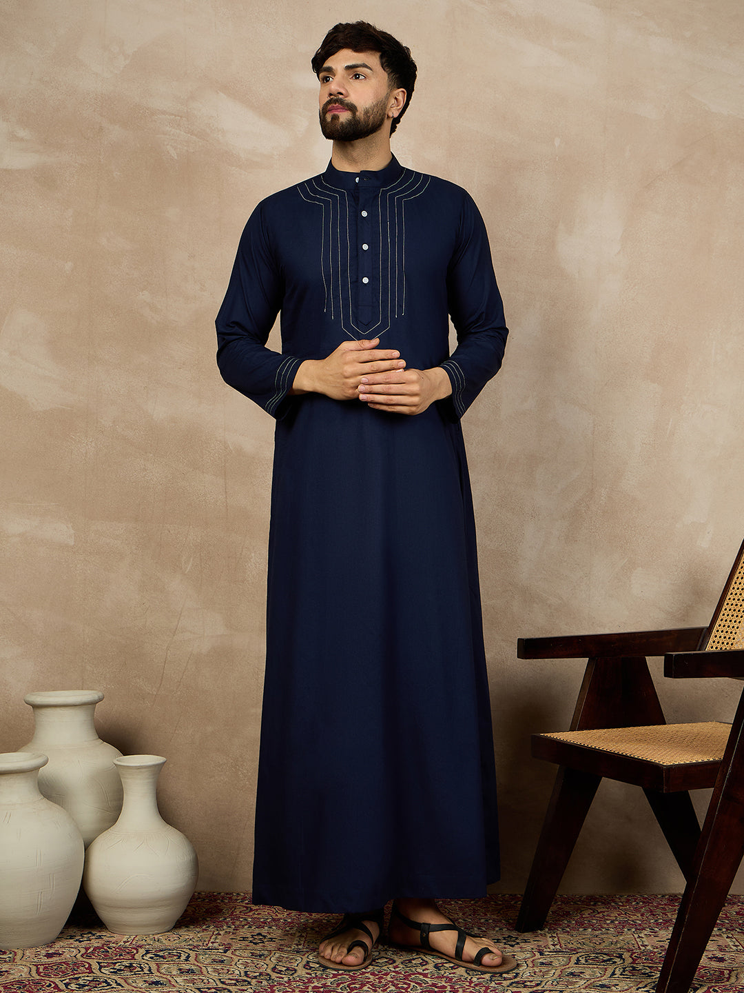The Nabia blue solid Arabic Saudi thobe/jubba is crafted for Islamic and Muslim men who appreciate elegance and comfort. Made from soft cotton, it features a Mandarin collar, long bell sleeves, and functional pockets for practicality. The intricate thread detailing adds a refined touch, while the button closure enhances its classic appeal. Perfect for any occasion, this stylish thobe blends tradition with modern sophistication for a confident look.