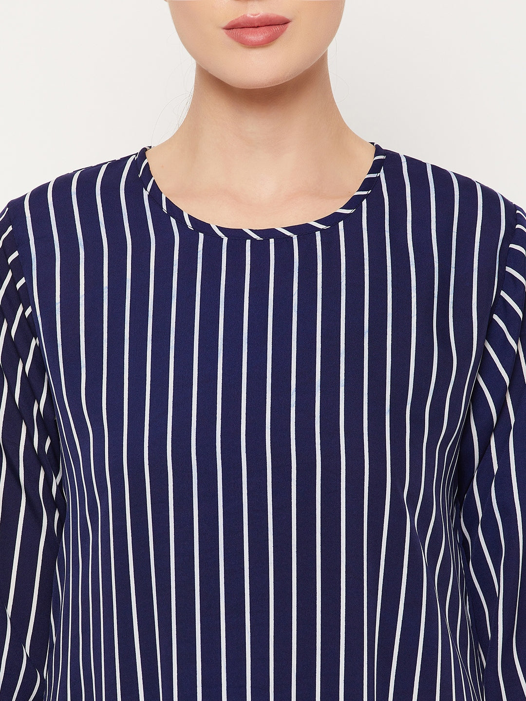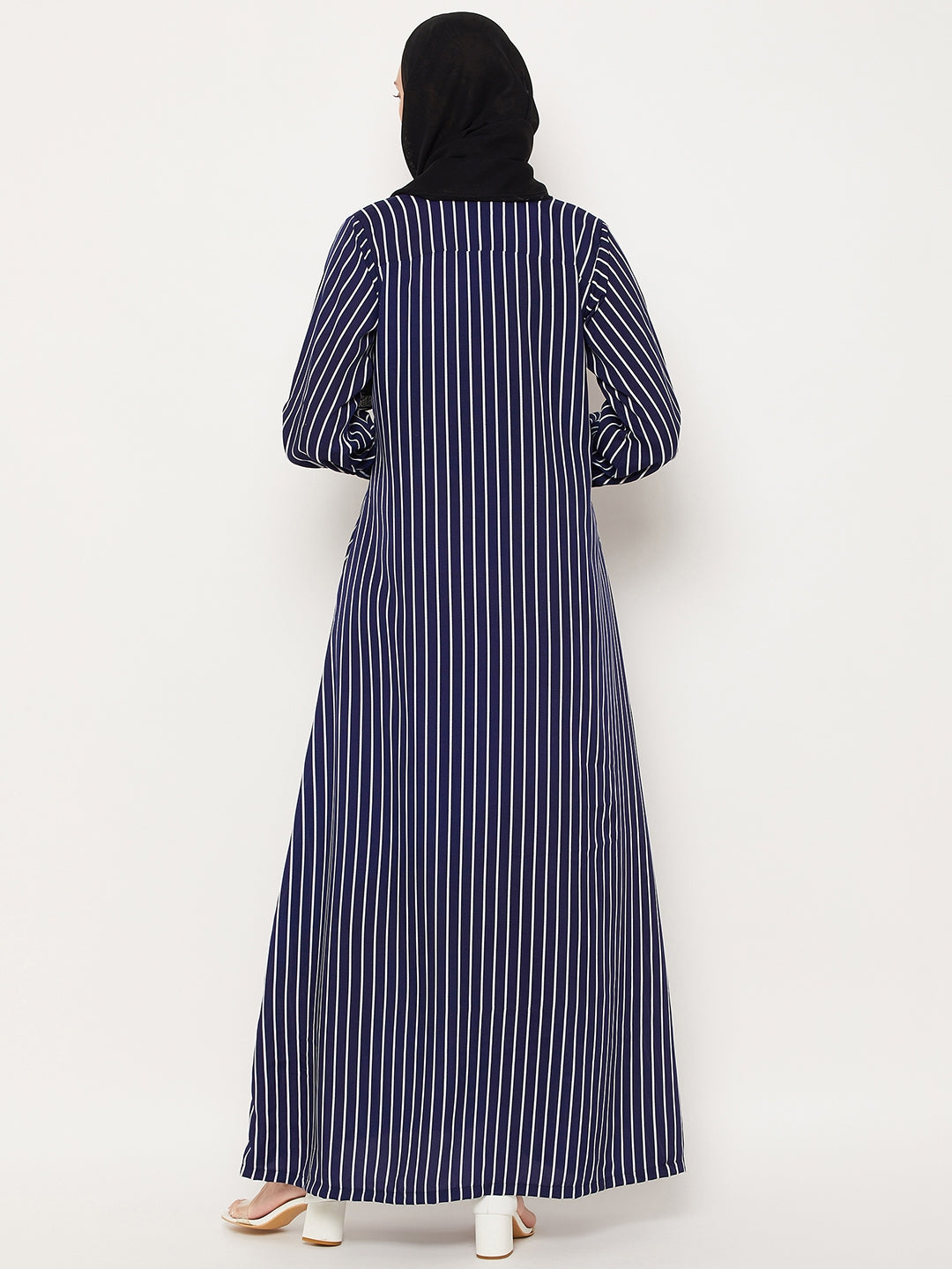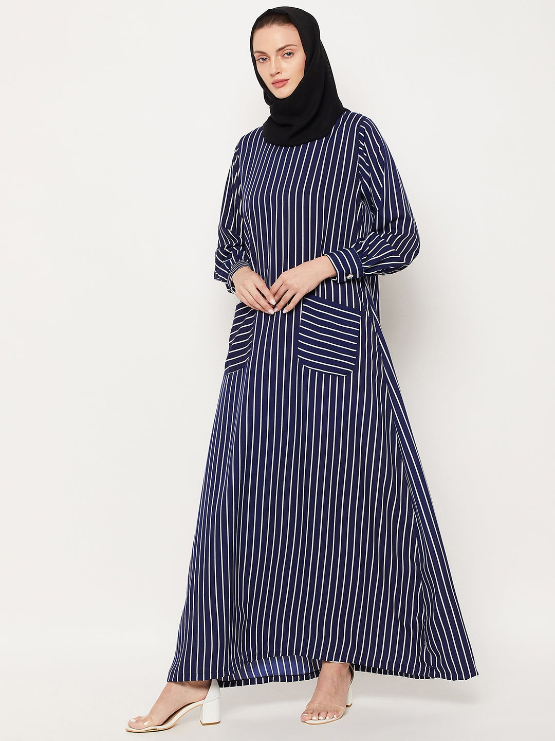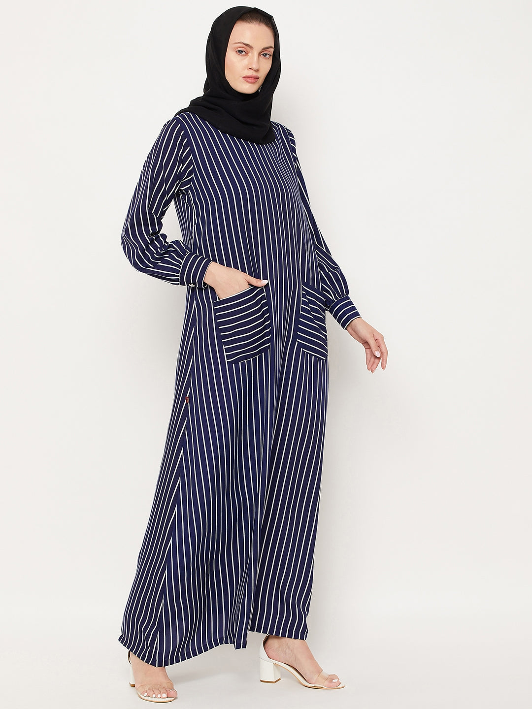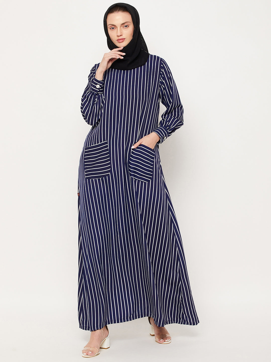 Elevate your modest style with the Blue Stripe Abaya by Nabia, featuring a front-open design with a button closure. Made from high-quality Crepe Fabric, this Islamic attire is tailored for Muslim women who value both faith and fashion. It also offers practicality with two convenient patch pockets for carrying essentials.