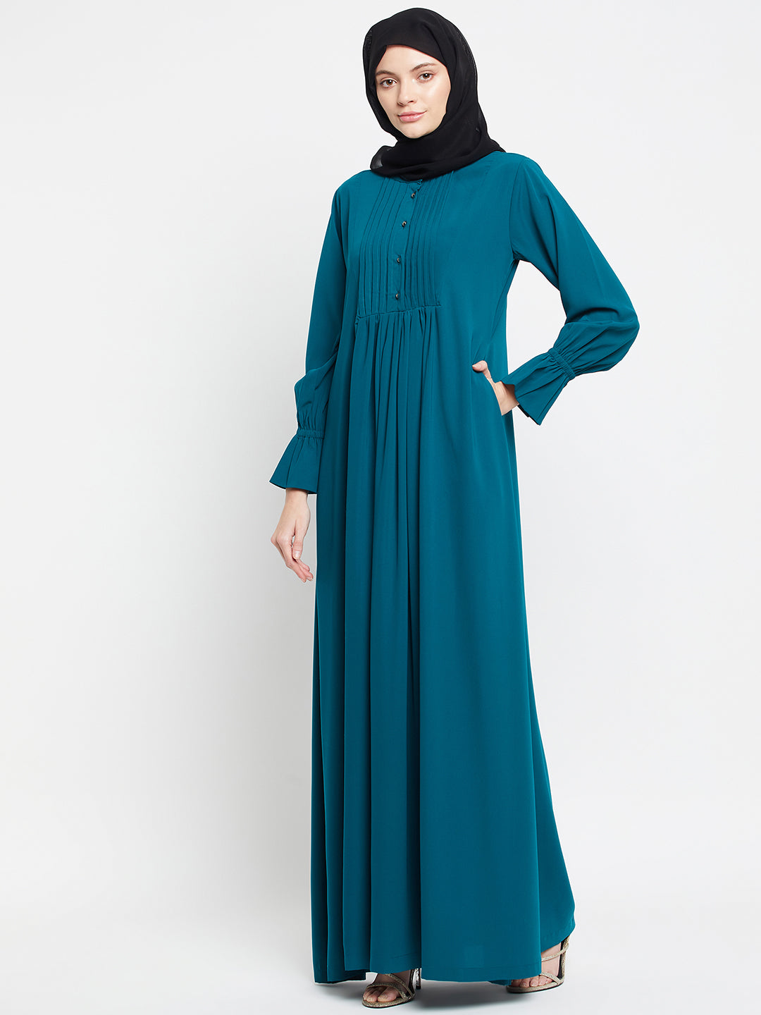 The Nabia A-Line bottle green abaya for women showcases elegant pleats and buttons on the front, adding a stylish design element. With elastic in the sleeves for adjustment and crafted from Nida Matte fabric, it offers both fashion and comfort.