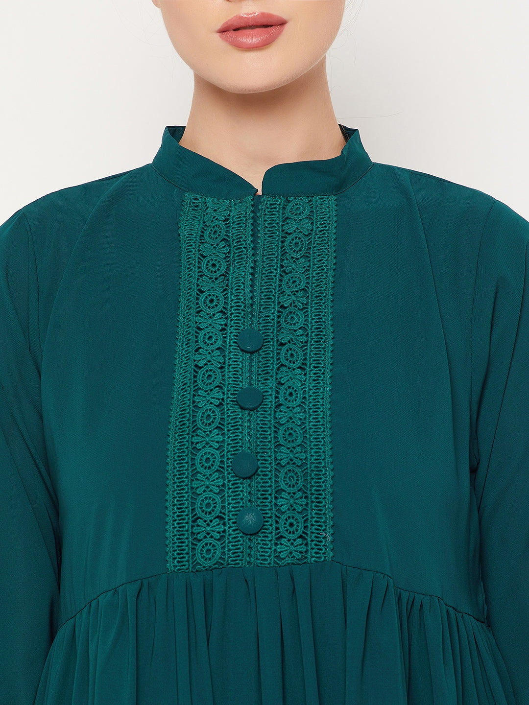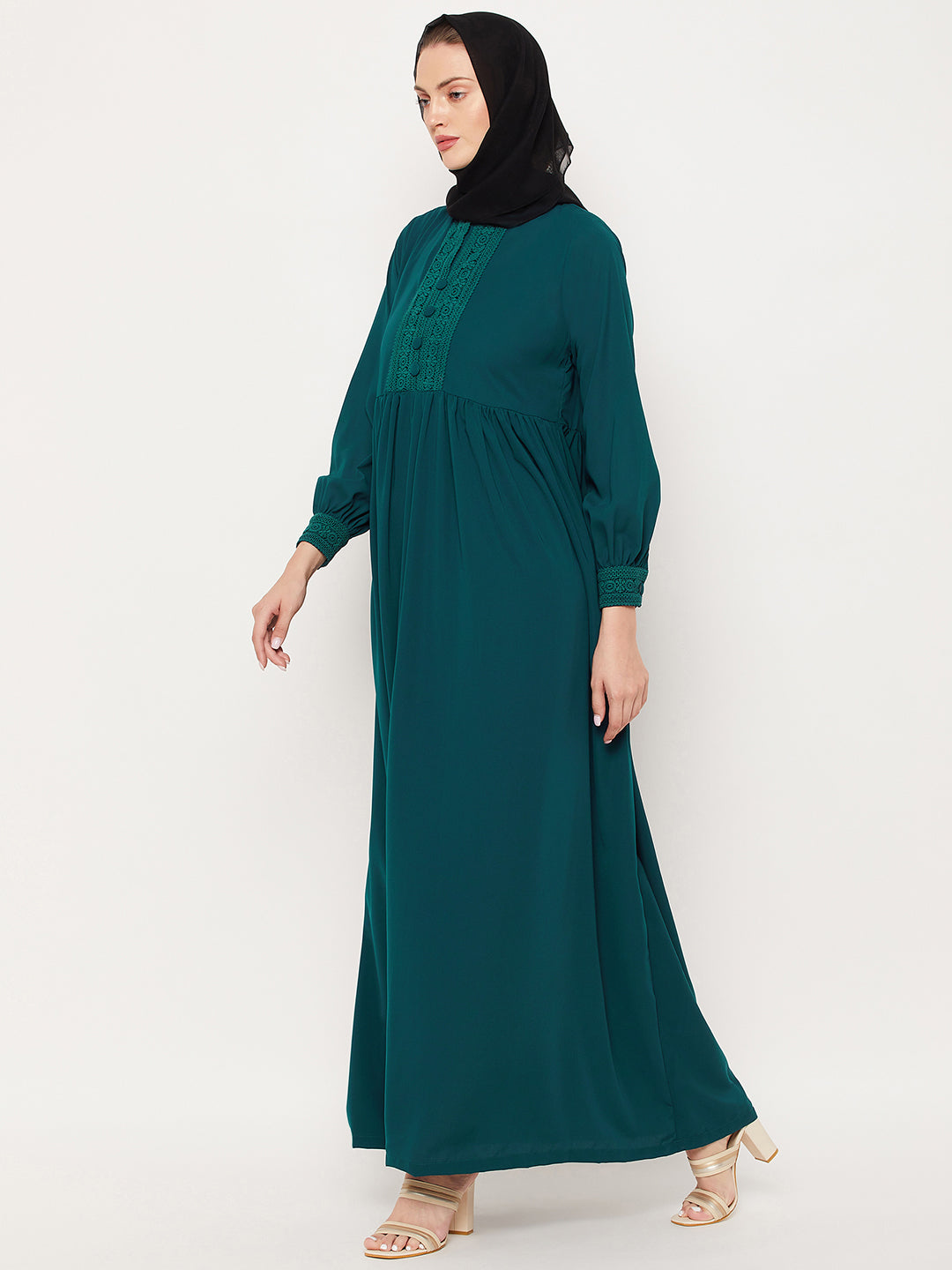 Capture the essence of tradition and contemporary fashion in this bottle geen abaya. The lace detailing design round neck and long sleeves abaya is crafted from a smooth nida matte fabric for a graceful look. For an added touch of elegance, pair it with one of our georgette scarves, allowing you to carry a bold and confident look wherever your journey takes you.