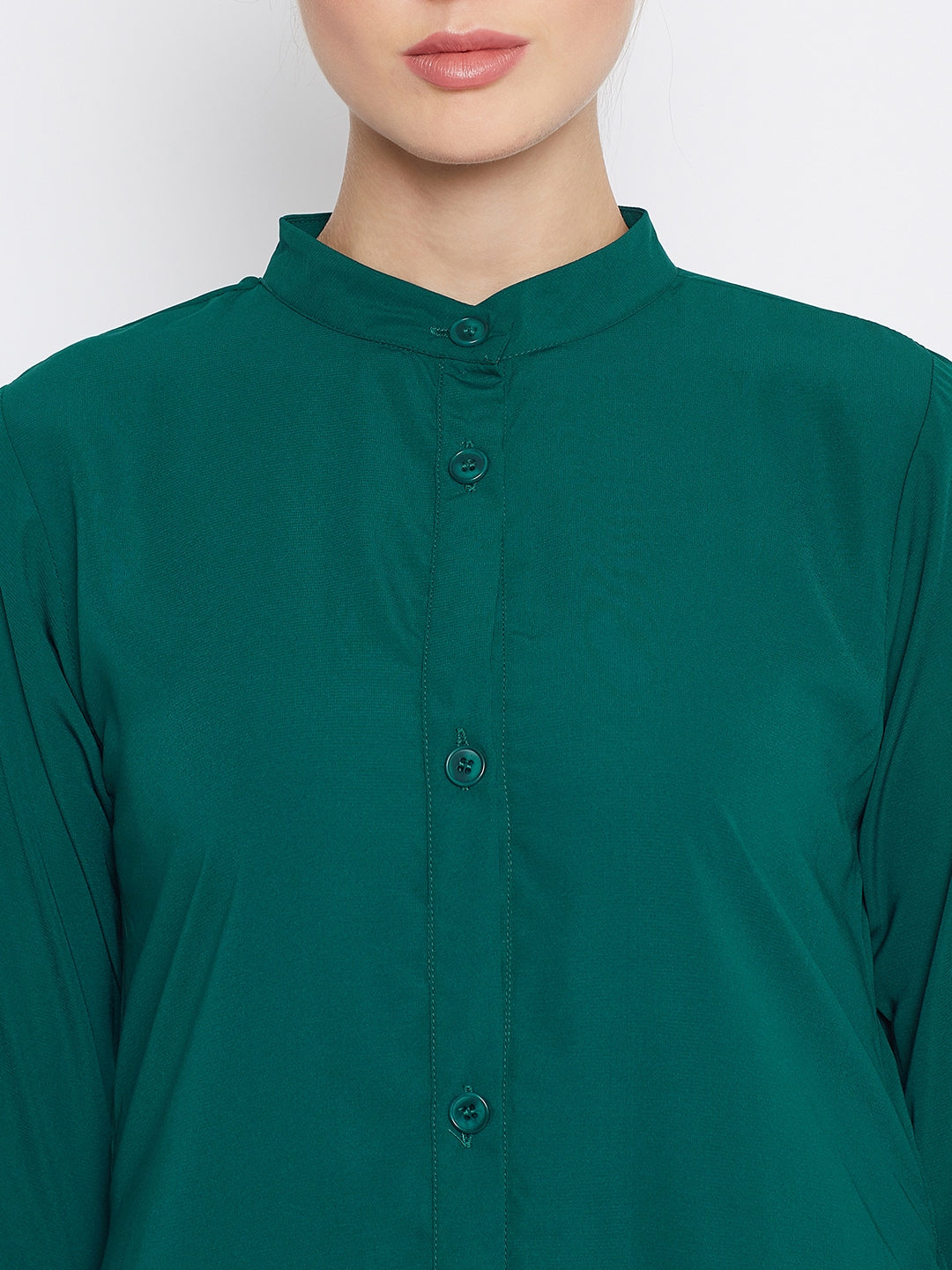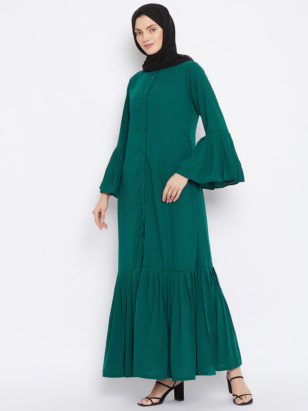 Nabia's Front Open Abaya Dress for women is tailored from solid Nida Matte fabric, featuring a plate design on the sleeves and bottom. The long & umbrella sleeves, mandarin collar, and both side pockets offer a perfect blend of style and functionality for contemporary Muslim women.