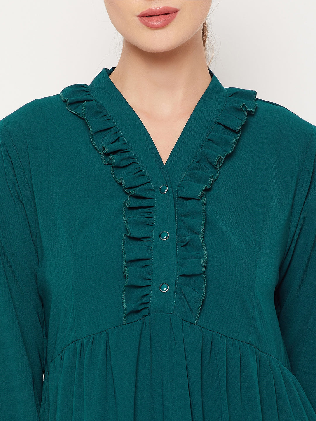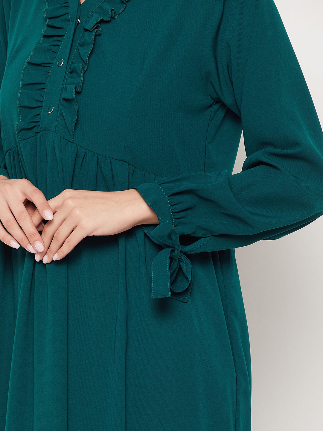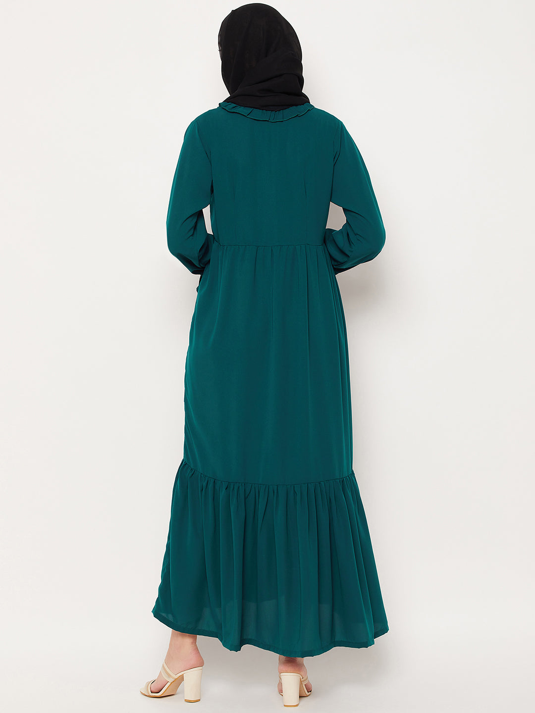 Nabia's Bottle Green Abaya Dress for women showcases a charming frill design with a ruffle detail on the neck. Adorned with buttons and tie-knot long sleeves, it combines elegance and modernity, offering a sophisticated and fashionable choice for contemporary Muslim women.