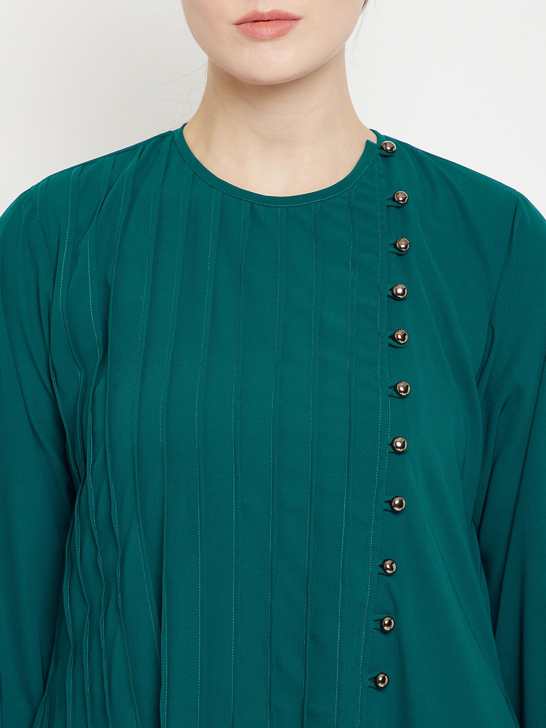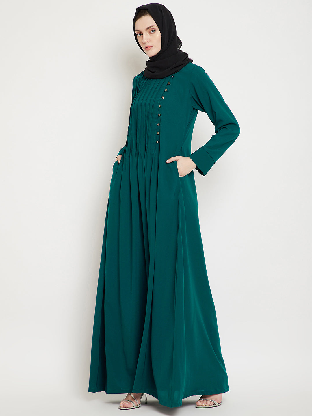Capture the essence of contemporary fashion in this bottle green abaya. The round neck and long sleeves abaya is crafted from a Nida Matte fabric. The buttons on the side along with pleats on the front, add a graceful flow to this garment.