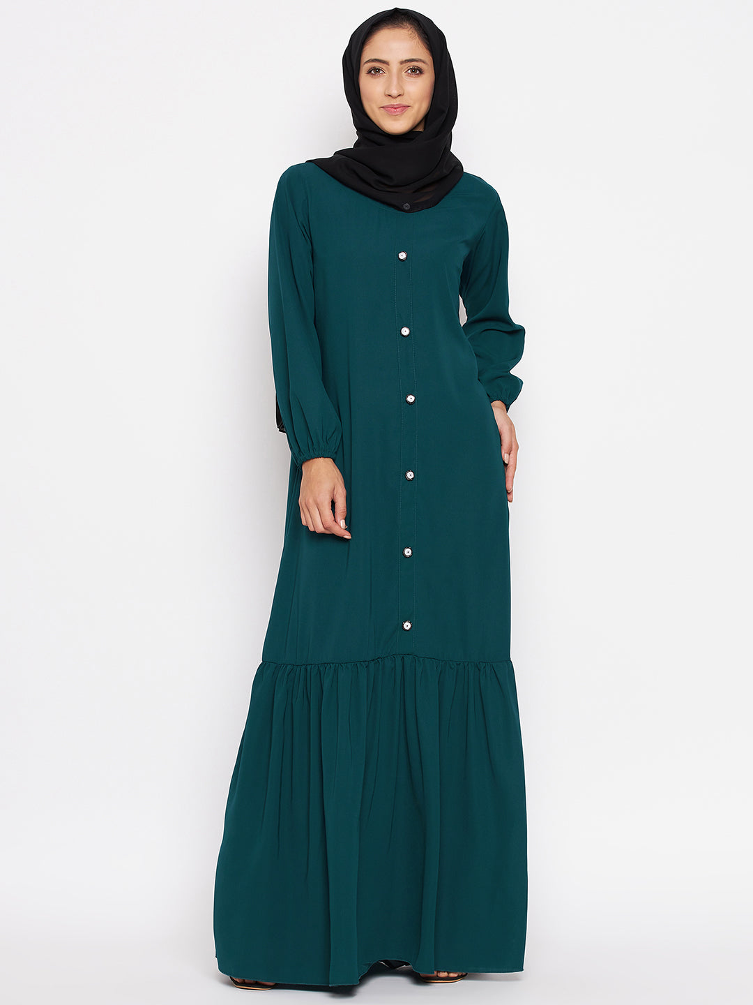 Nabia's Bottle Green Abaya for women is a stylish choice in luxurious Nida Matte fabric. With long sleeves featuring elastic for adjustment and front buttons for enhanced detailing, it combines fashion and comfort seamlessly. This abaya is ideal for modern Muslim women seeking a contemporary yet modest look.