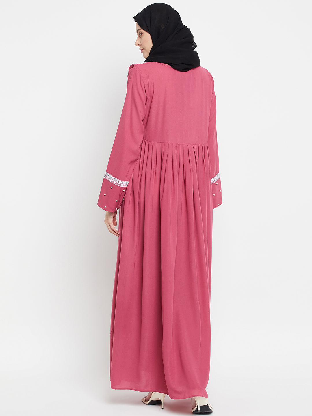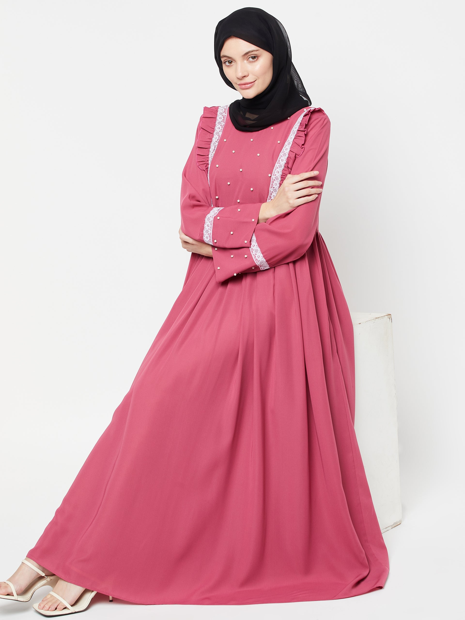 Step into elegance with this pink lace abaya dress, designed for Islamic and Muslim women. The round-neck and ruffle details exude sophistication, while the pearl design adds a touch of glamour. Tailored to perfection, this dress seamlessly combines tradition and fashion, making it ideal for a range of occasions