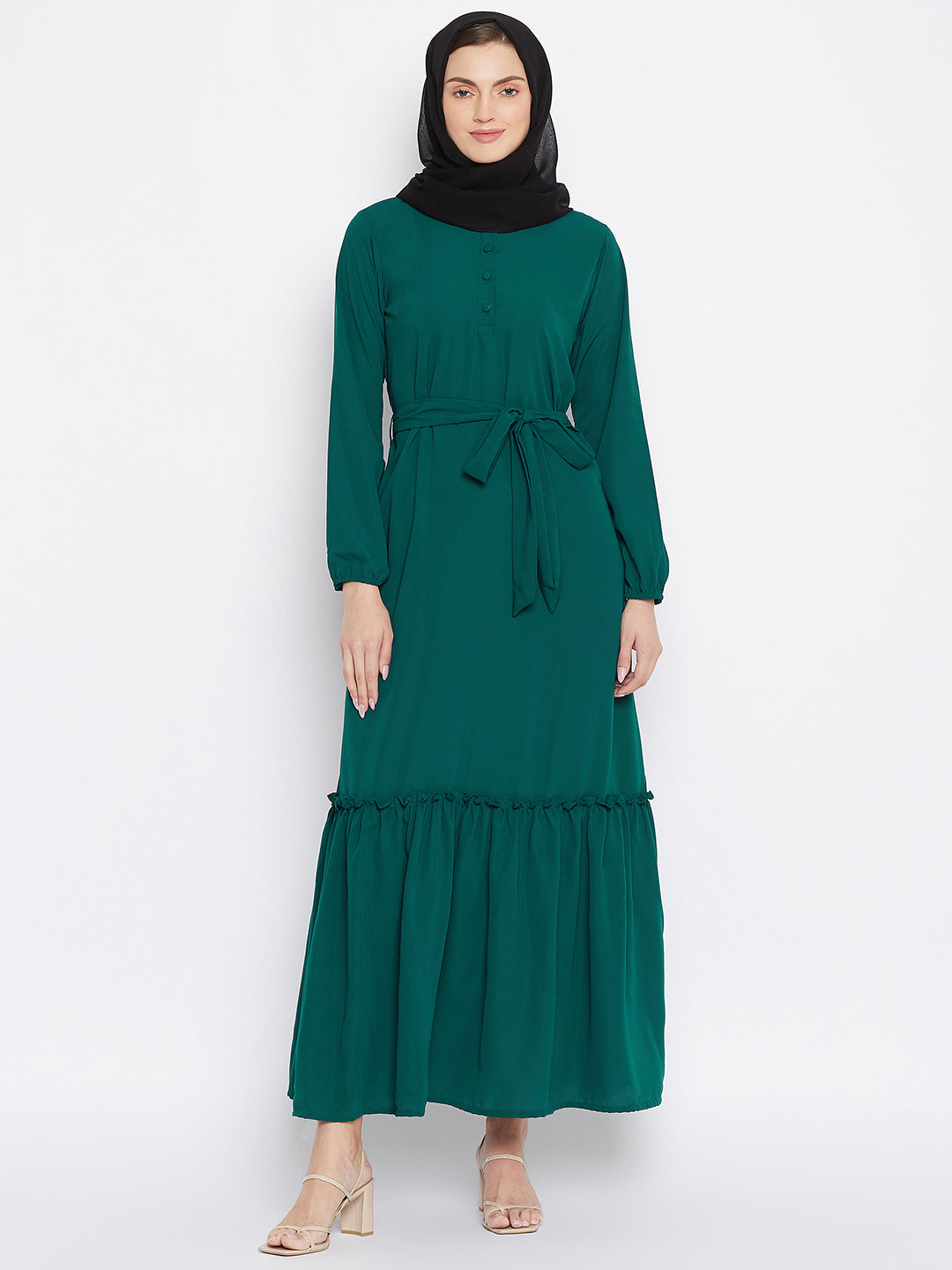 If you seek a solid Bottle Green Abaya go for this Abaya designed with frill detailing for a graceful look. For an added touch of elegance, it has been made in ‘Nida Matte’ fabric, long sleeves which have elastic adjustments to allow you to make them as you feel for. This Abaya has a waist belt so that you can adjust the breadth as and when you like in accordance with the place and weather. This adjusting belt would provide you with free movement and a sense of dressing to good fit.