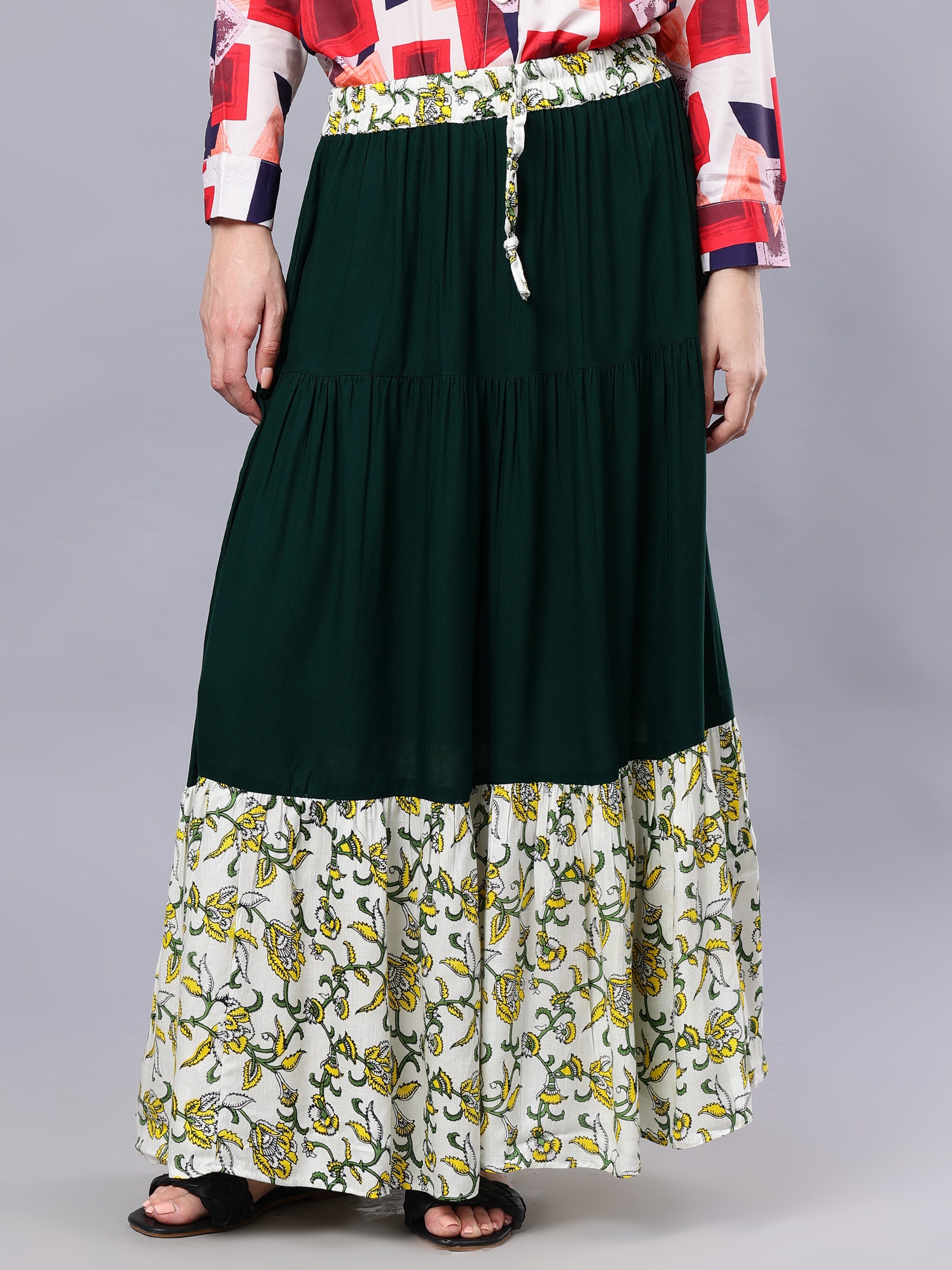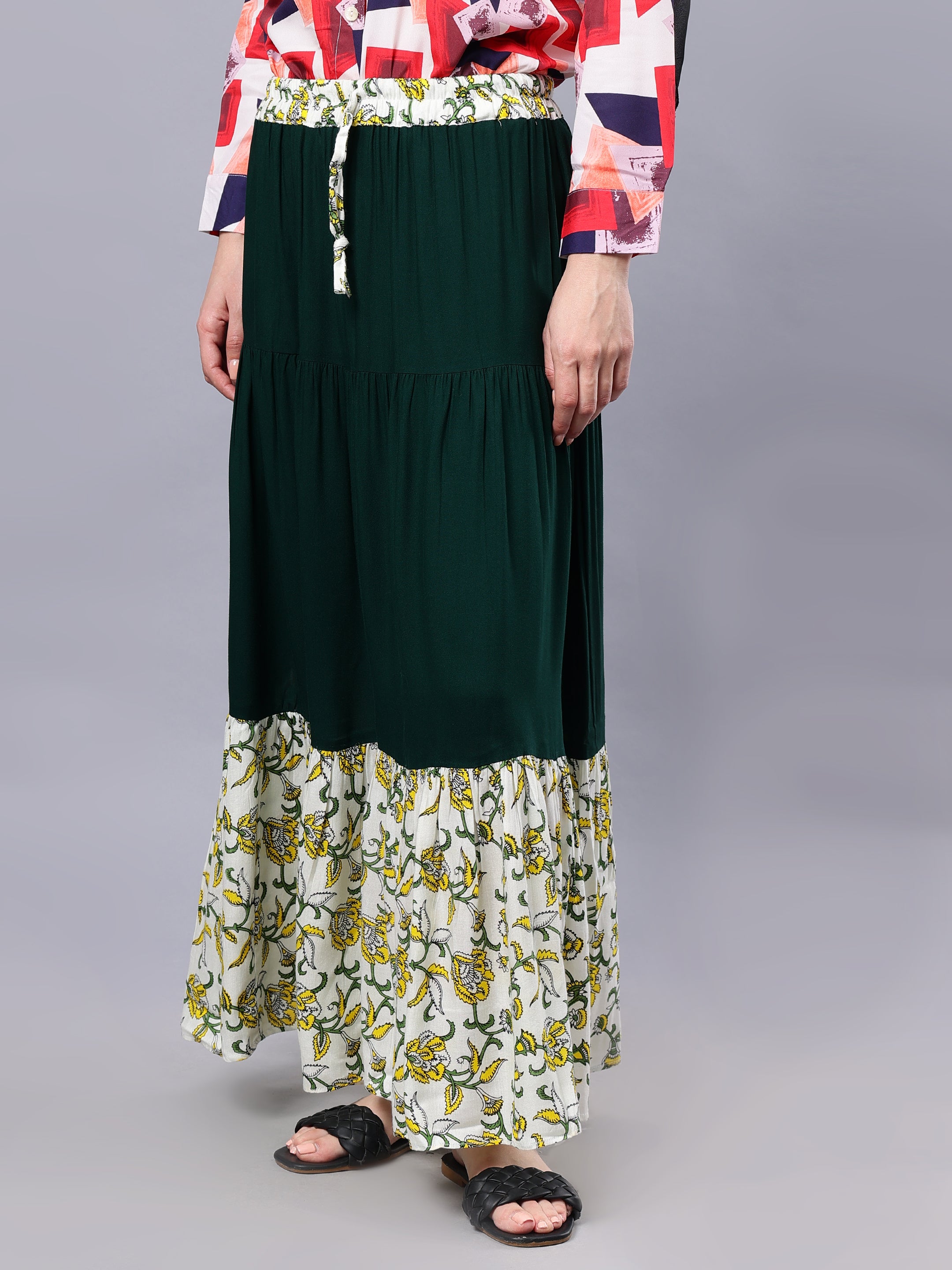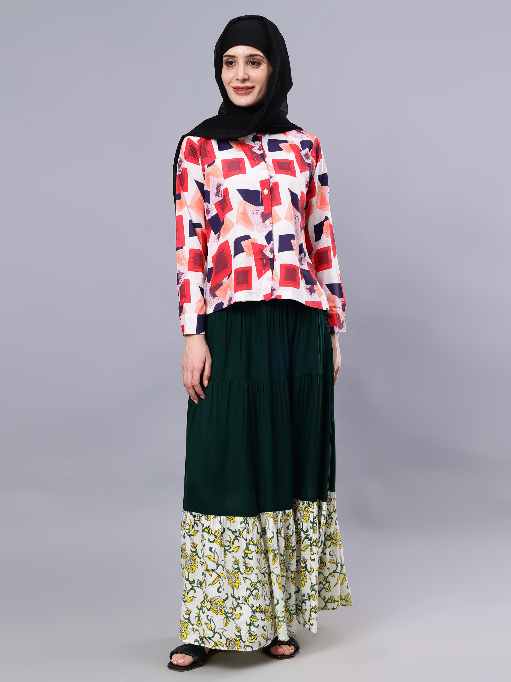 Elevate your wardrobe with our Nabia skirt in printed with solid bottle green. Crafted from comfortable polyester fabric, its drawstring closure ensures ease. Pair effortlessly with chic hijabs, tunics, shades, and favorite shoes for a glamorous, versatile ensemble that exudes timeless sophistication.