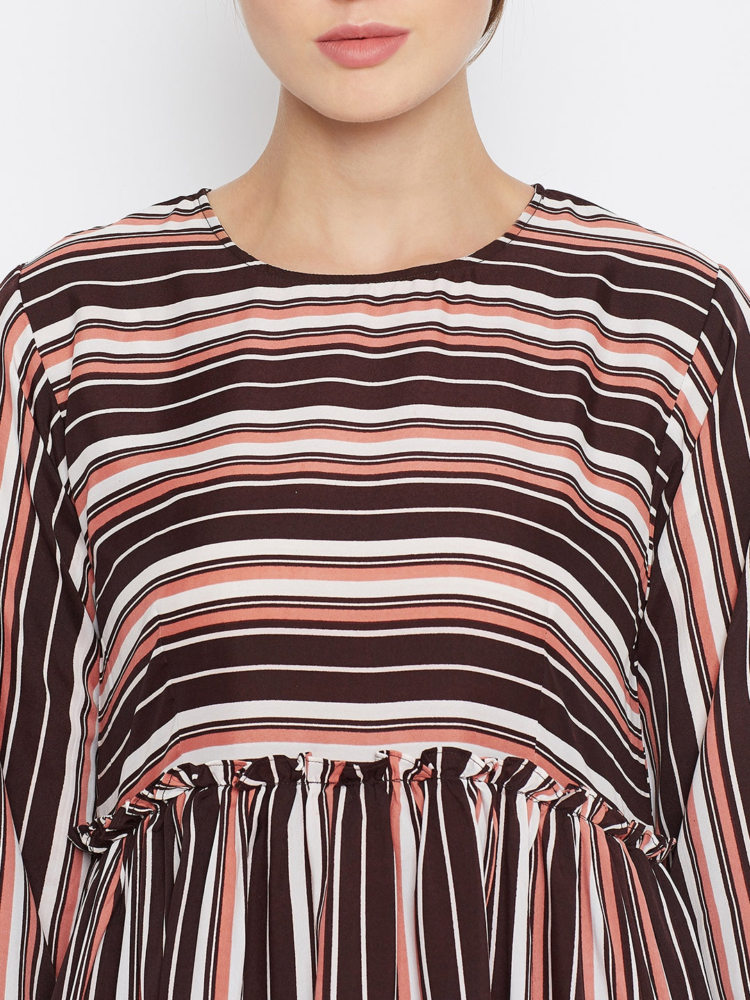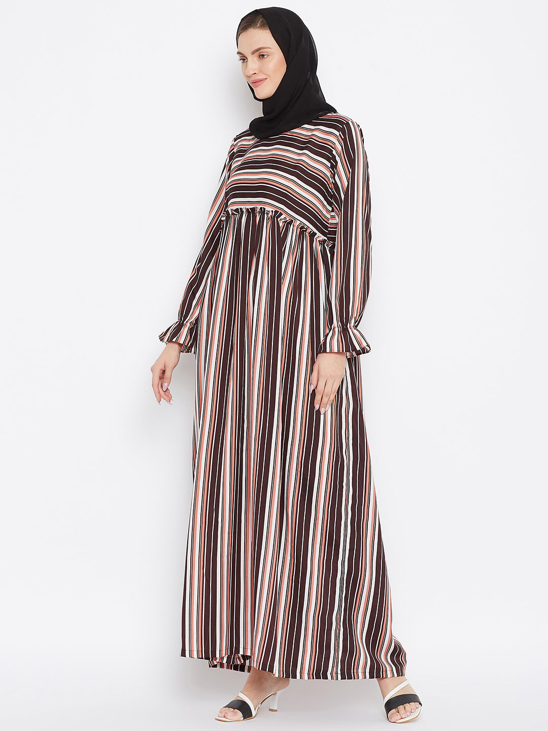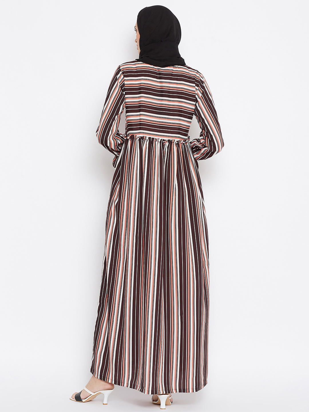 Nabia's Abaya Dress for women is crafted from Brown stripe crepe fabric, offering a perfect blend of style and comfort. Featuring long sleeves with elastic for adjustment, it provides a modest yet contemporary look. This abaya dress is an ideal choice for modern Muslim women seeking both fashion and practicality.