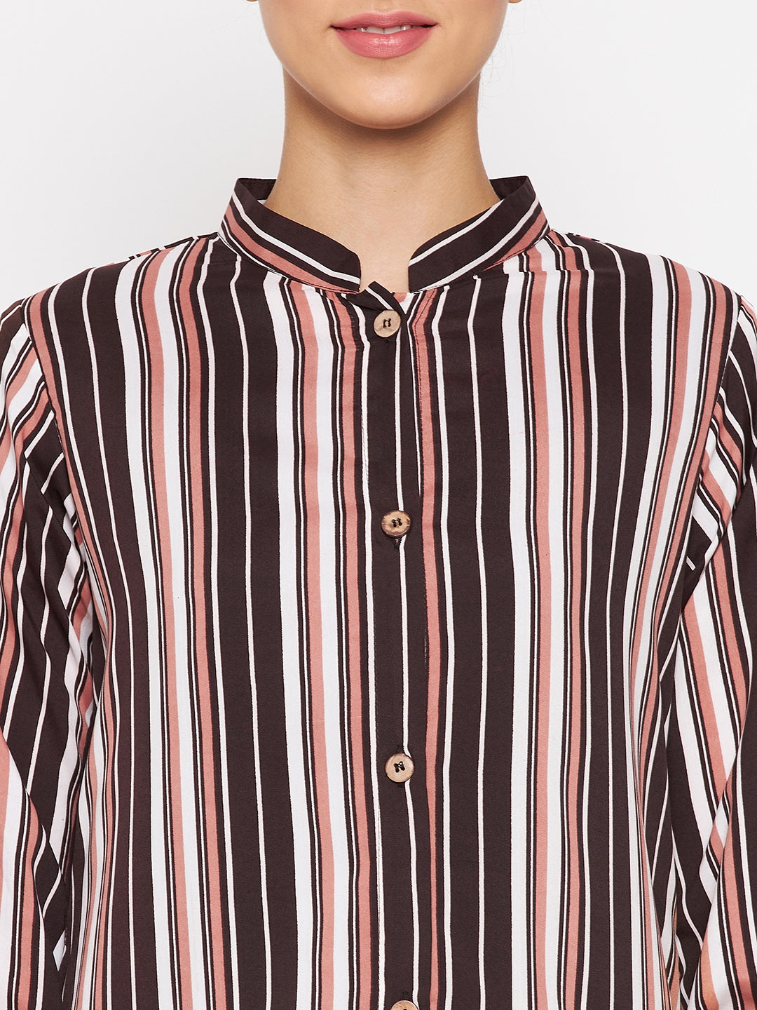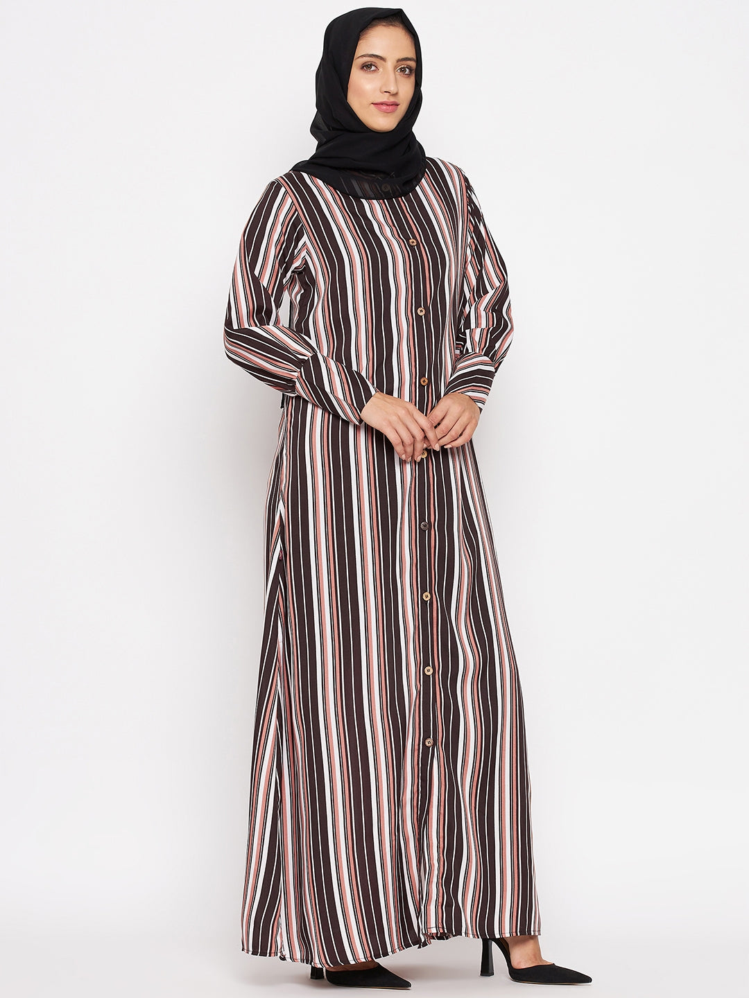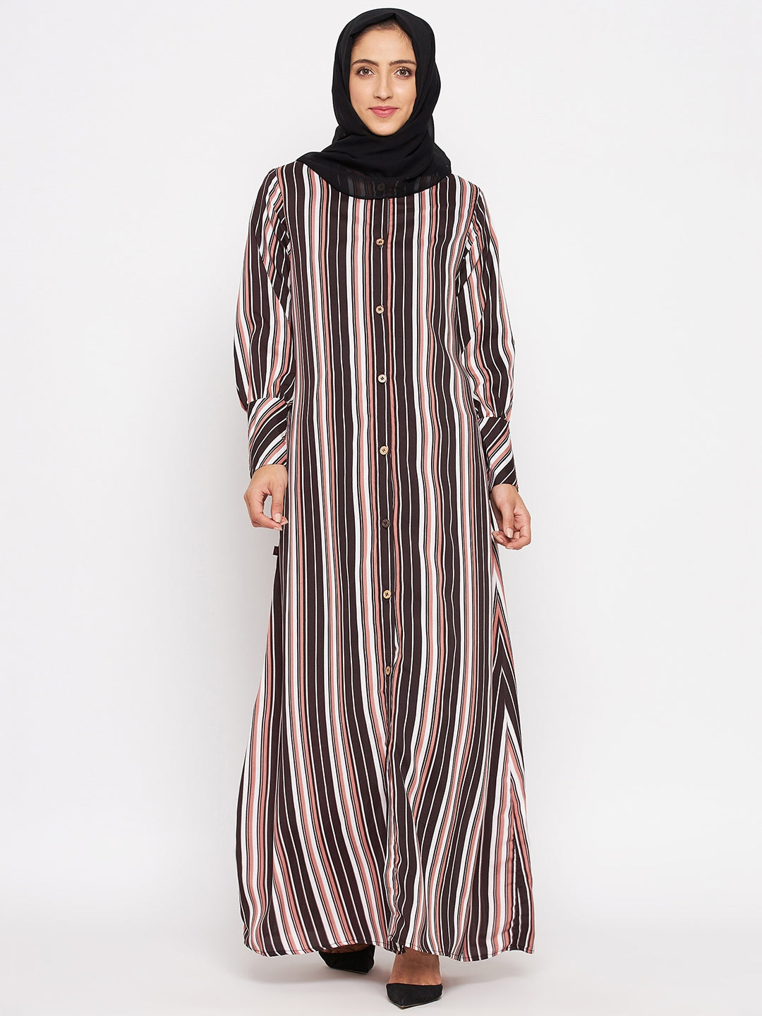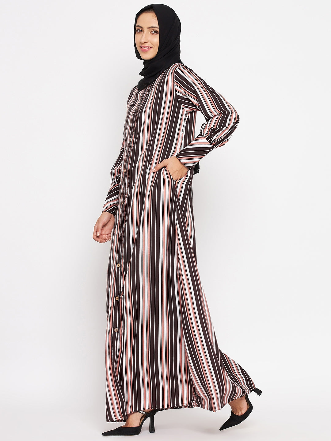 Stripes can never go out of trend. Nabia has a striped abaya design that is very highly appreciated that allows you to make a fashion statement wherever you go. This brown and black daily wear front open side pocket Abaya dress is an enduring addition to your wardrobe collection.