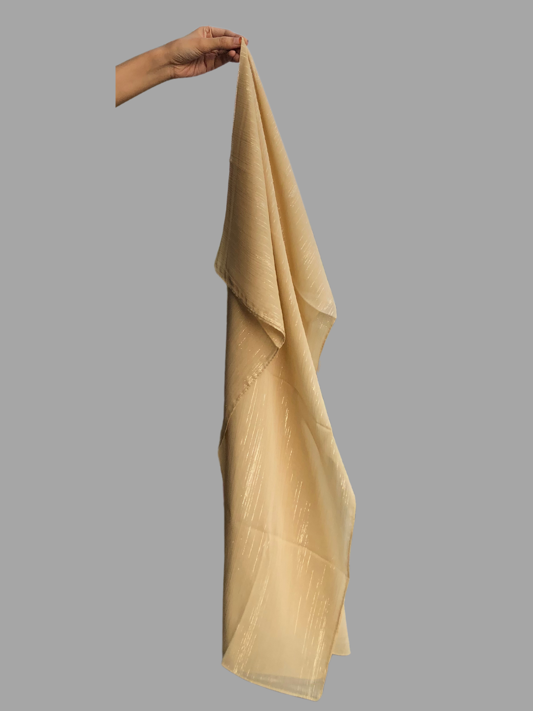 Elevate your look with our Chiffon Metallic Shimmer hijab. Crafted from lightweight chiffon fabric, this solid golden hijab adds a touch of glamour to any outfit. Comfortable for all-day wear, it's perfect for casual occasions when you want to shine.