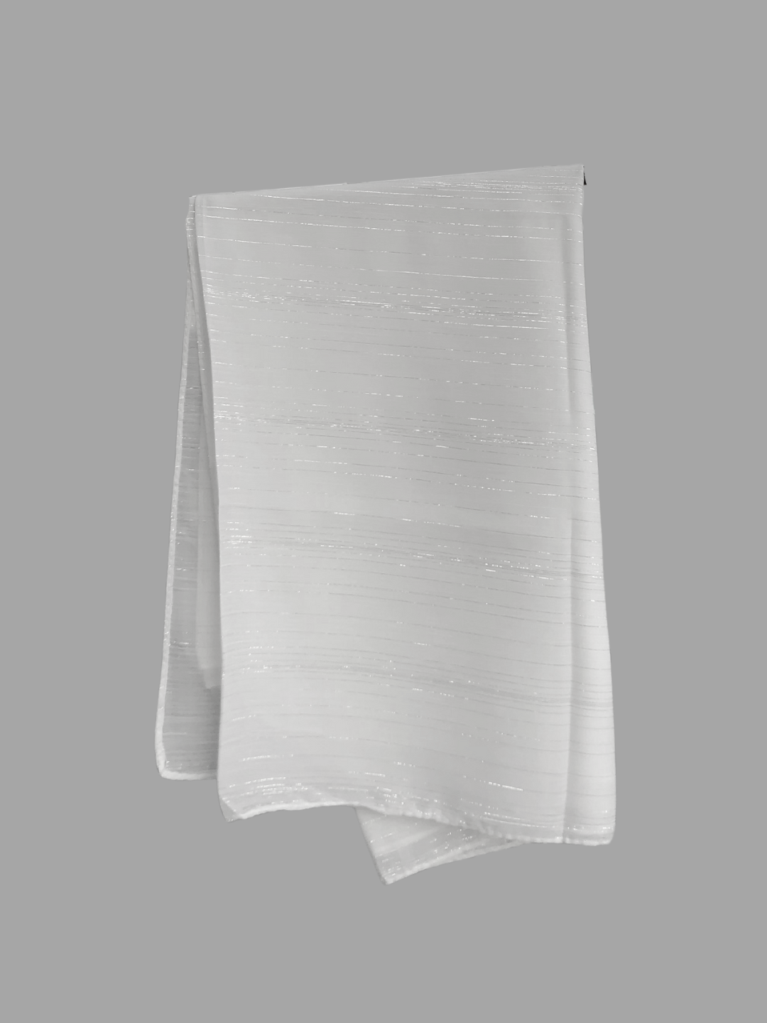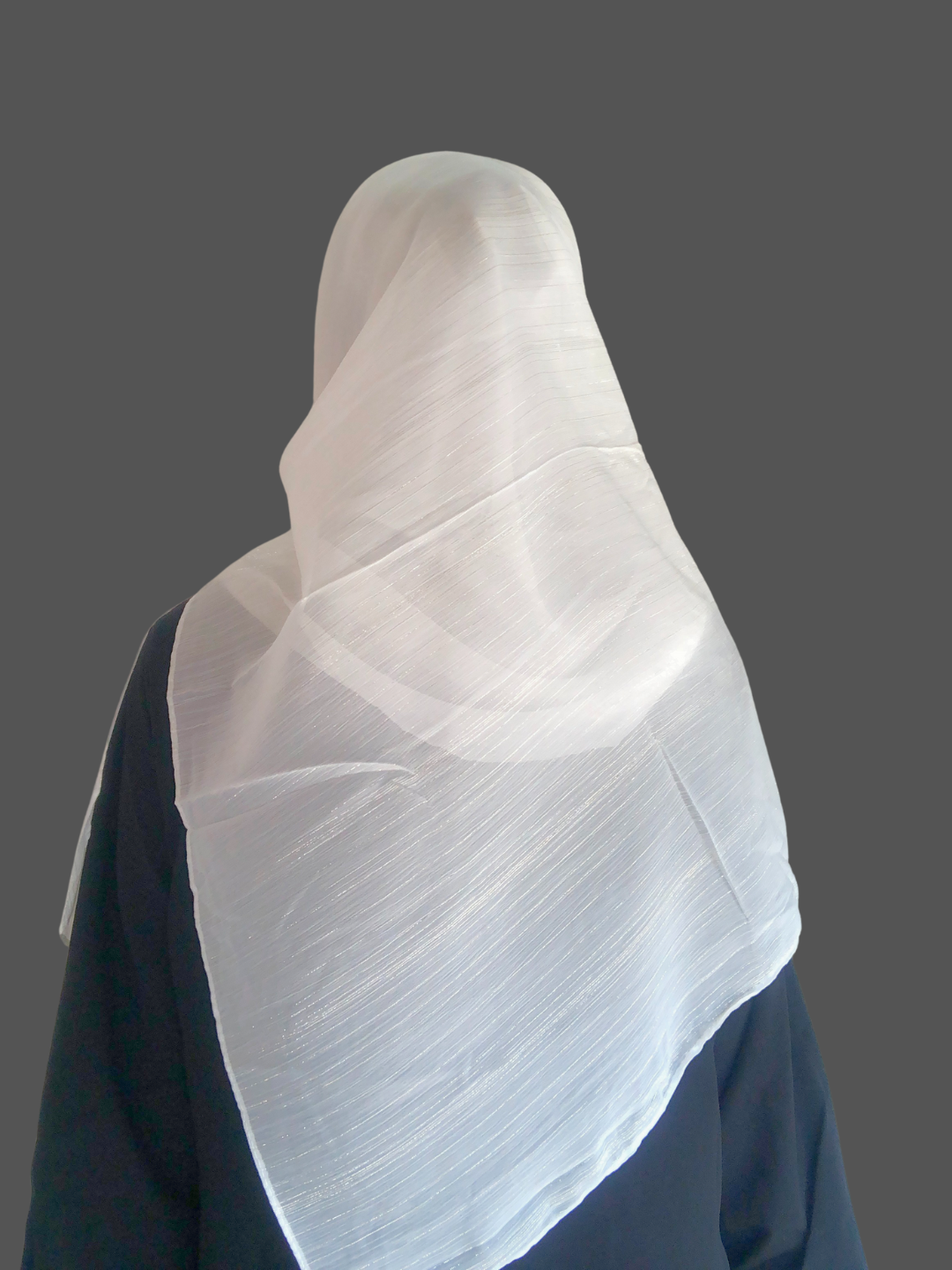 Elevate your look with our Chiffon Metallic Shimmer hijab. Crafted from lightweight chiffon fabric, this solid white hijab adds a touch of glamour to any outfit. Comfortable for all-day wear, it's perfect for casual occasions when you want to shine.