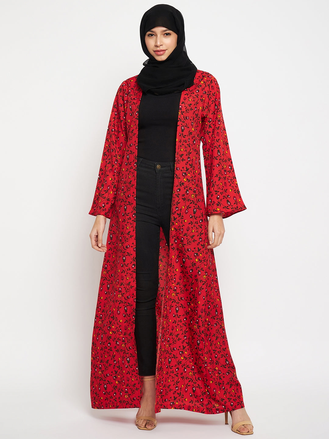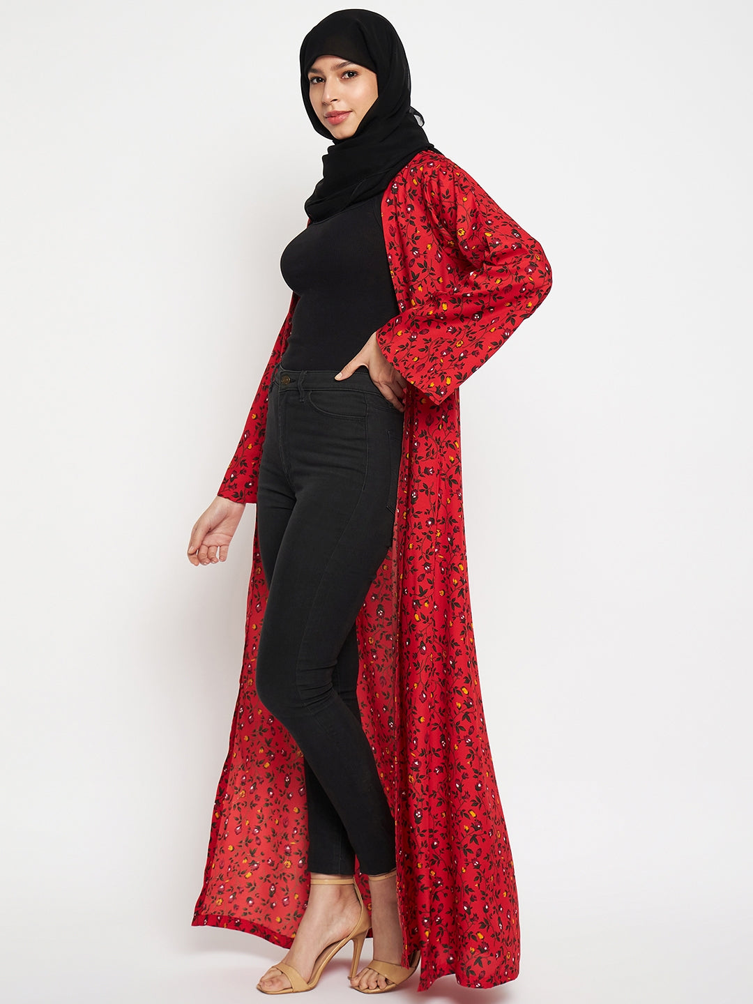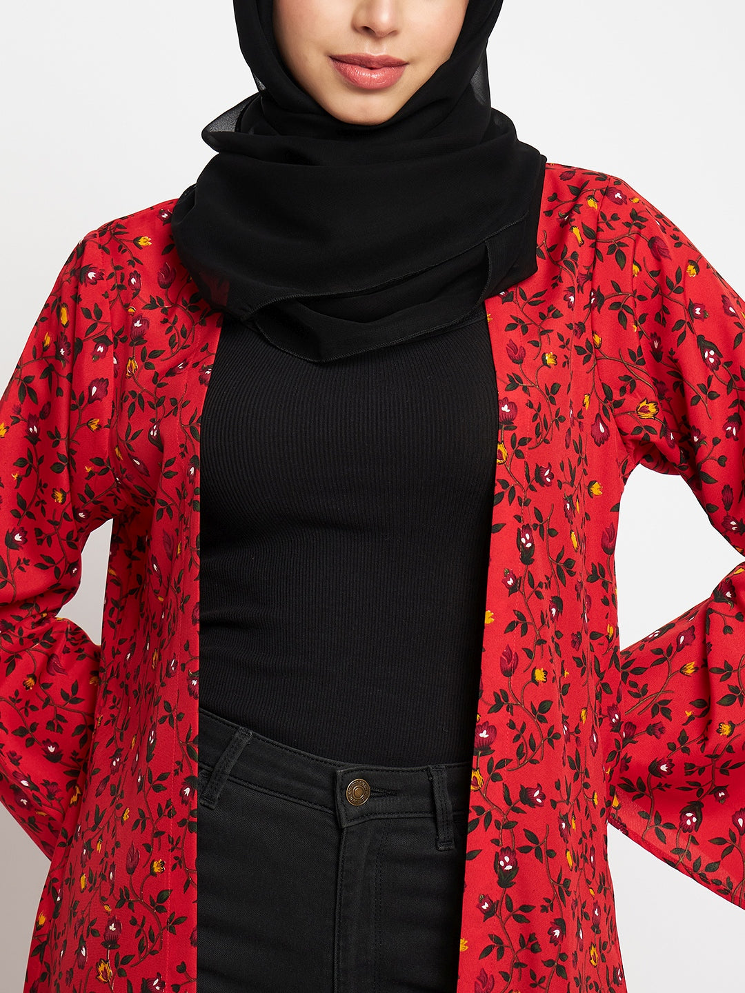 Introducing a vibrant Red Floral Printed Front Open Shrug, featuring long and free sleeves, a round neck, and a loose fit. Crafted from crepe fabric, it provides a relaxed and comfortable feel, tailored for Islamic and Muslim women, adding a stylish touch to your wardrobe for various occasions.