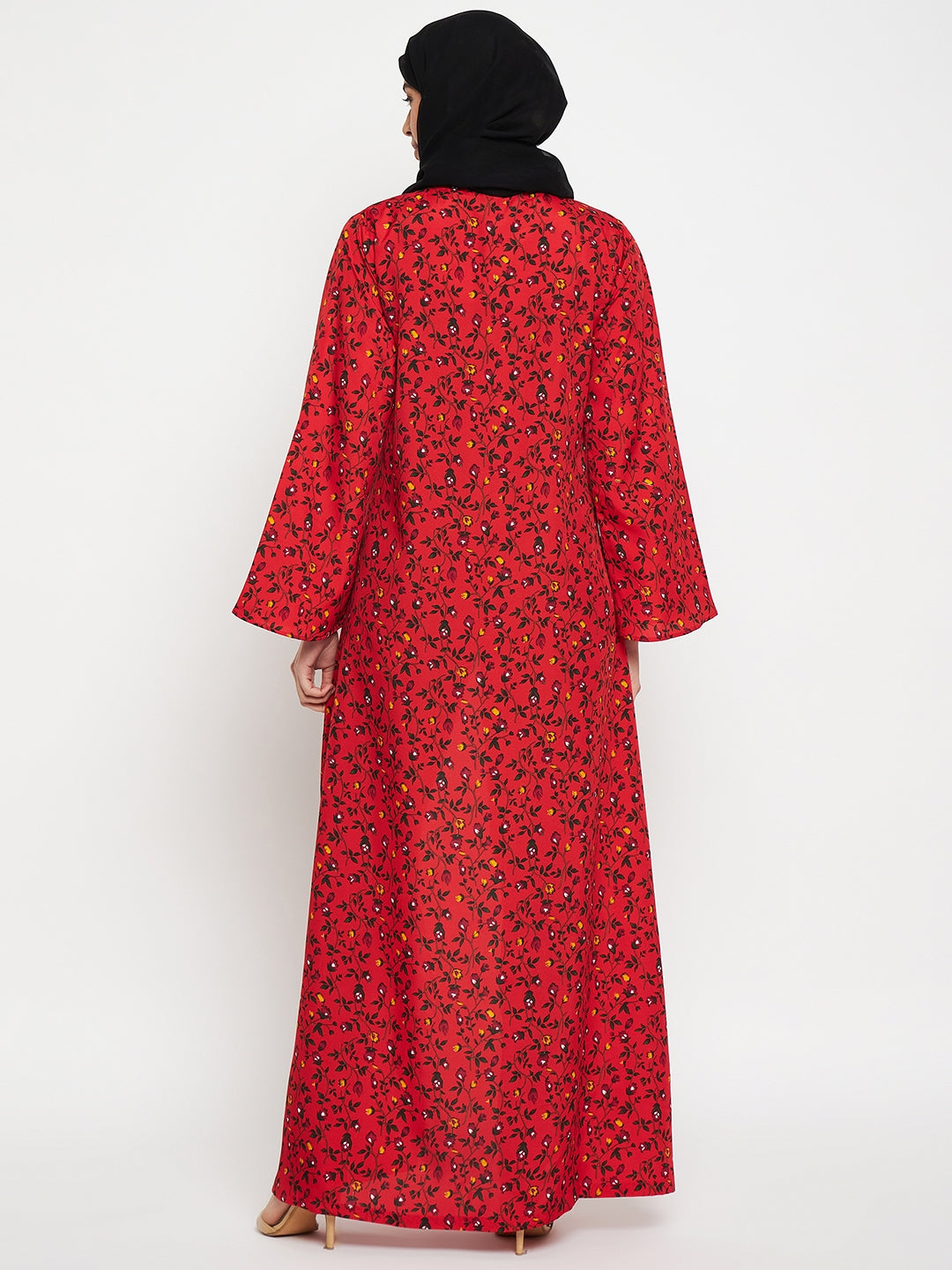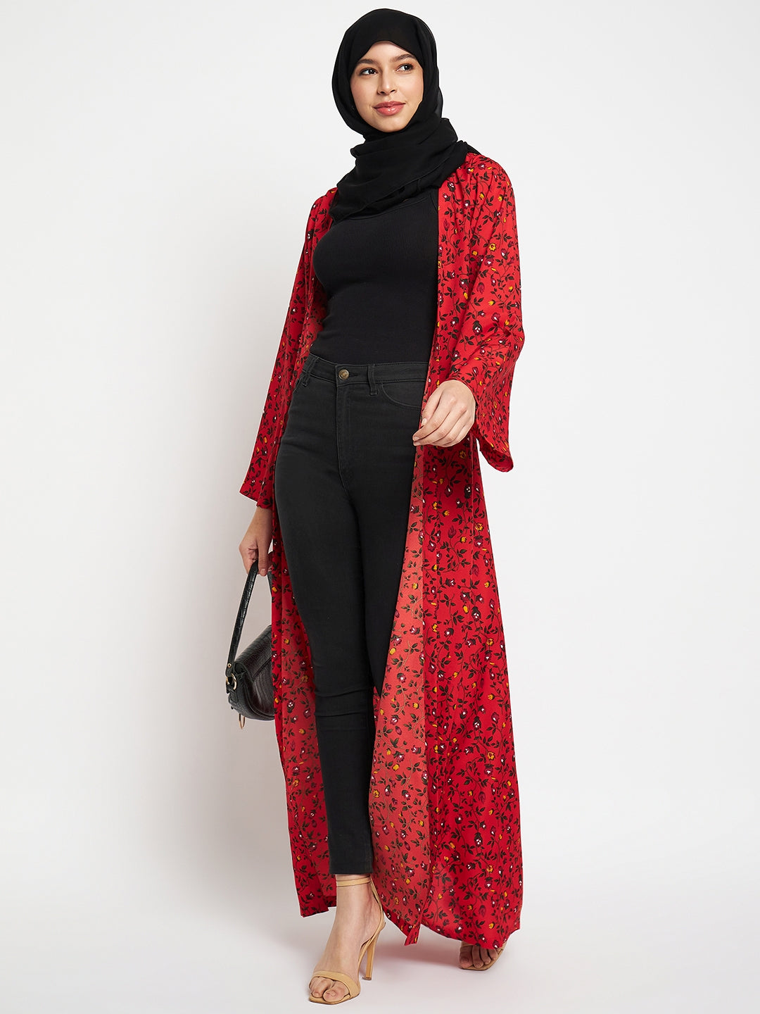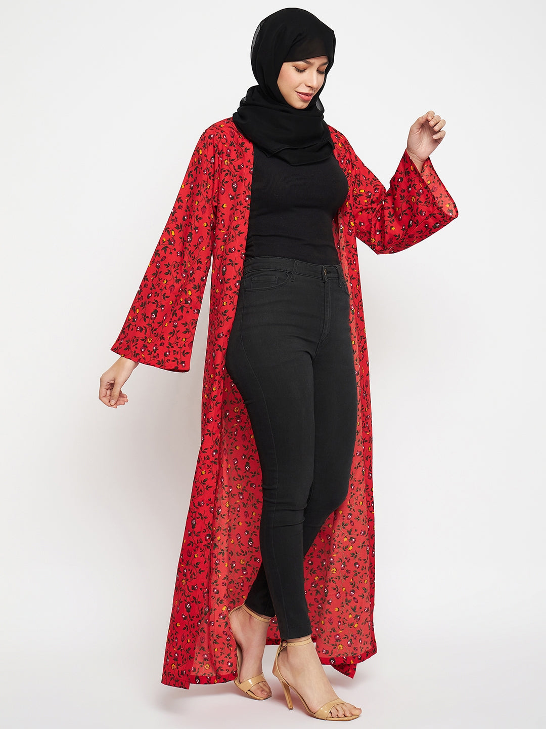 Introducing a vibrant Red Floral Printed Front Open Shrug, featuring long and free sleeves, a round neck, and a loose fit. Crafted from crepe fabric, it provides a relaxed and comfortable feel, tailored for Islamic and Muslim women, adding a stylish touch to your wardrobe for various occasions.
