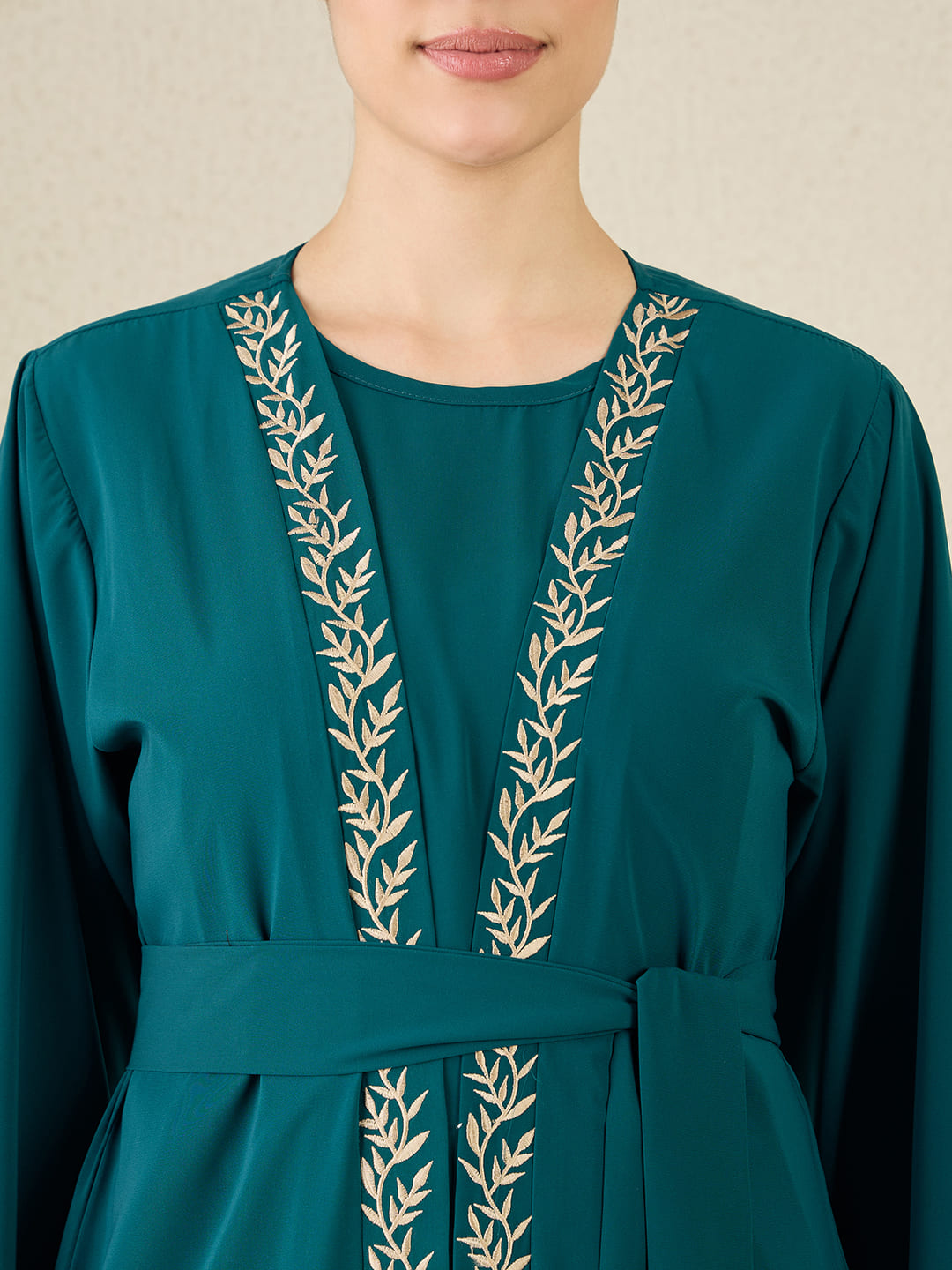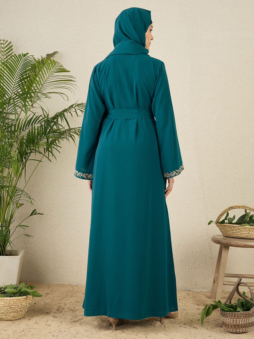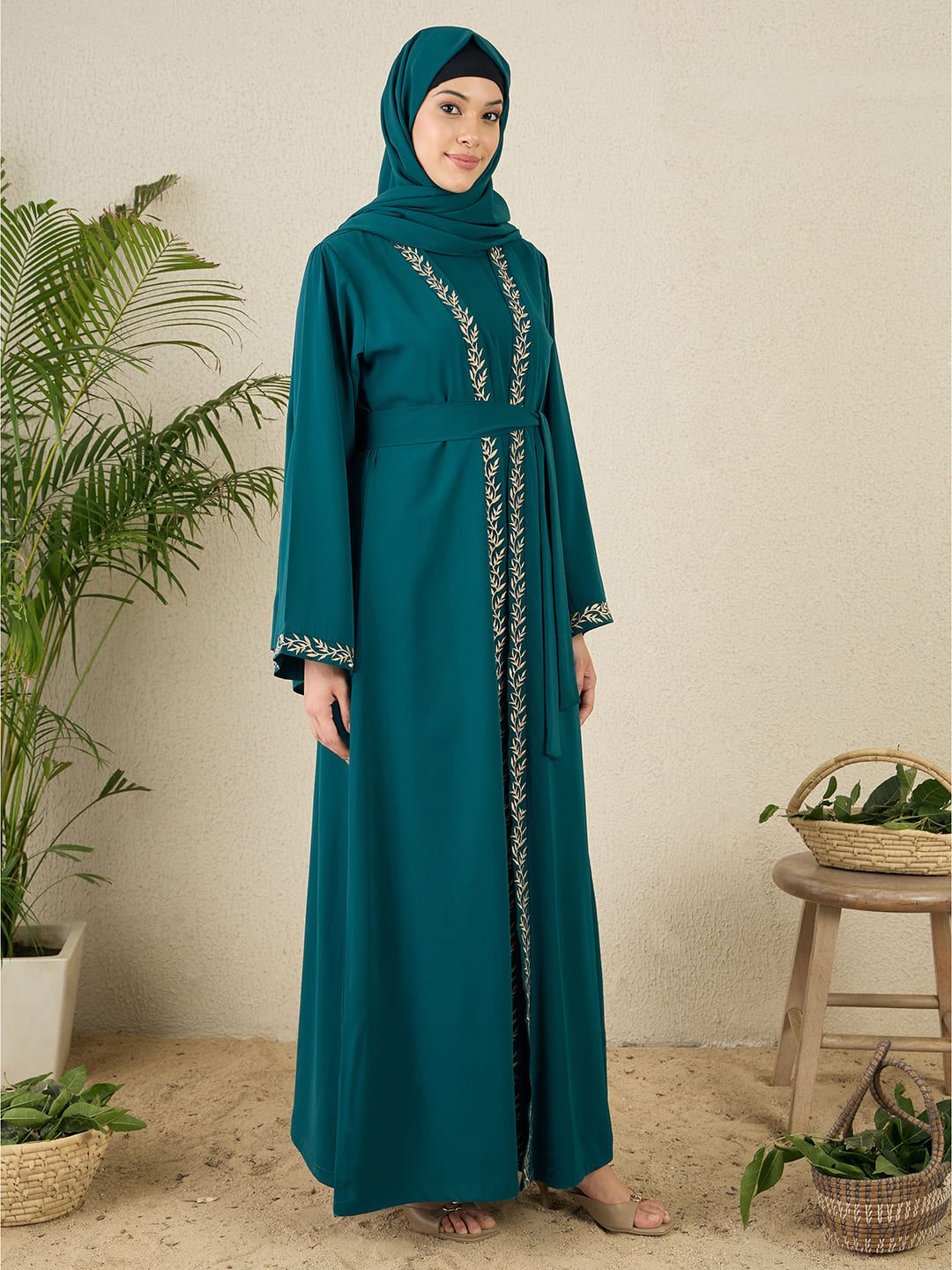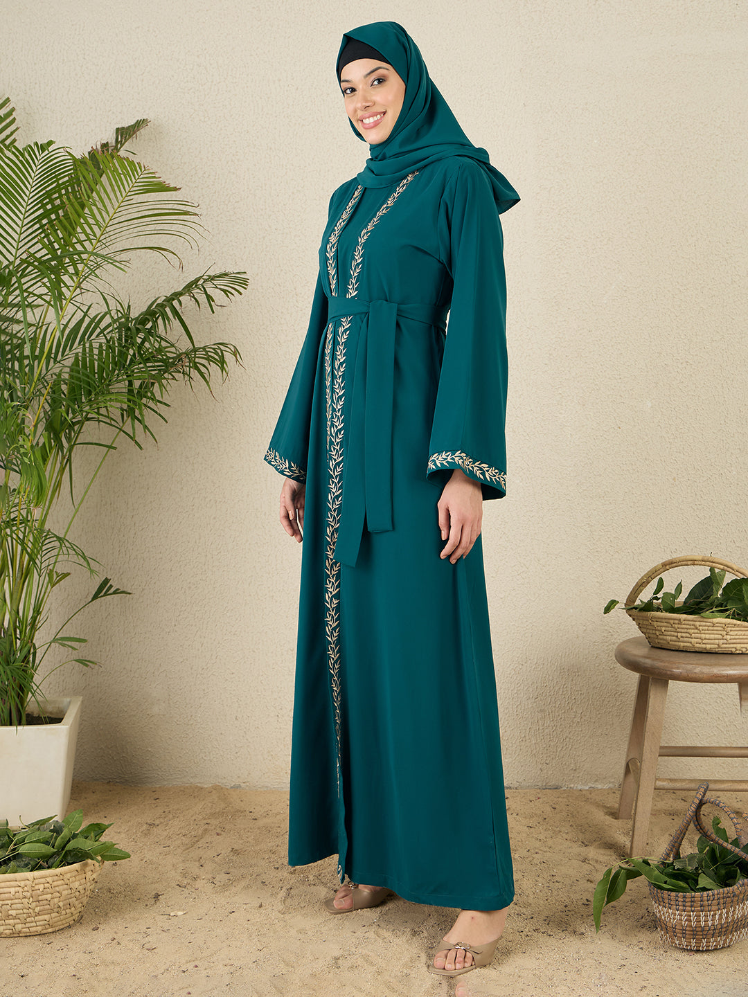 This elegant bottle green shrug set abaya, crafted from premium nida matte fabric, offers a perfect blend of modesty and modern fashion. The relaxed fit ensures comfort, while the intricate embroidery on the shrug adds a refined touch. Paired with a matching inner, this versatile set is ideal for both casual and special occasions, elevating your modest wardrobe with sophistication.