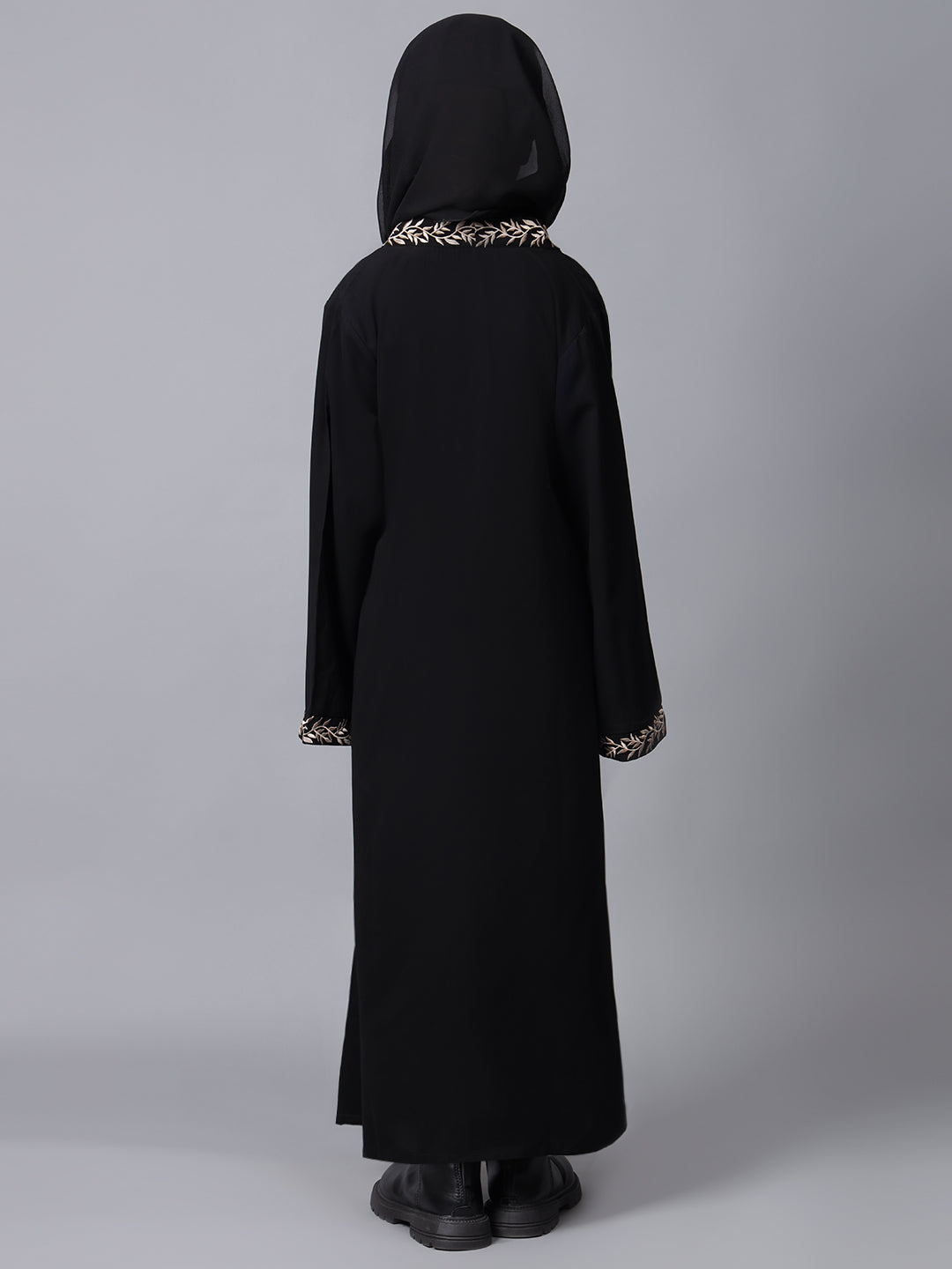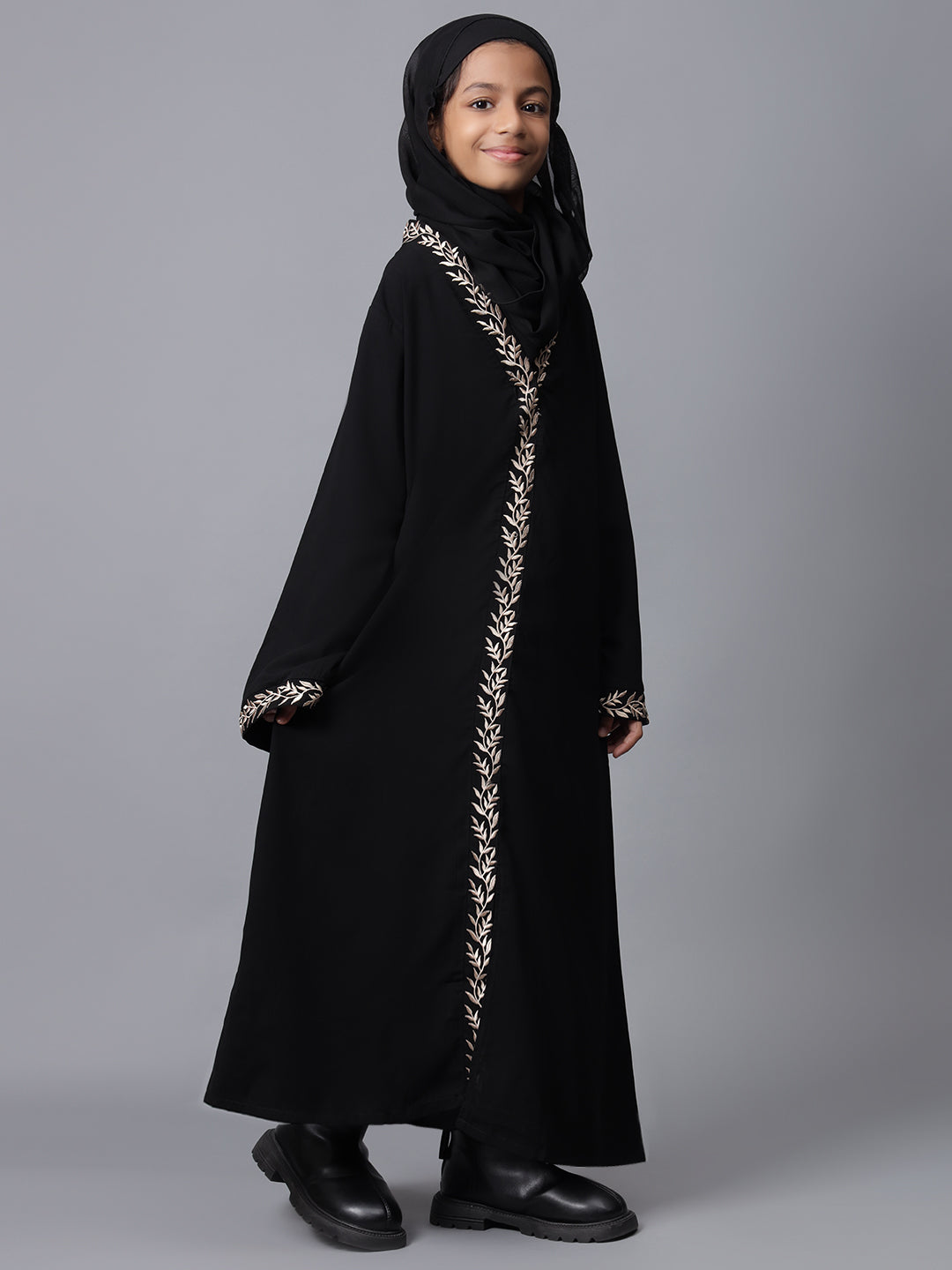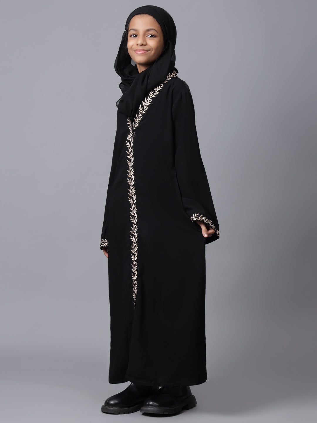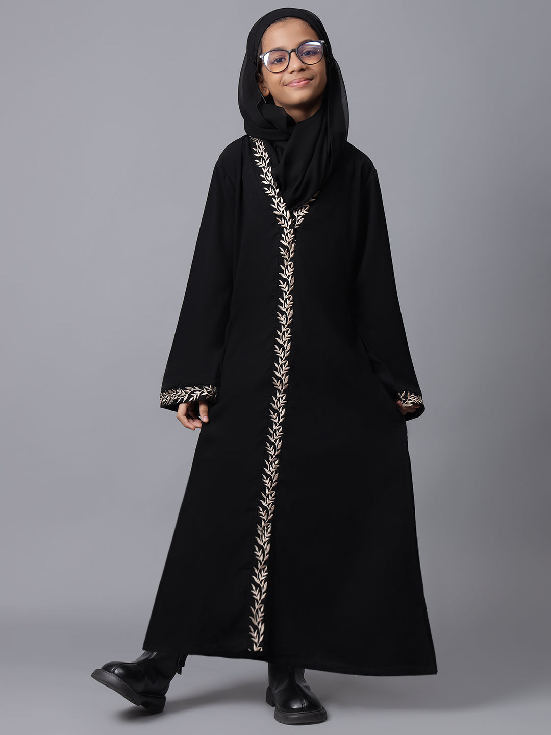 This black abaya for Muslim and Islamic girls boasts intricate embroidery on the front, neck, and sleeves. Featuring bell sleeves and a solid design, it offers a modern yet modest look. Perfect for the latest trends, this abaya blends elegance with functionality, providing an attractive and stylish choice for any occasion.