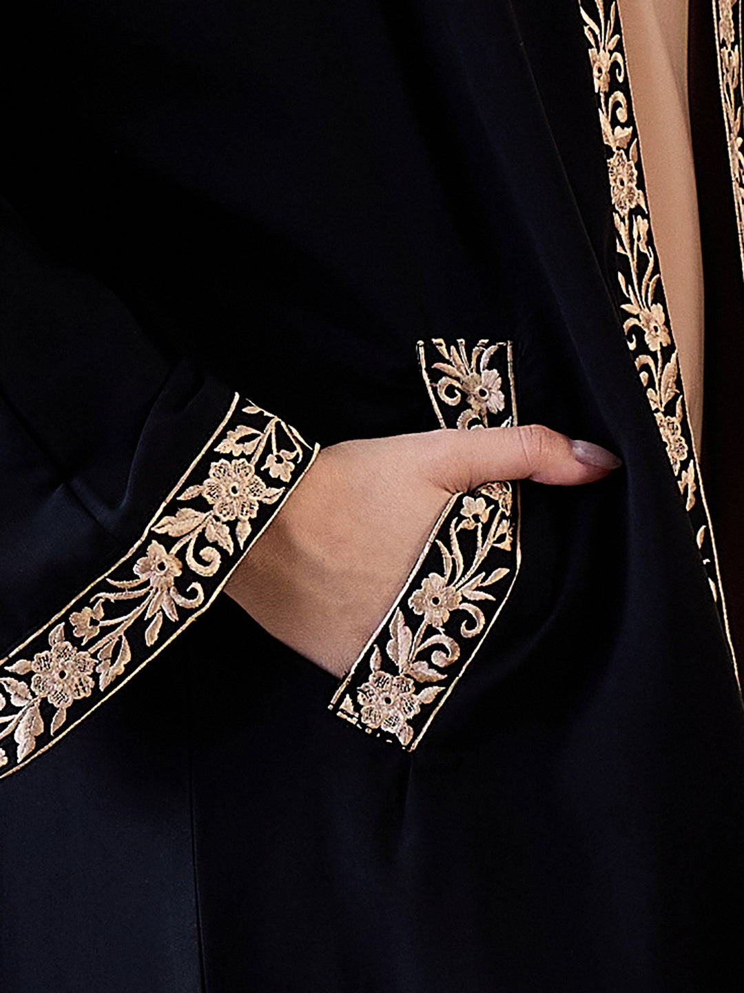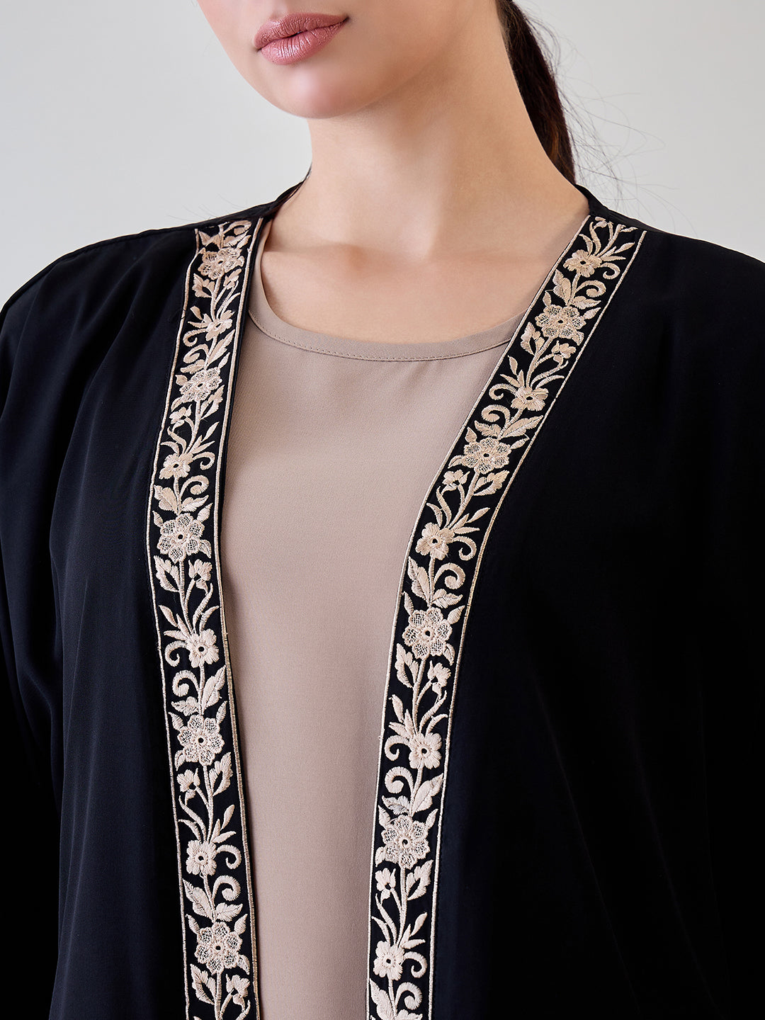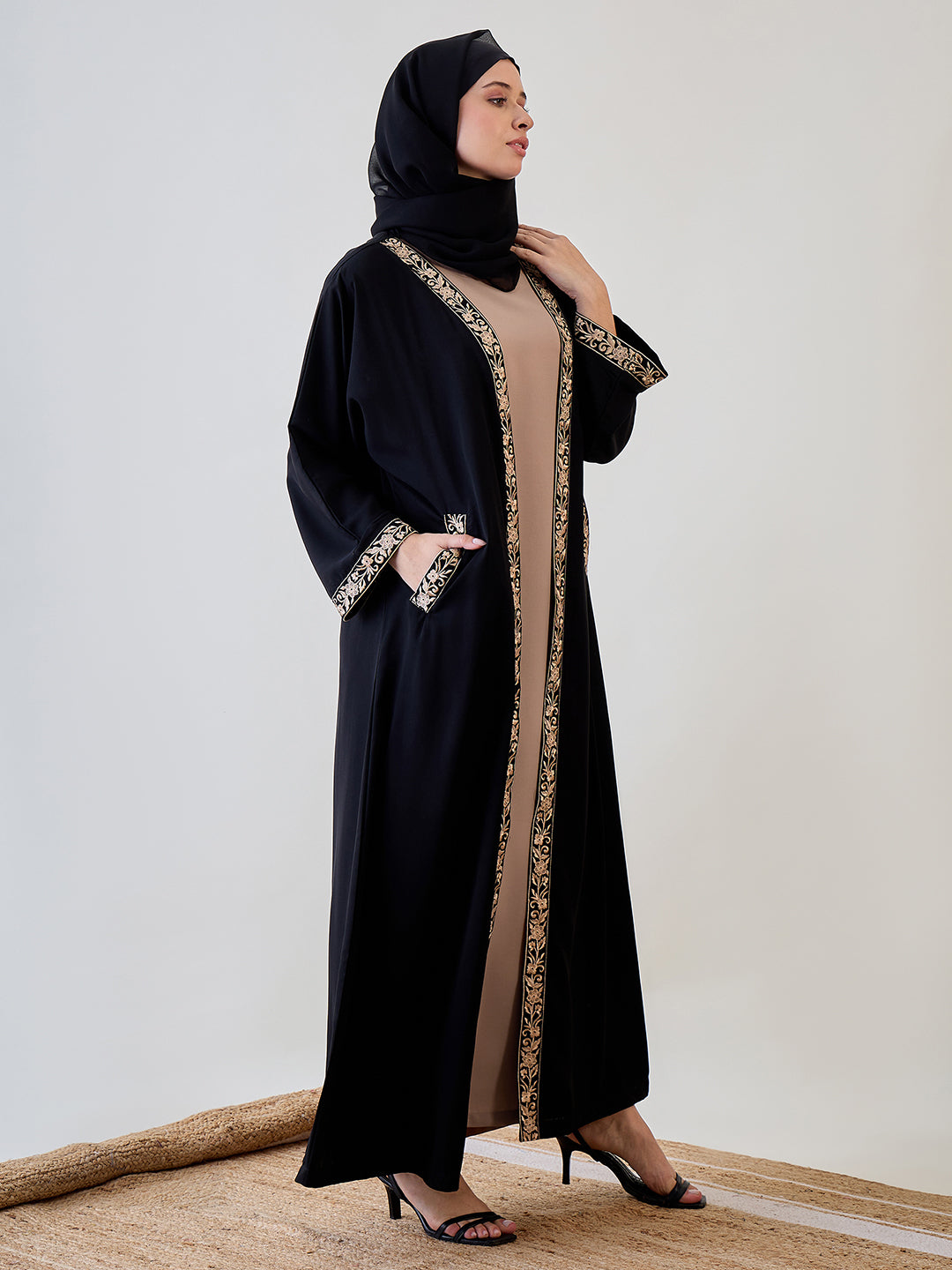 This elegant embroidered black shrug abaya burqa for Muslim women, paired with a beige inner, combines style and modesty effortlessly. With a relaxed fit and contemporary design, it ensures comfort while exuding grace. Perfect for Islamic wear, this sophisticated shrug adds a modern yet modest touch to your wardrobe, making it an ideal choice for any occasion, from casual outings to special events.