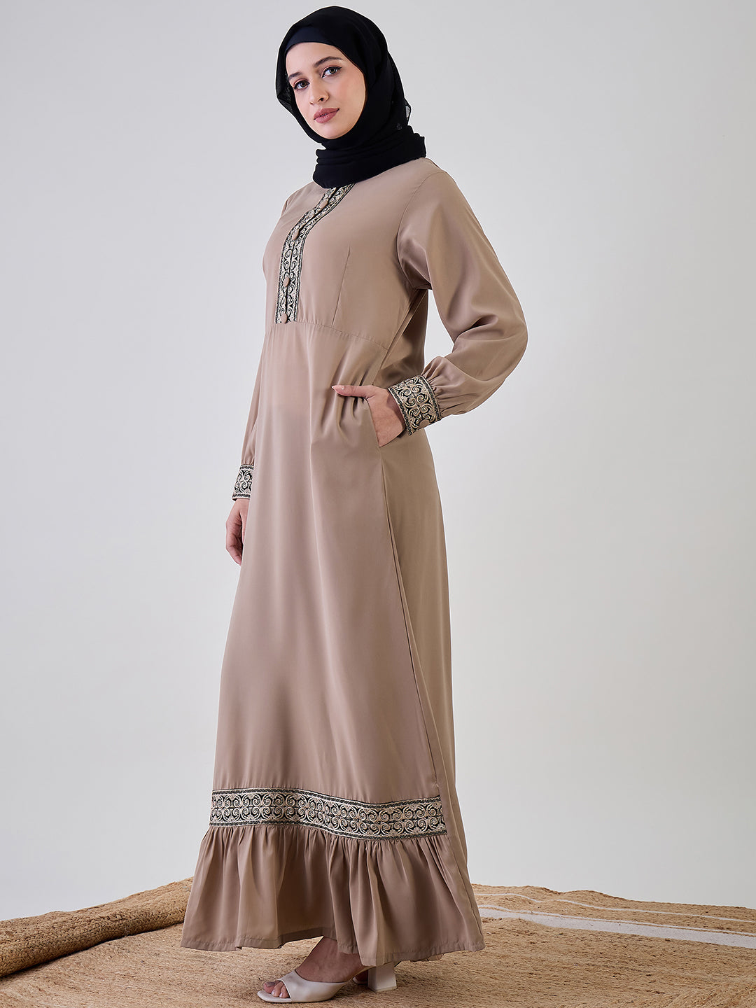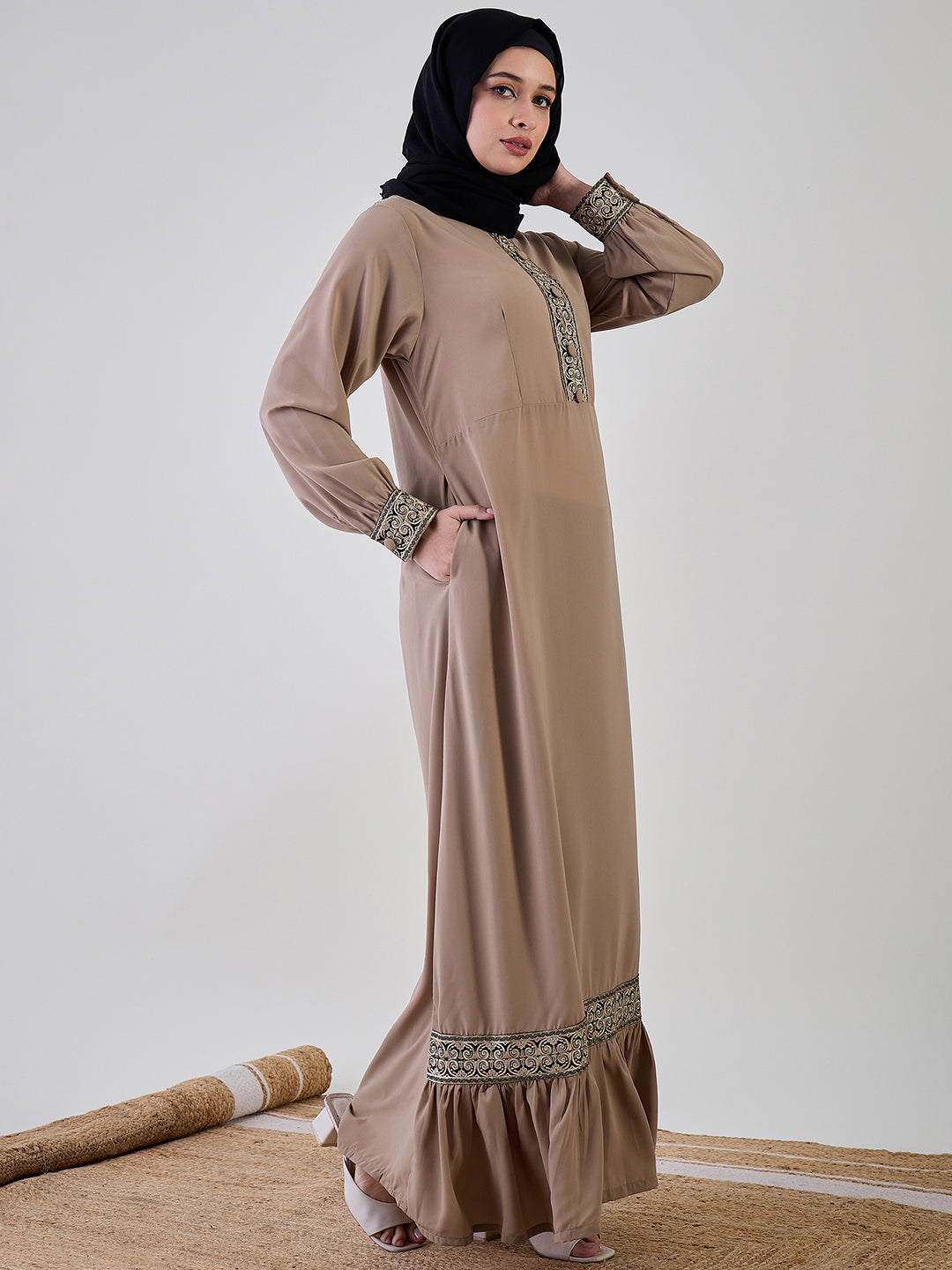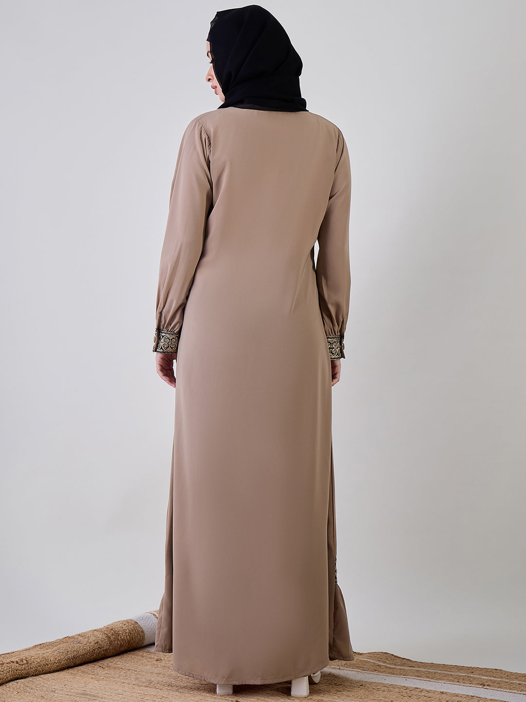 This embroidered beige abaya burqa, crafted from luxurious soft Nida Matte fabric, is a refined choice for modern Muslim women. Featuring stylish cuffed sleeves, practical side pockets, and intricate embroidery, it combines timeless elegance with everyday functionality. Perfect for any occasion, this abaya offers a sophisticated look, seamlessly blending modest fashion with contemporary design for a graceful and versatile appeal.