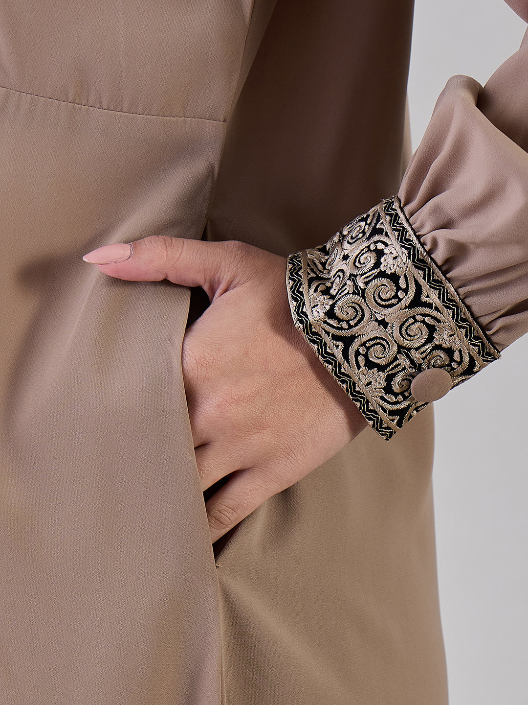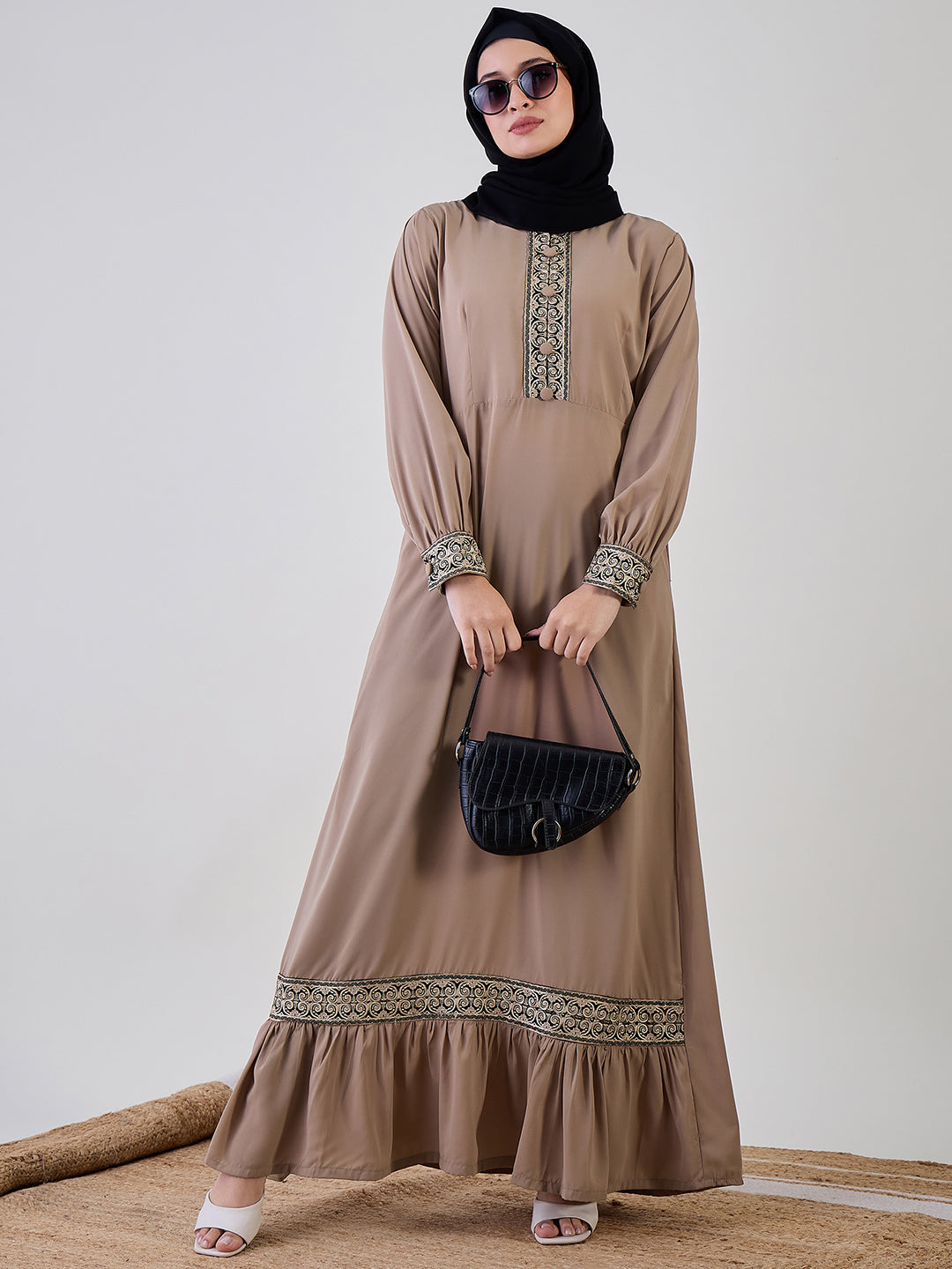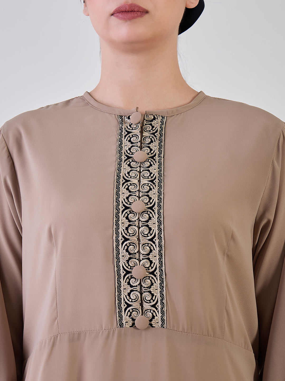 This embroidered beige abaya burqa, crafted from luxurious soft Nida Matte fabric, is a refined choice for modern Muslim women. Featuring stylish cuffed sleeves, practical side pockets, and intricate embroidery, it combines timeless elegance with everyday functionality. Perfect for any occasion, this abaya offers a sophisticated look, seamlessly blending modest fashion with contemporary design for a graceful and versatile appeal.