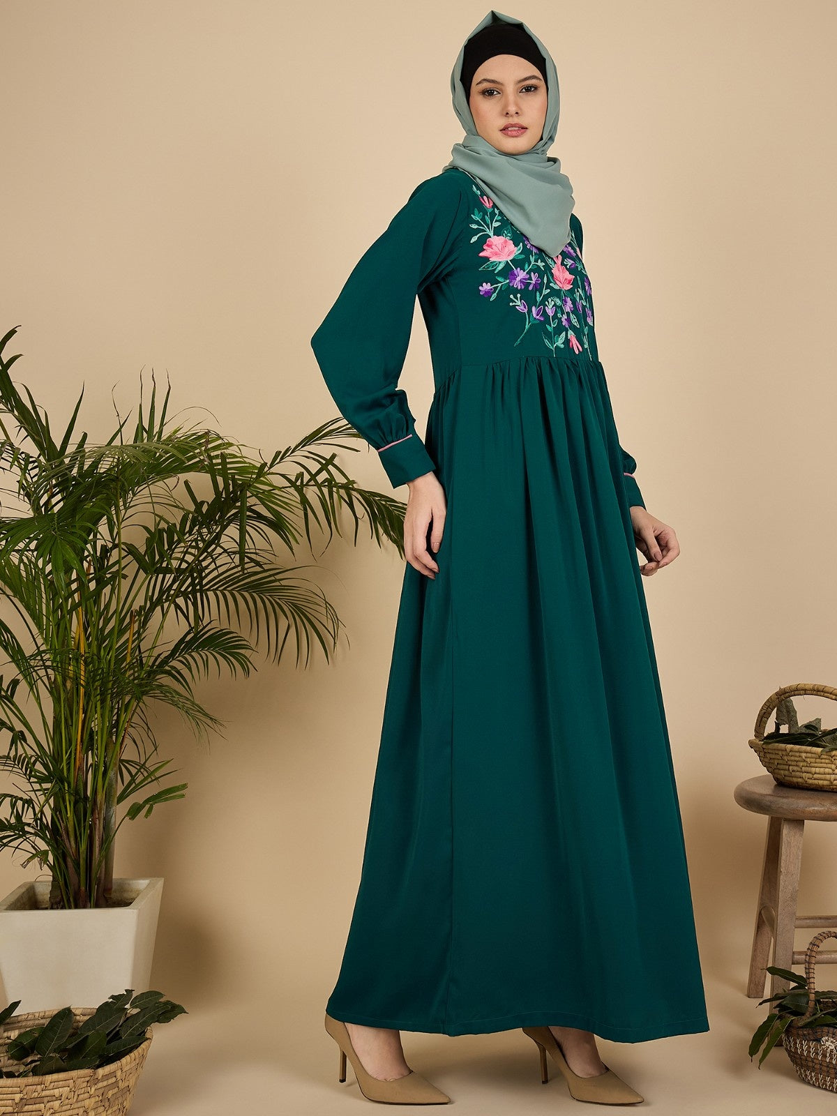 This modest bottle green embroidered abaya is beautifully designed for Muslim and Islamic women who value elegance with full coverage. Crafted from premium Nida matte fabric, it offers a soft, lightweight, and flowy feel for ultimate comfort. Adorned with delicate floral embroidery on the chest and long sleeves with cuffs, it features a relaxed A-line silhouette that enhances grace and movement, making it perfect for daily wear, gatherings, or special occasions.