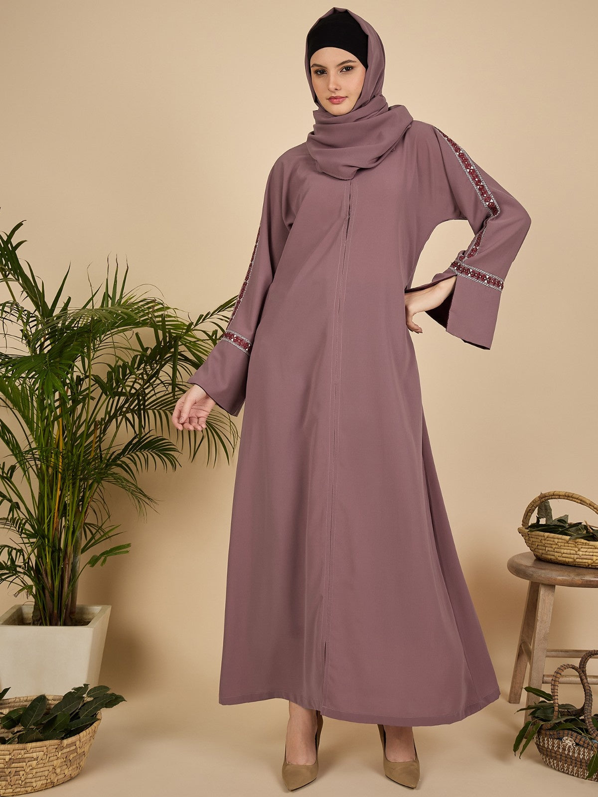 Enhance your modest style with this puce pink embroidered abaya burqa for women, crafted for Muslim and Islamic women who value elegance and comfort. Made from premium Nida matte fabric, it features beautiful embroidery on the sleeves and refined detailing for a graceful look. The bell long sleeves, secure button closure, and relaxed fit ensure ease and all-day comfort. Perfect for daily wear, prayer, gatherings, and special occasions, this modest embroidered abaya blends fashion with timeless modesty.