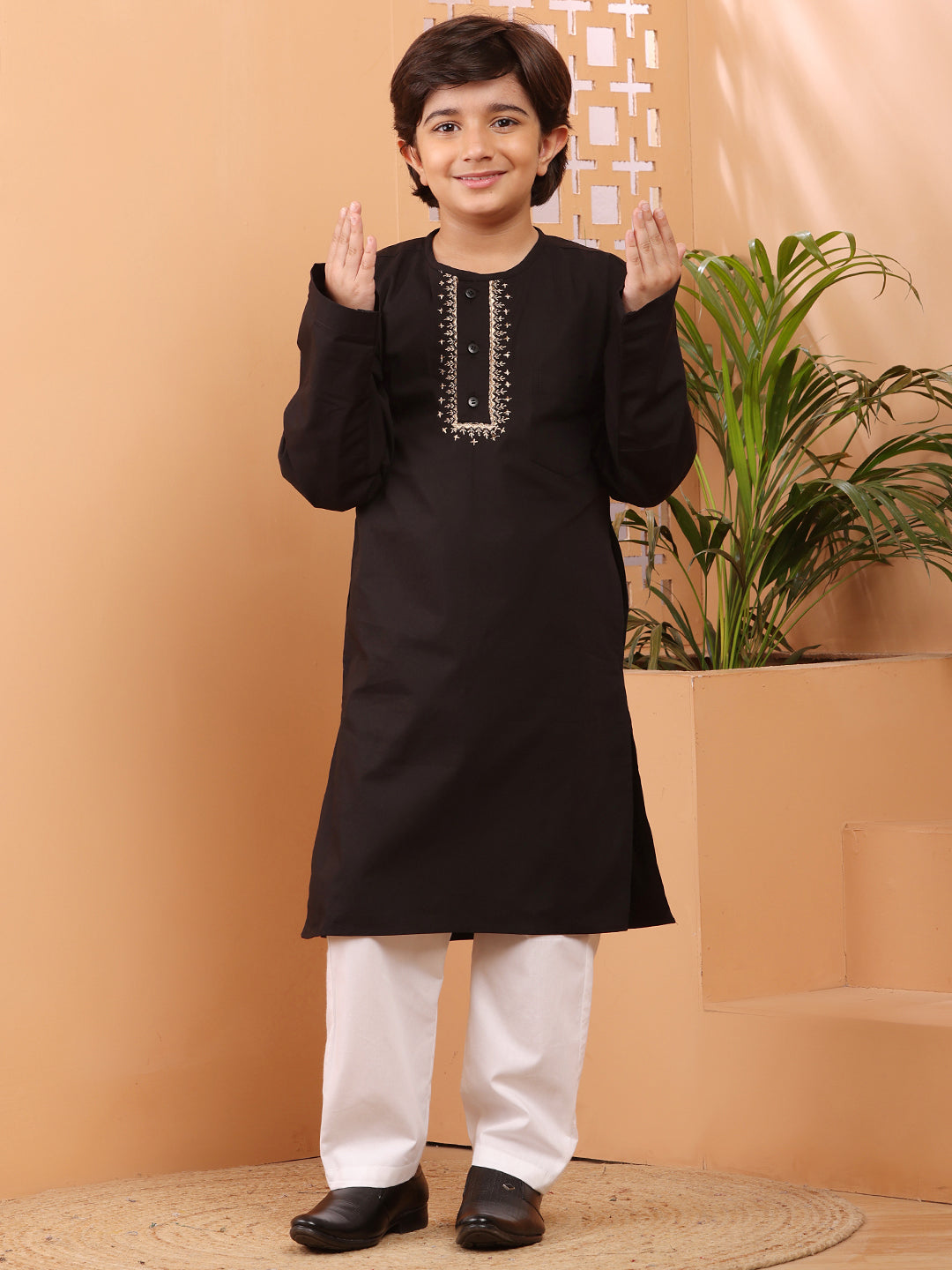 This boy’s black embroidery kurta and white pajama set combines elegance and comfort for a stylish look. Crafted from soft cotton, the kurta features a sophisticated round neck and a solid design, perfect for both formal and casual settings. Its simple yet refined style includes three front buttons and functional side pockets for convenience. Paired with an elasticated slip-on pajama, this outfit ensures ease of wear, making it ideal for relaxed occasions.