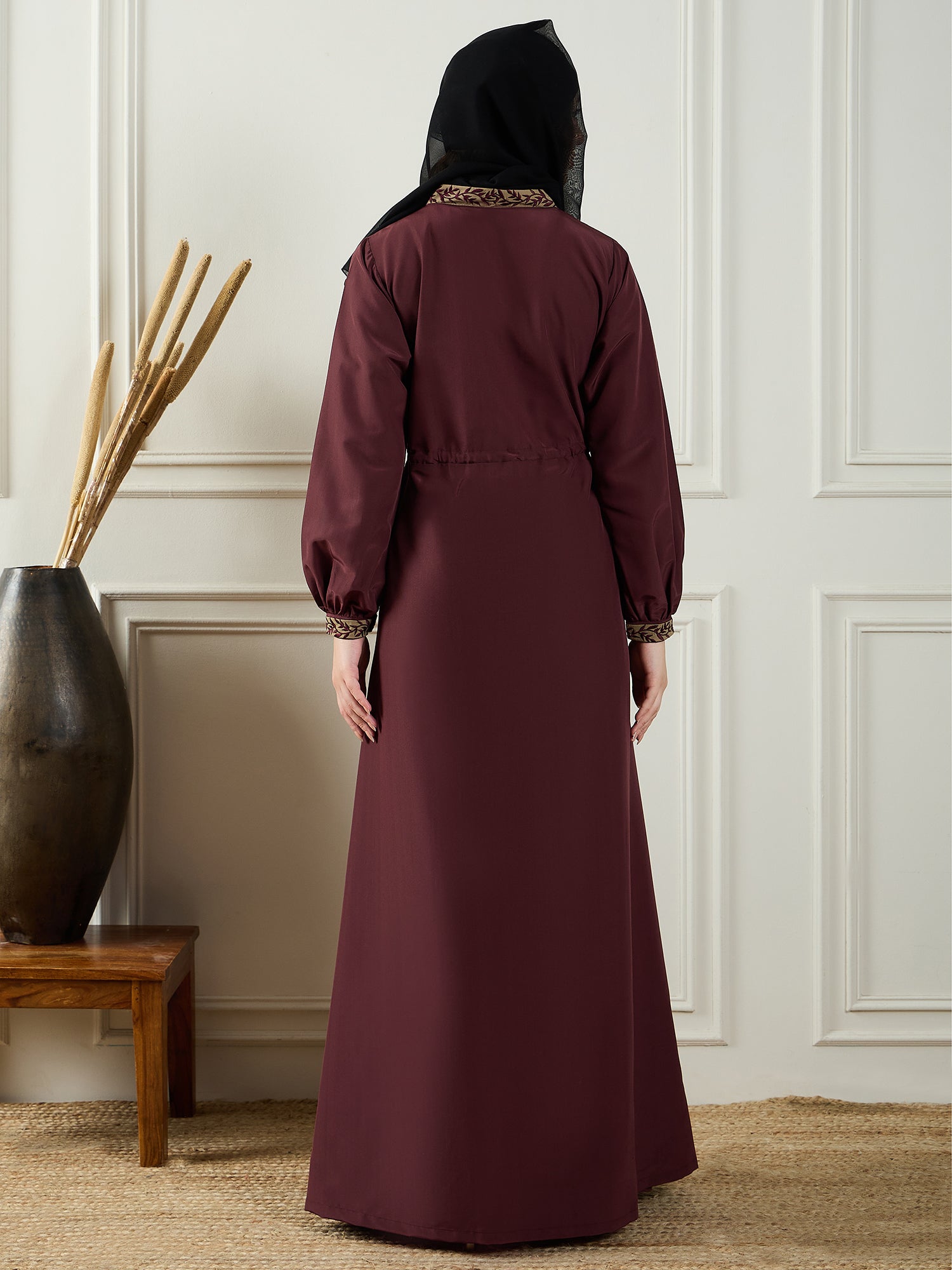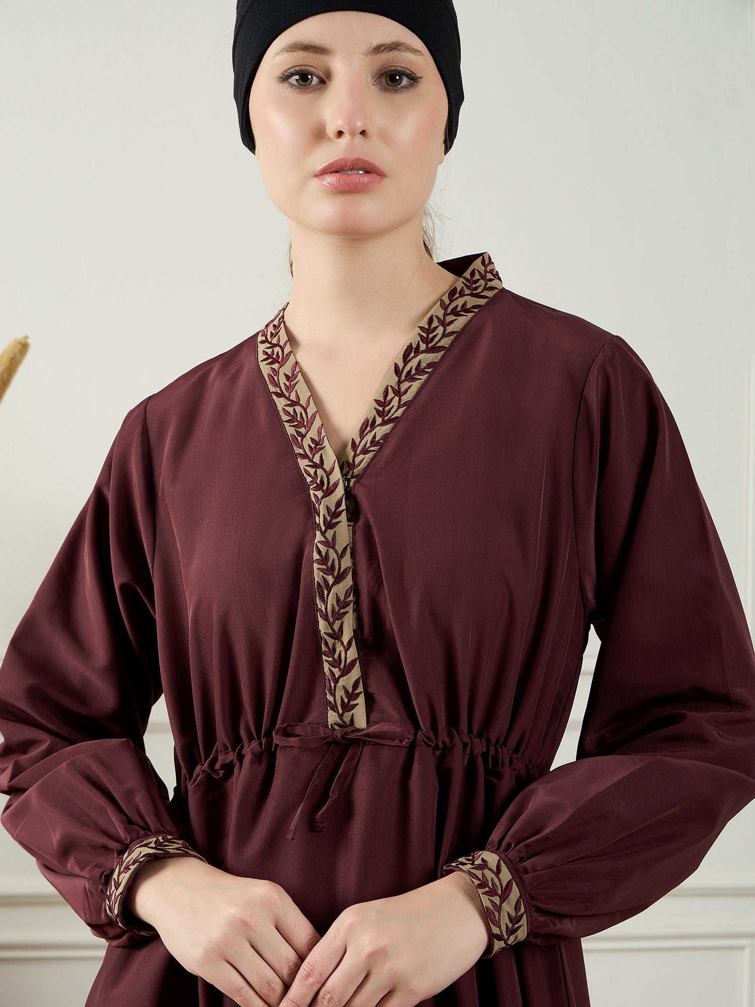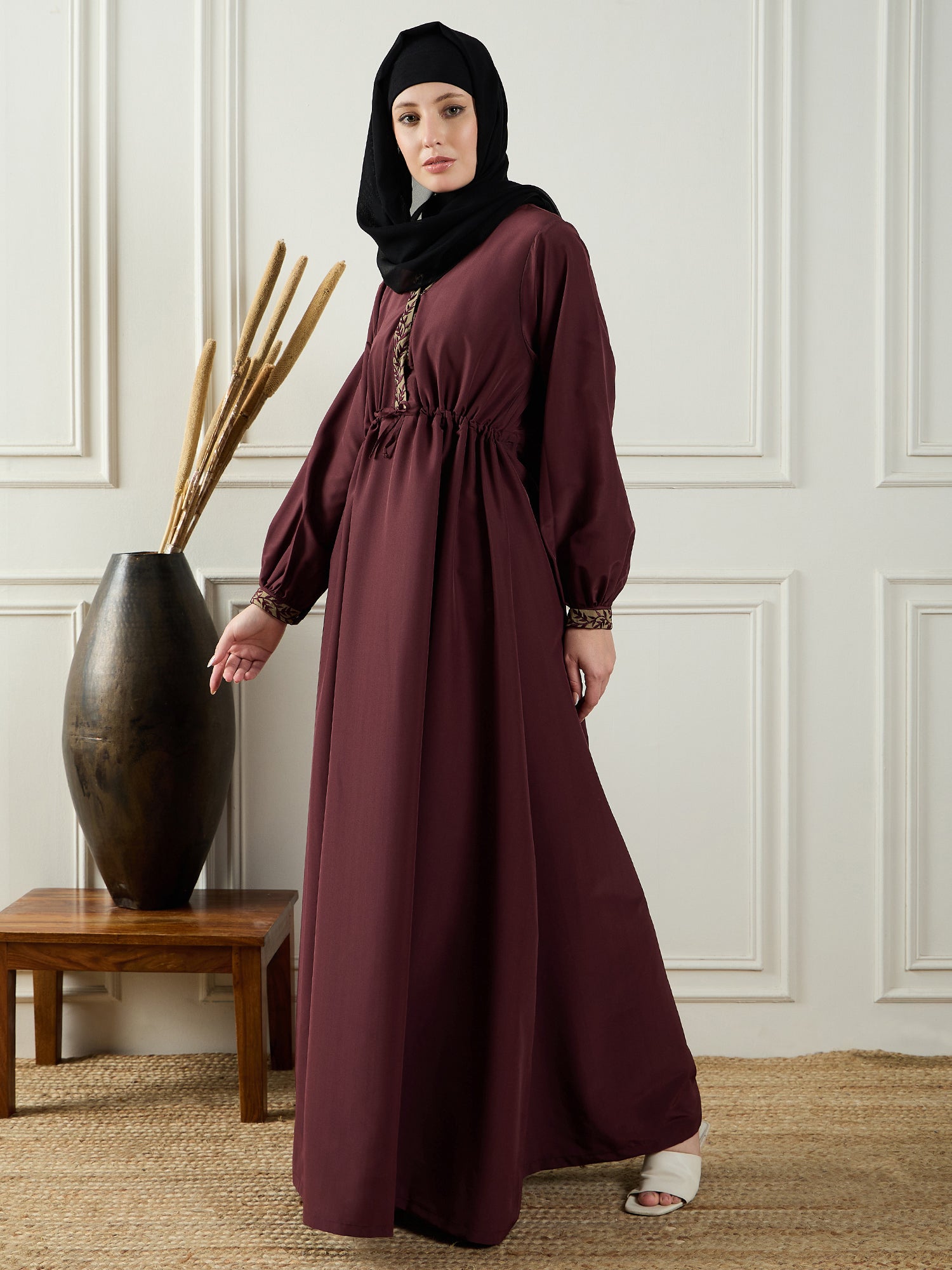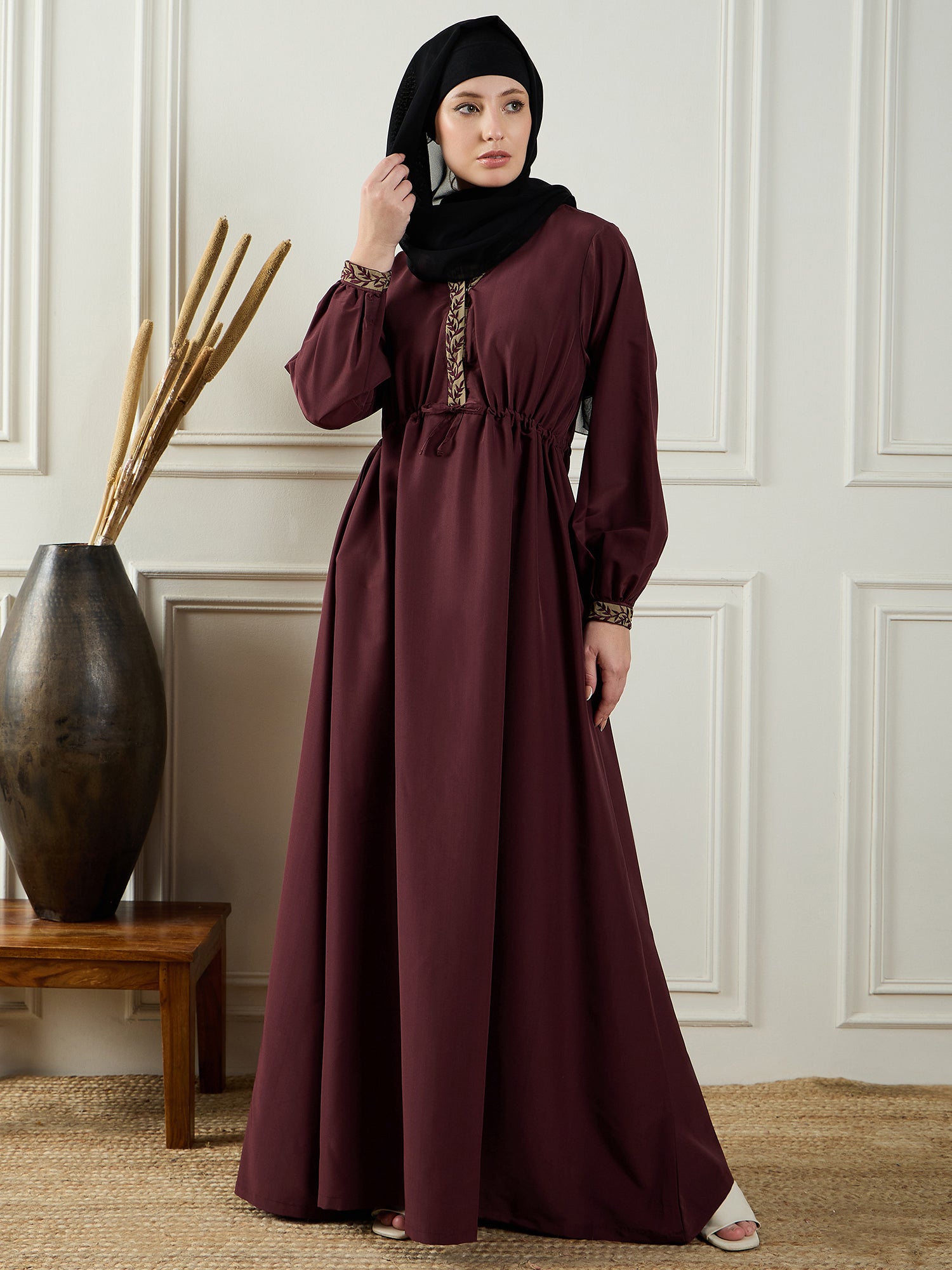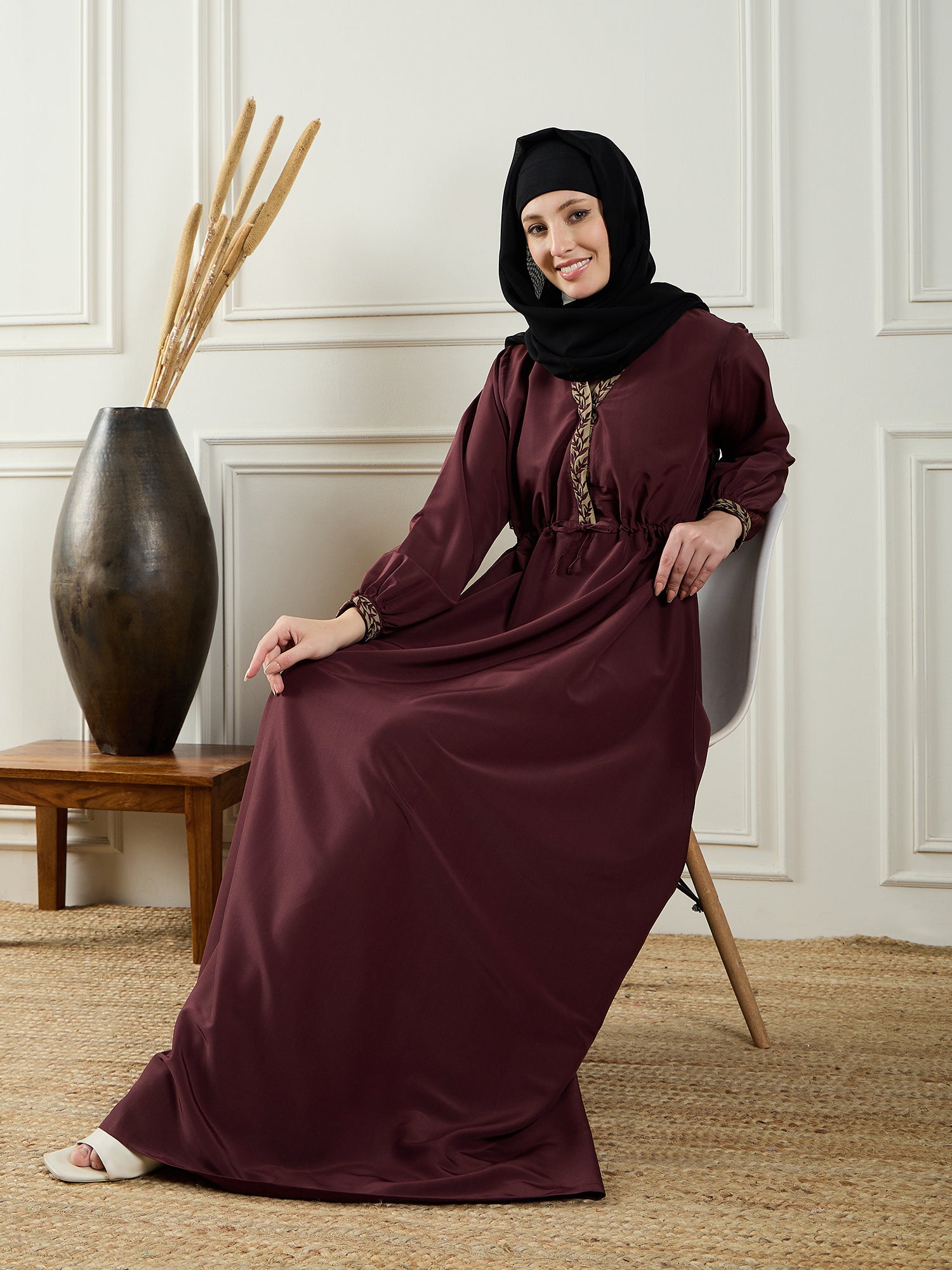 This maroon abaya burqa, adorned with stunning embroidery detailing, is designed for Islamic and Muslim women who value modest fashion. Featuring a drawstring waist for a customizable fit, this latest trending design offers both comfort and style. The relaxed silhouette, combined with its attractive color and intricate embellishments, makes it an ideal choice for everyday elegance and contemporary modesty.