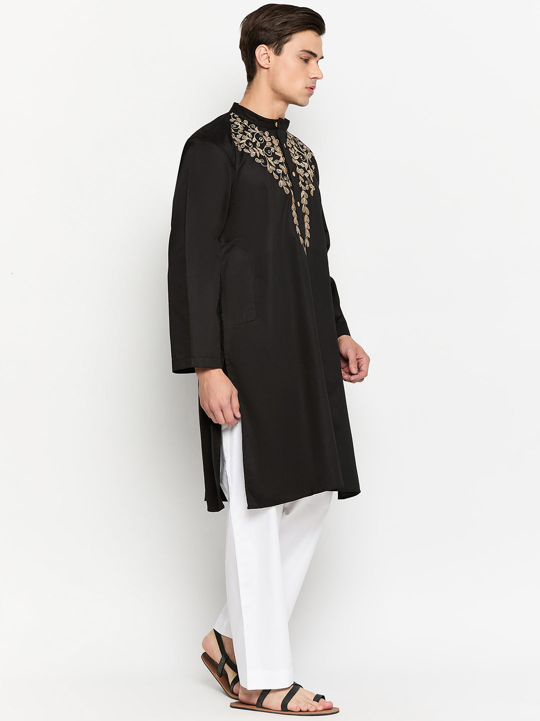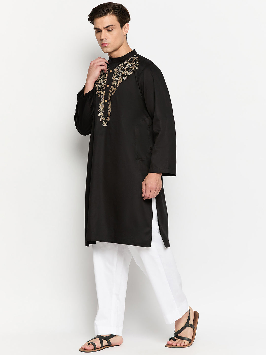 The Nabia men's black kurta and white pajama set offers a loose fit with long sleeves and side pockets, crafted from soft cotton fabric for regular wear. It features elegant embroidery on the neck, placket sides, and mandarin collar, along with a four-button front design and pajama has an elasticated slip-on closure, making it perfect for versatile styling options.