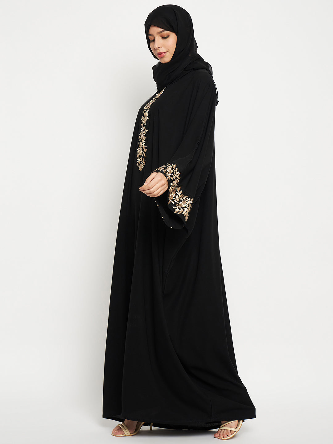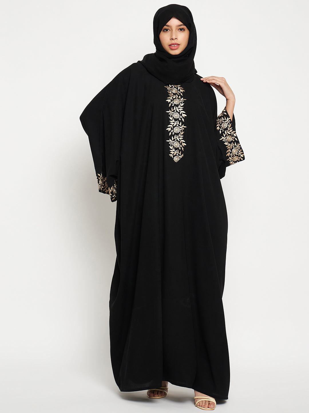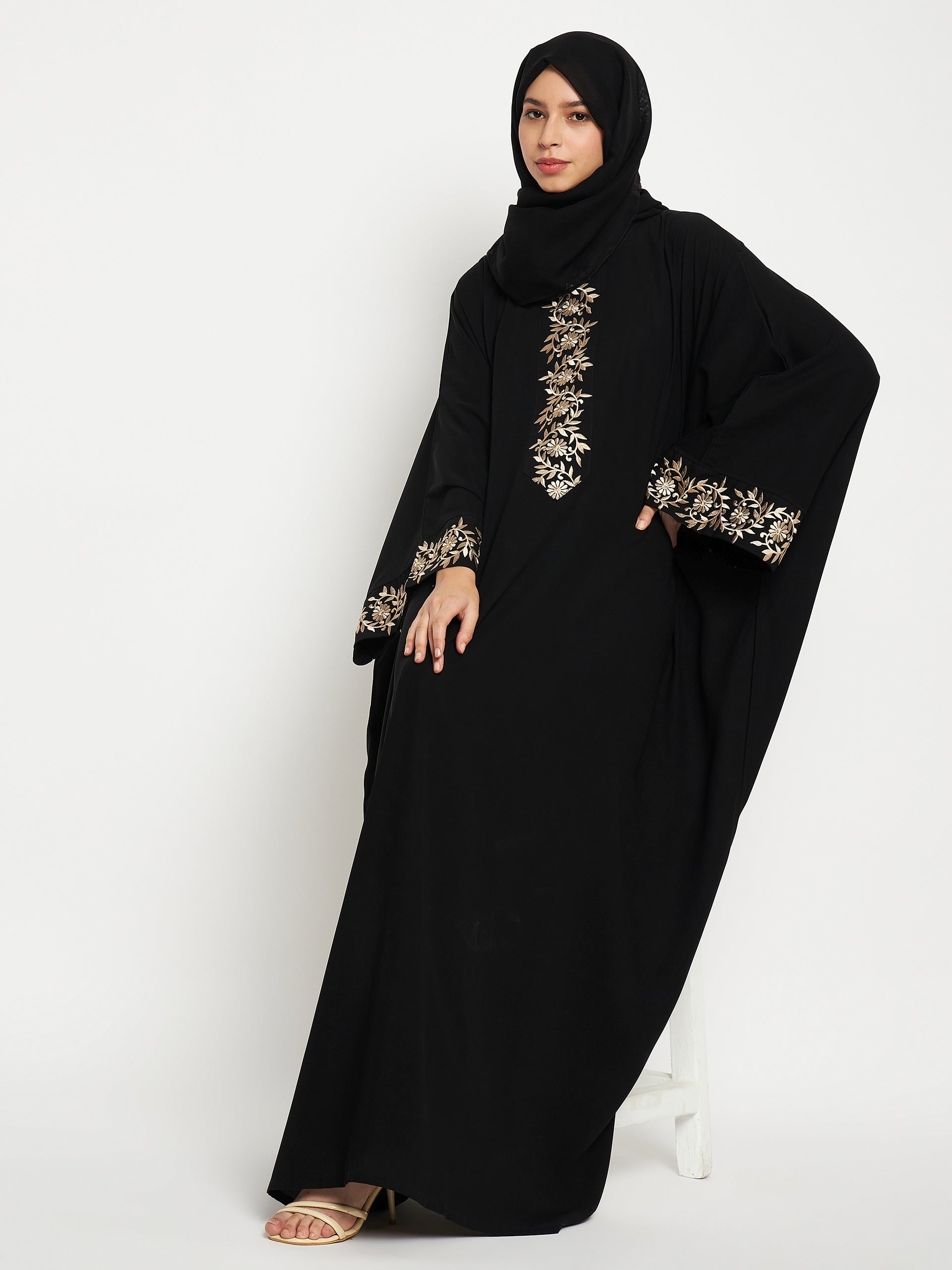 Exude sophistication in this black embroidery abaya burqa tailored for Islamic and Muslim women. The solid design, round neck, loose fit and free sleeves create an elegant silhouette. Crafted from Nida matte fabric, with a slip-on closure, it effortlessly combines modesty and style.