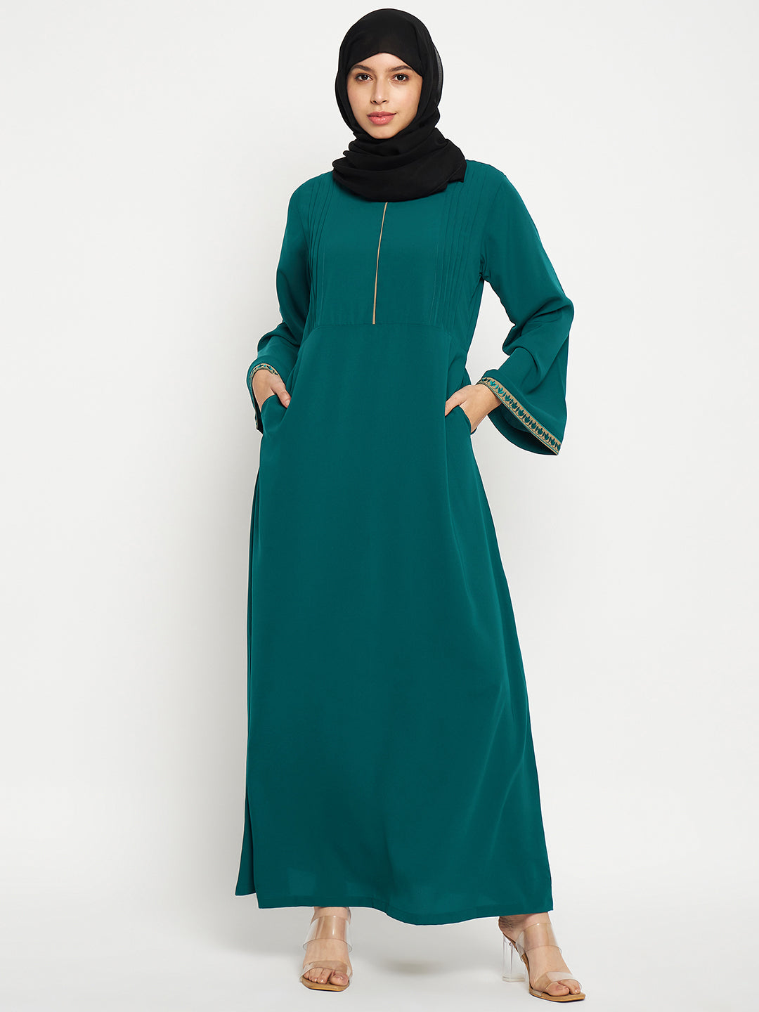 Exude sophistication in this black abaya burqa tailored for Islamic and Muslim women. The solid design, round neck, and bell sleeves create an elegant silhouette. Crafted from Nida matte fabric, with a slip-on closure, it effortlessly combines modesty and style.