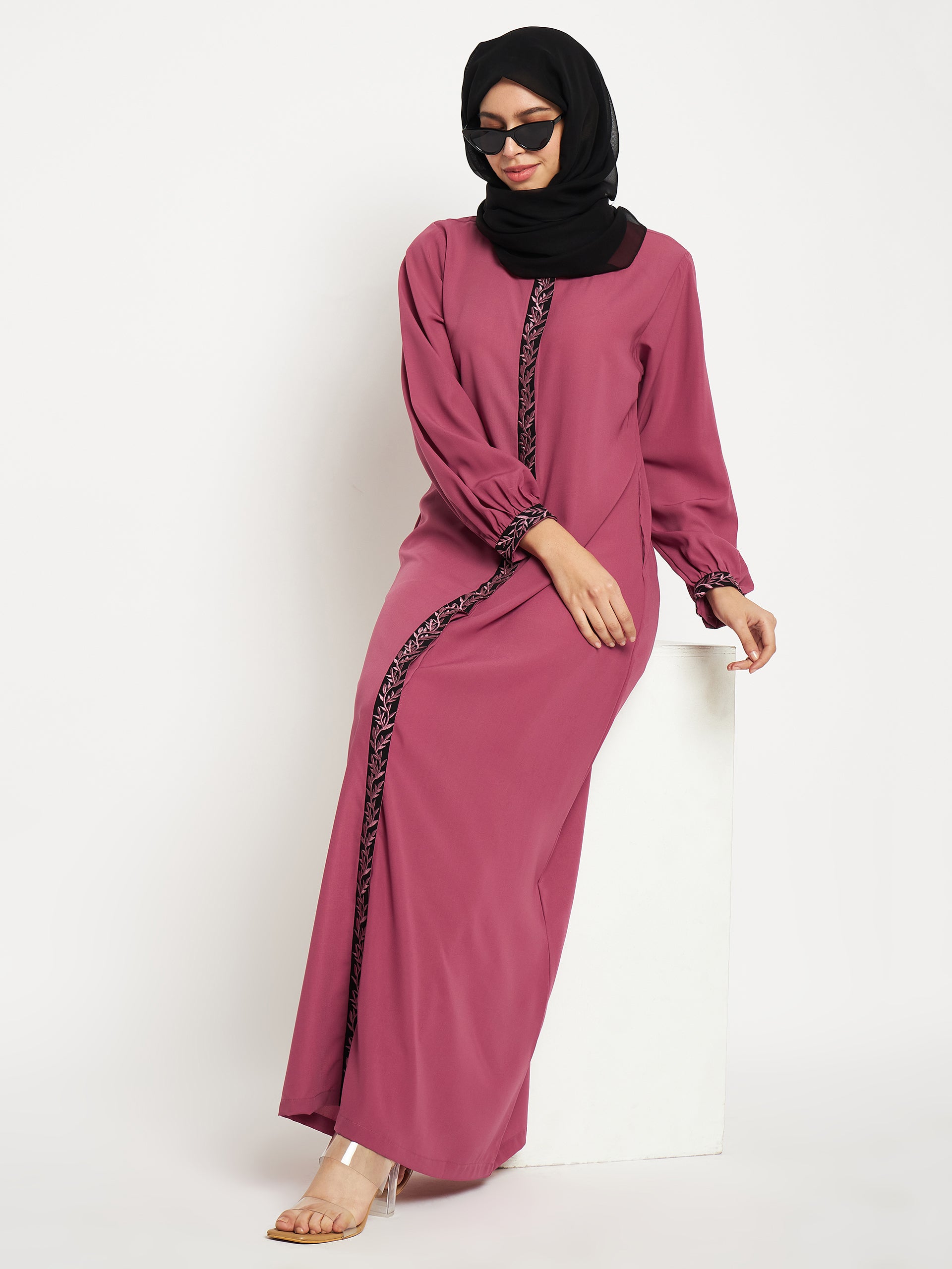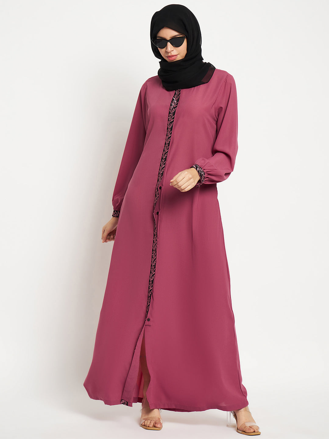 Exude sophistication in this pink embroidery front open abaya burqa tailored for Islamic and Muslim women. The solid design, round neck, side pockets and bell sleeves create an elegant silhouette. Crafted from Nida matte fabric, with a slip-on closure, it effortlessly combines modesty and style.
