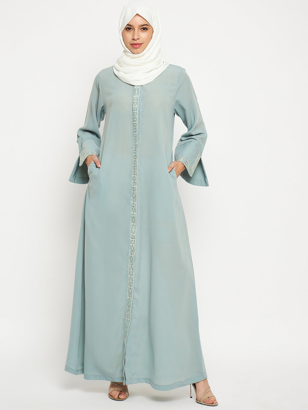 Exude sophistication in this sea green embroidery front open abaya burqa tailored for Islamic and Muslim women. The solid design, round neck, and bell sleeves create an elegant silhouette. Crafted from Nida matte fabric, with a slip-on closure, it effortlessly combines modesty and style.