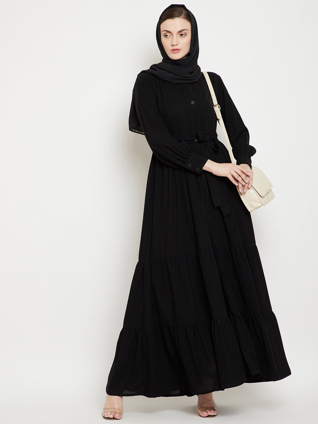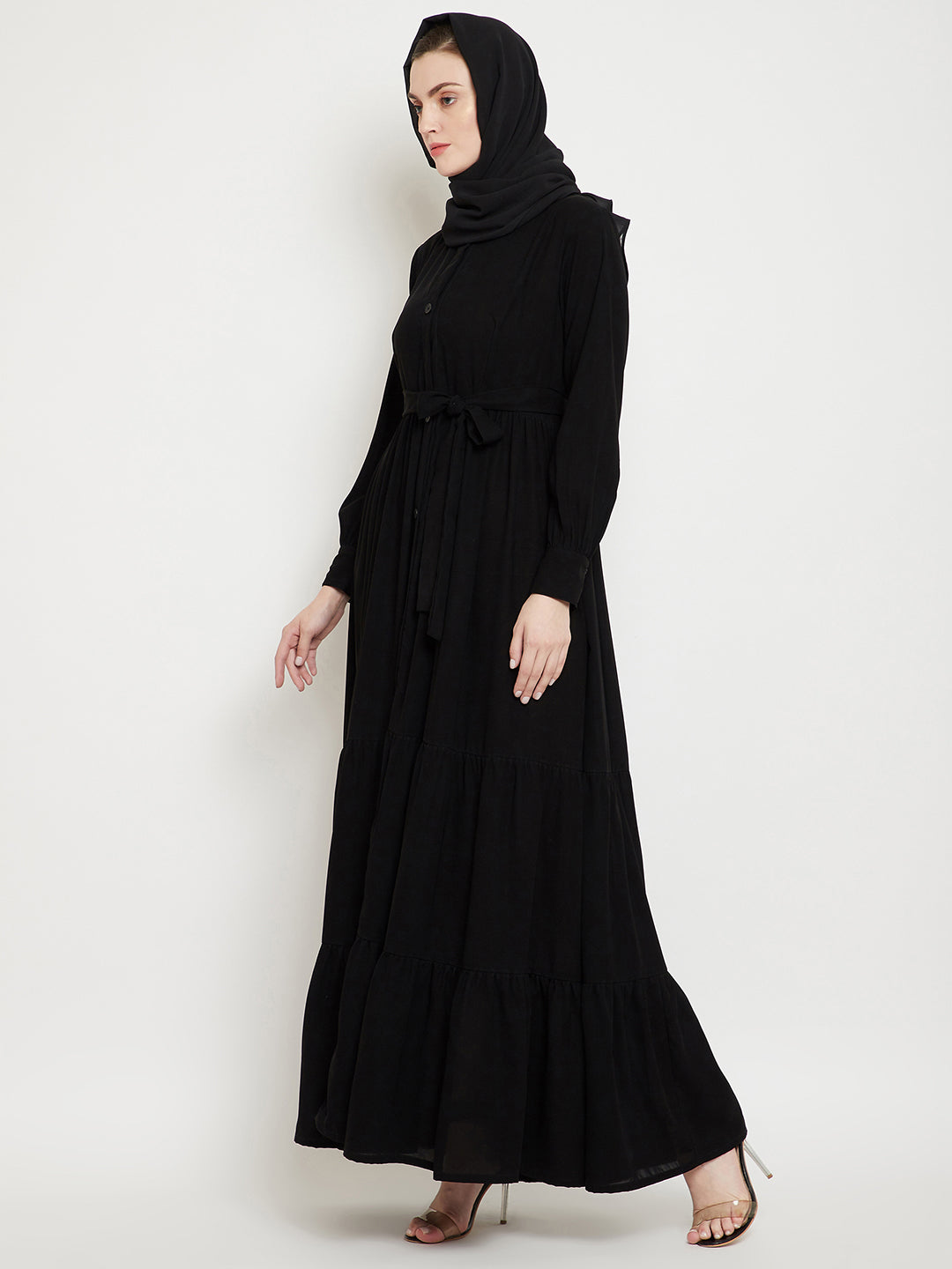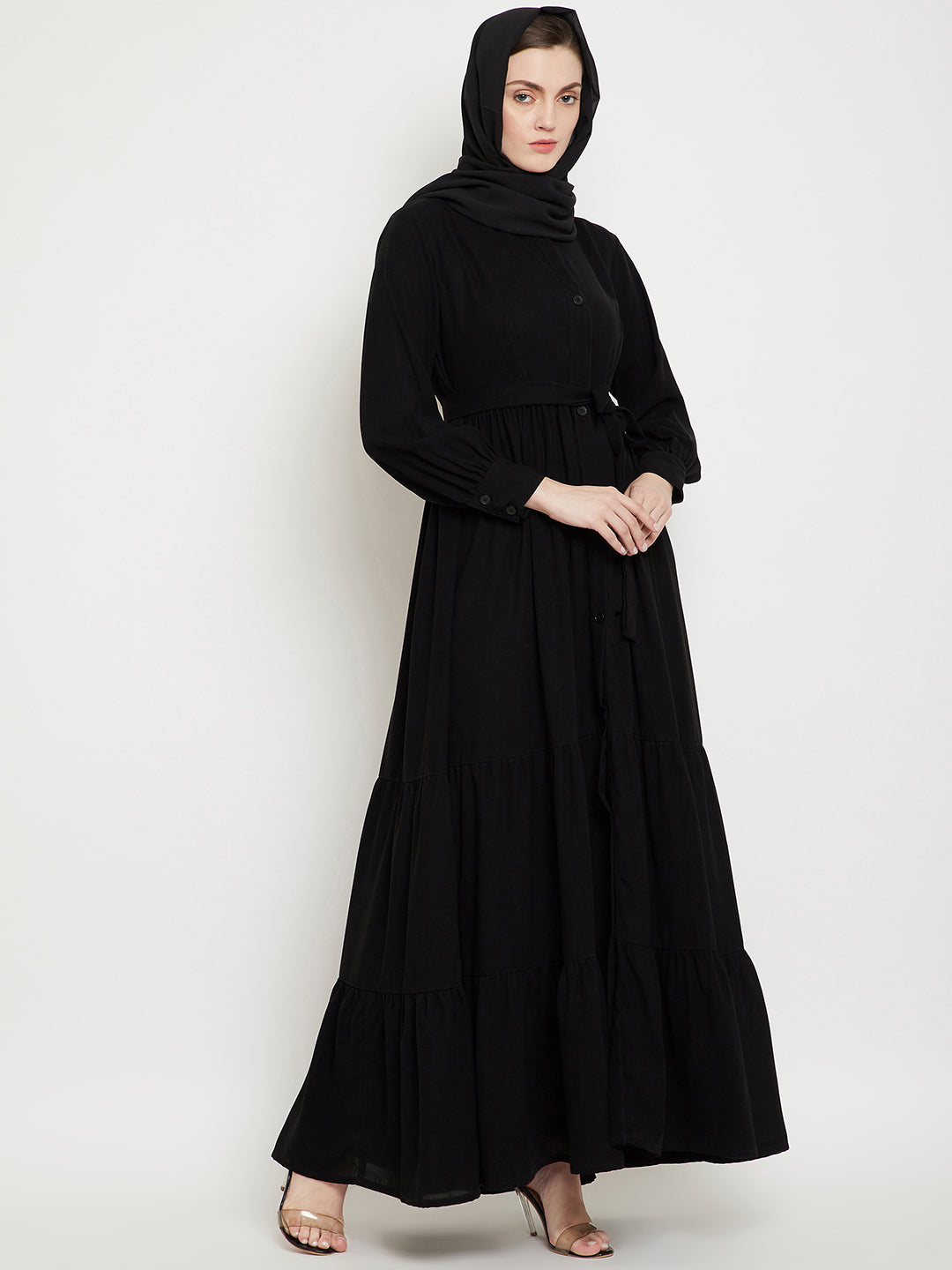 This Black Abaya has full length, with three flowing frills levelled over each other to give you a feel of exquisite dressing and beautiful personality. It has been made in ‘Nida Matte Finish’ fabric, long cuffed sleeves which can fold or band and adjustments to allow you to make them as you feel for. This Abaya has a waist belt so that you can adjust the breadth as and when you like in accordance with the place and weather. This adjusting belt would provide you with free movement and a sense of dressing to good fit.