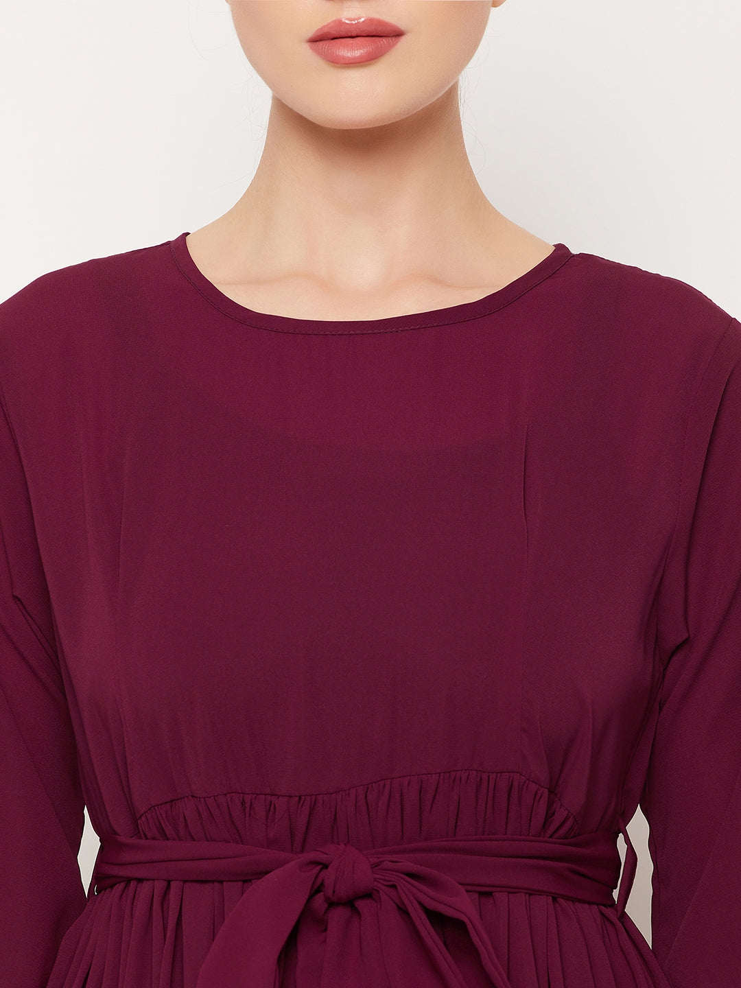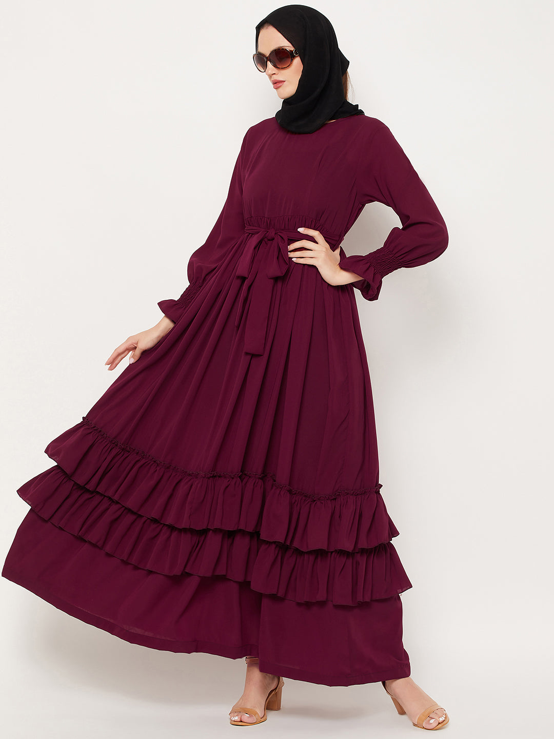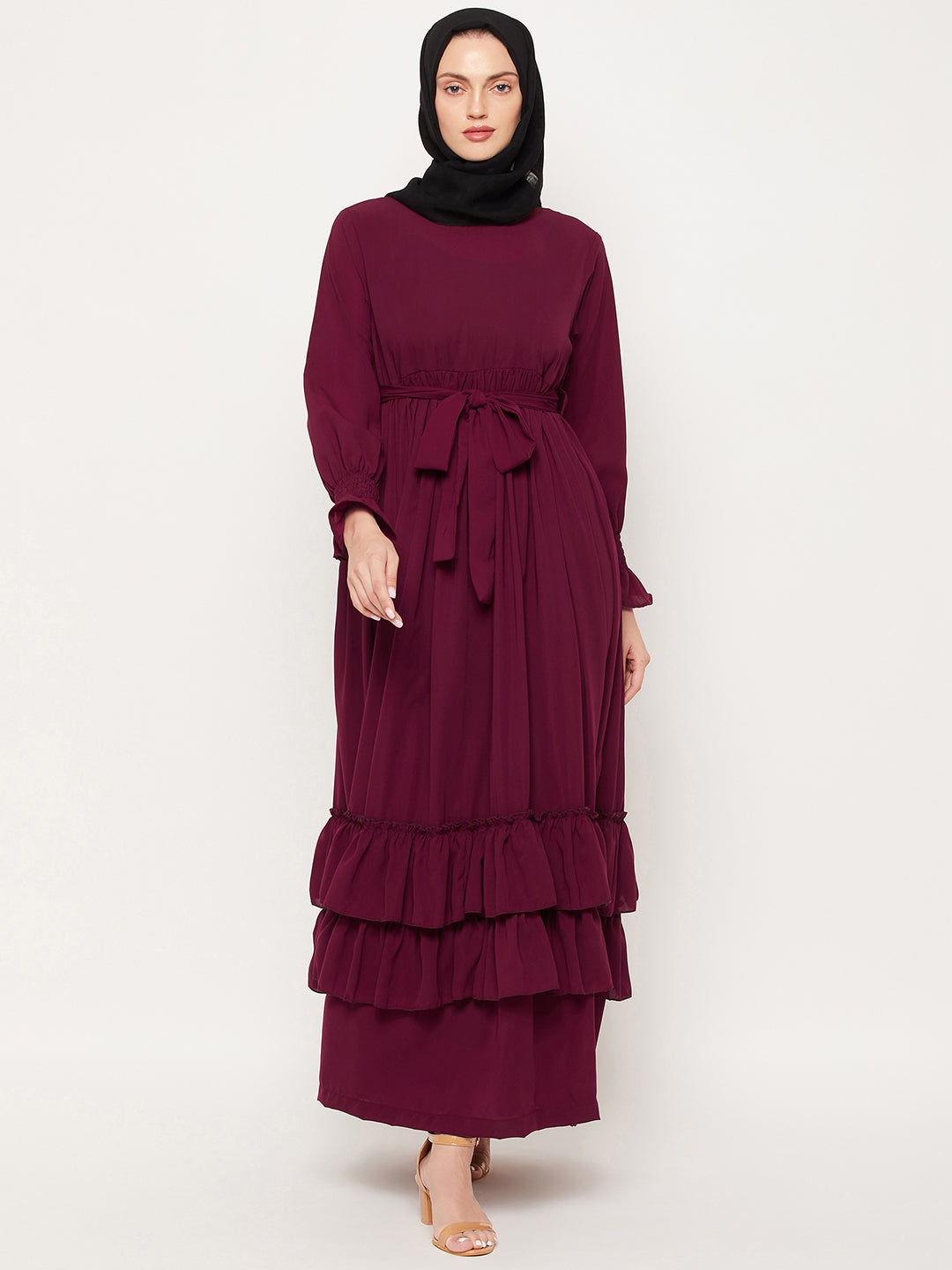 This Maroon Abaya has full length, with three flowing frills leveled over each other to give you a feel of exquisite dressing and beautiful personality. It has been made in ‘Nida Matte Finish’ fabric, long bell sleeves which have elastic adjustments to allow you to make them as you feel for. This Abaya has a waist belt so that you can adjust the breadth as and when you like in accordance with the place and weather. This adjusting belt would provide you with free movement and a sense of dressing to good fit.