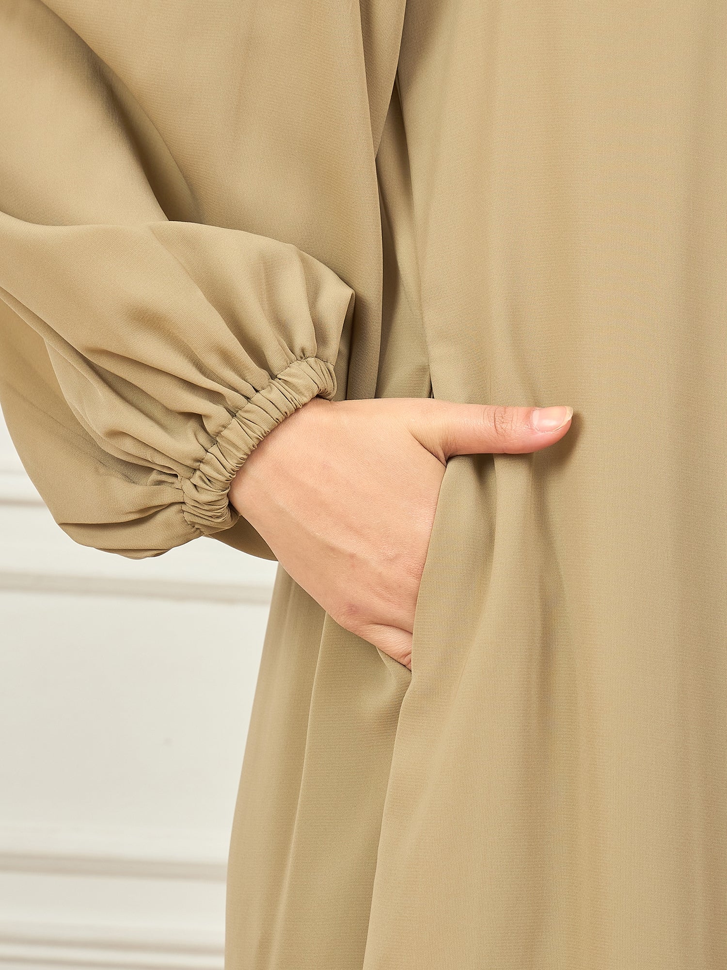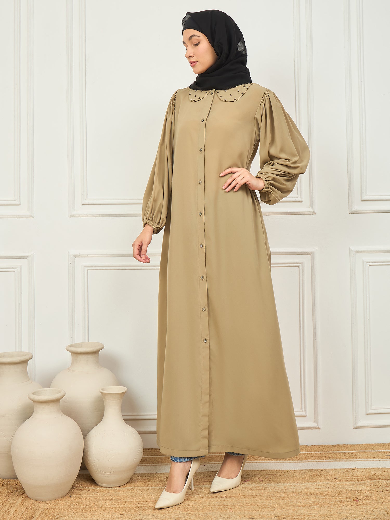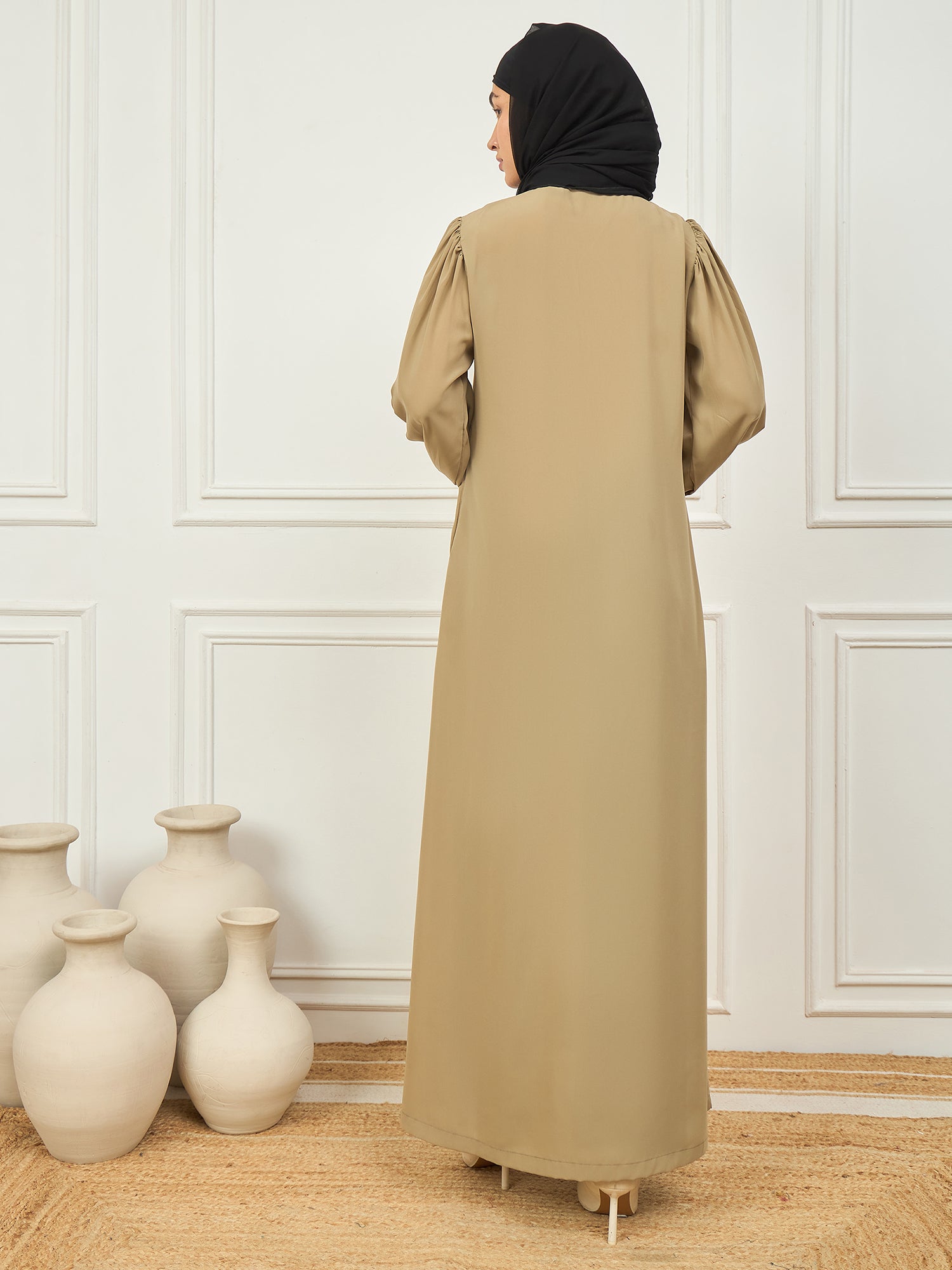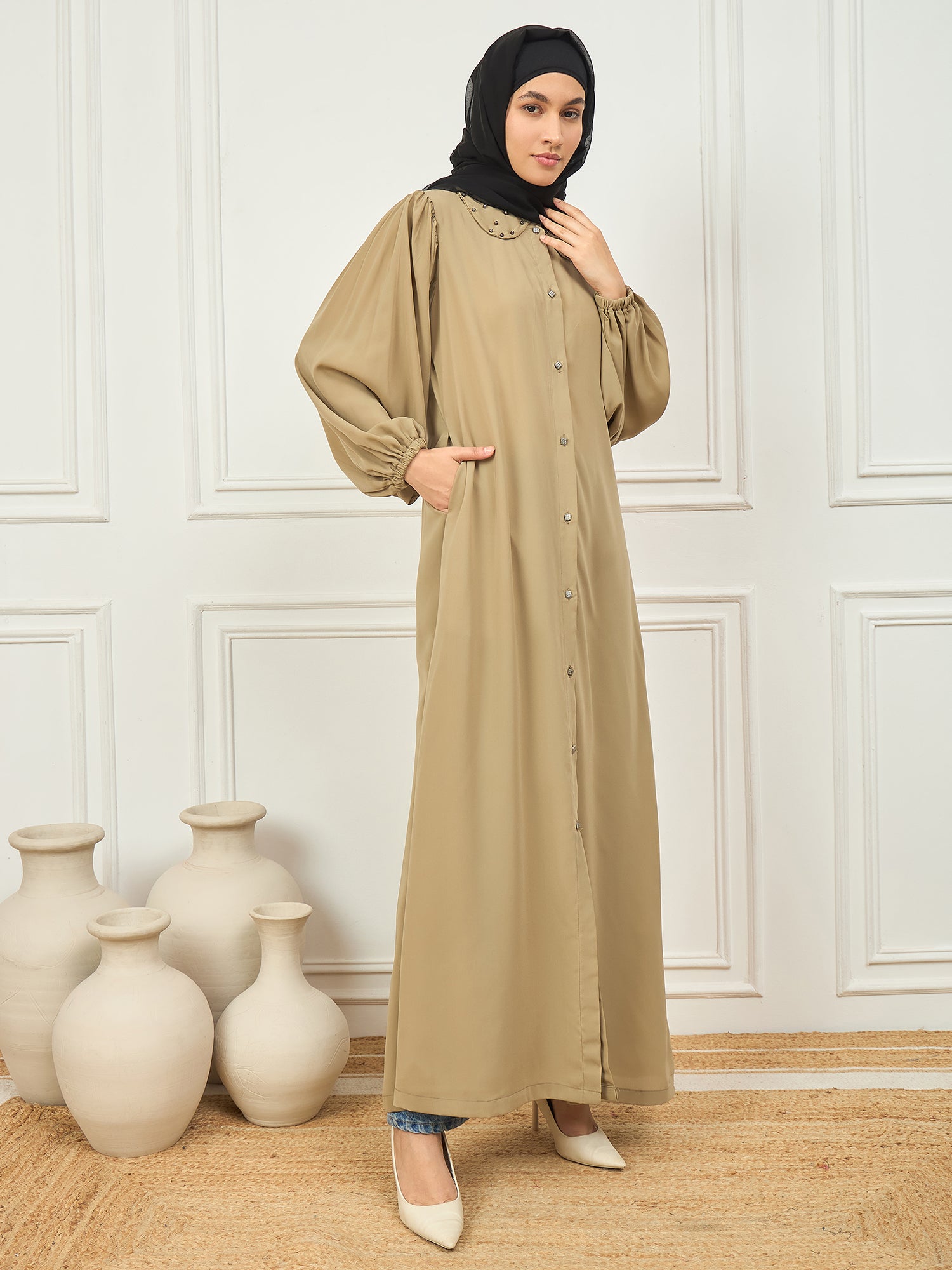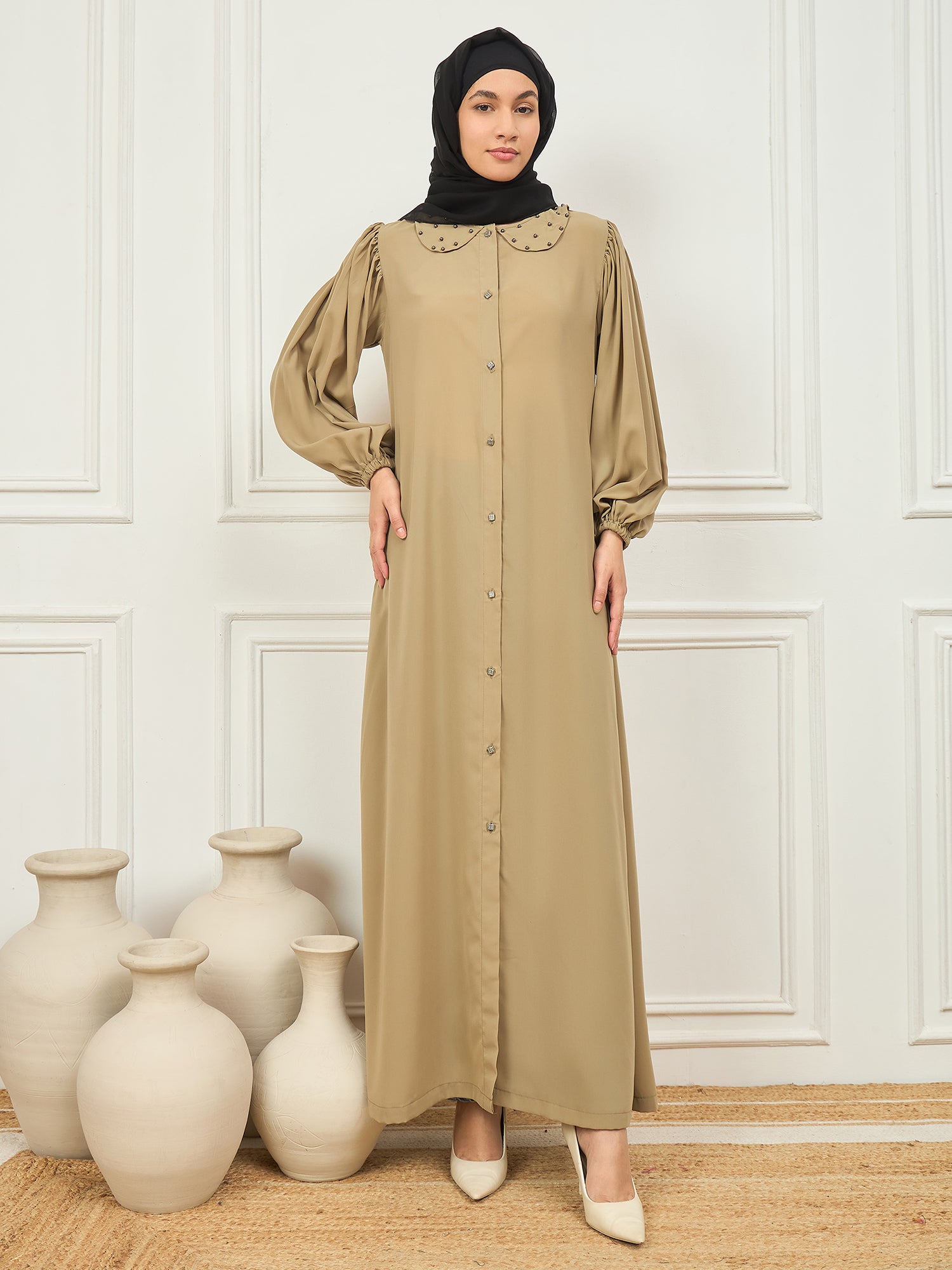 This beige abaya burqa showcases a delicate pearl design on the neck, adding a touch of elegance to its solid, modest look. Made from soft Nida matte fabric, it features a round neck, long elastic sleeves, and a comfortable button closure. Designed for Islamic and Muslim women, this abaya beautifully blends timeless style with modern modest fashion—making it a graceful and versatile choice for everyday wear or special occasions.