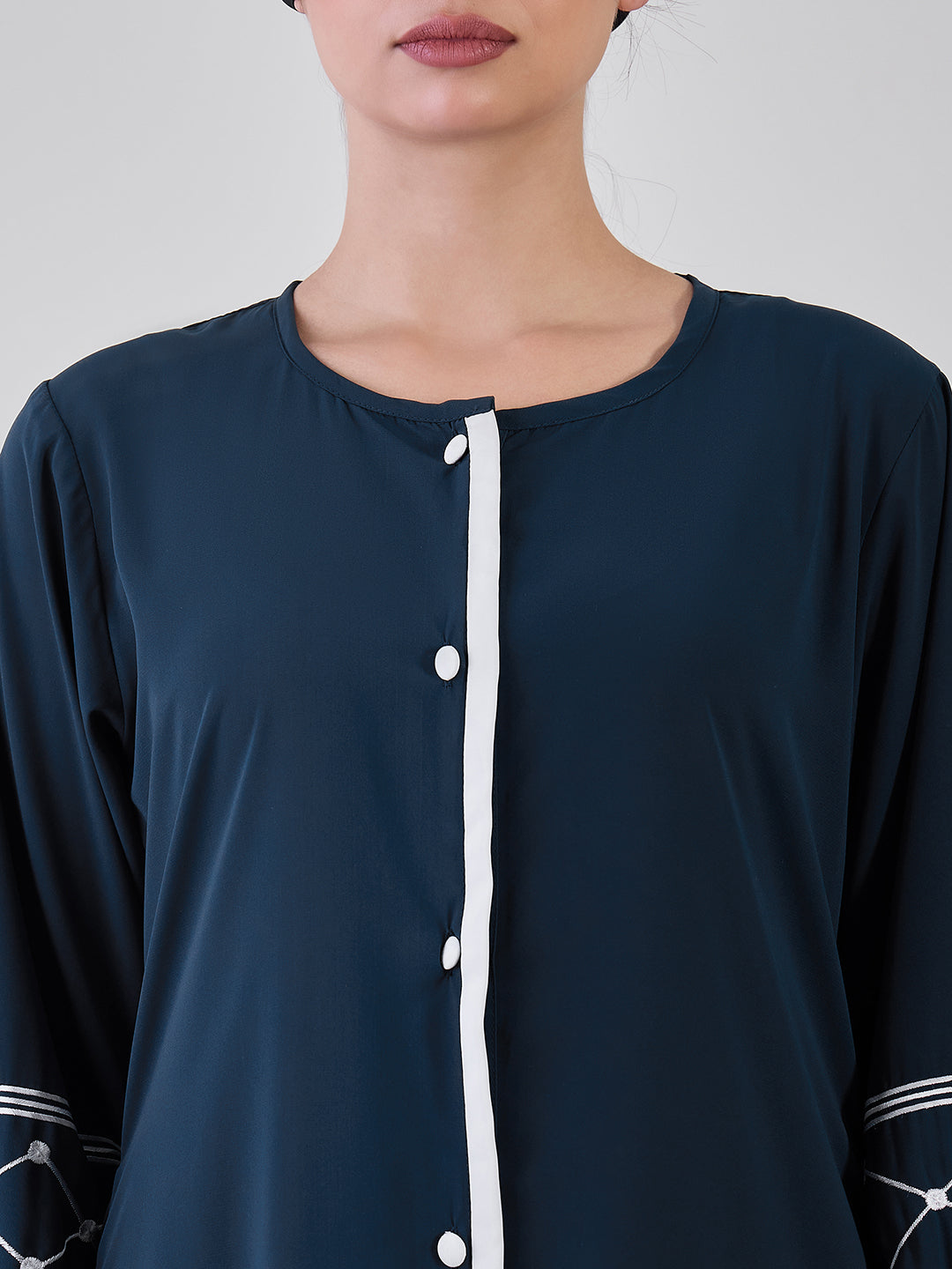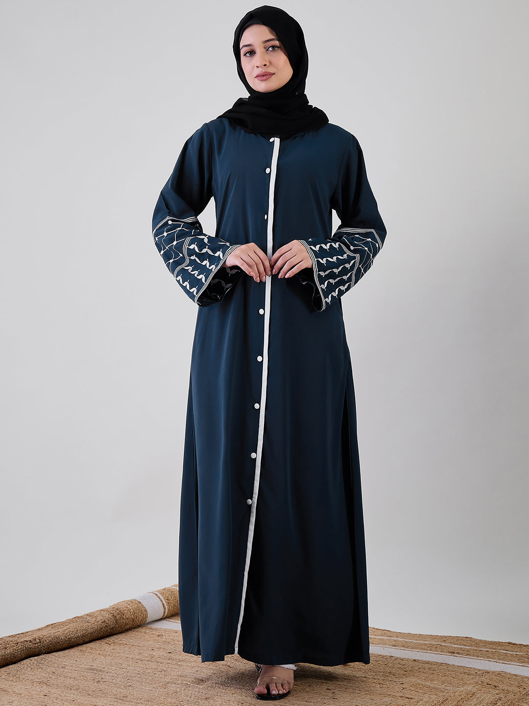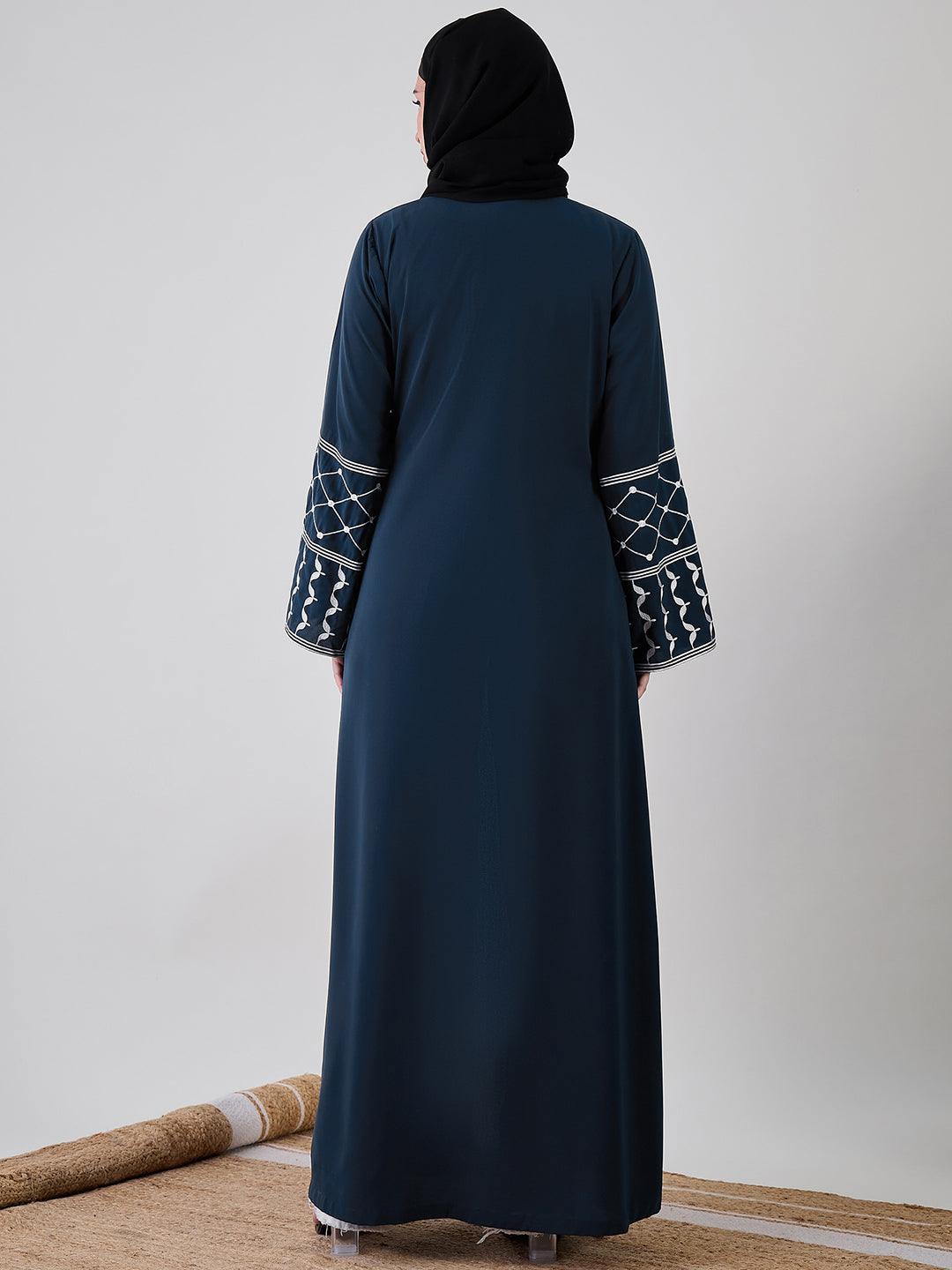 The Kefiyyeh Embroidered Teal Abaya Burqa, crafted from premium soft Nida Matte fabric, is a stunning choice for modern Muslim women. Designed with a front-open style, elegant bell sleeves, practical side pockets, and intricate embroidery, it offers a blend of timeless elegance and contemporary fashion. This versatile abaya ensures a graceful, sophisticated look, perfect for any occasion.