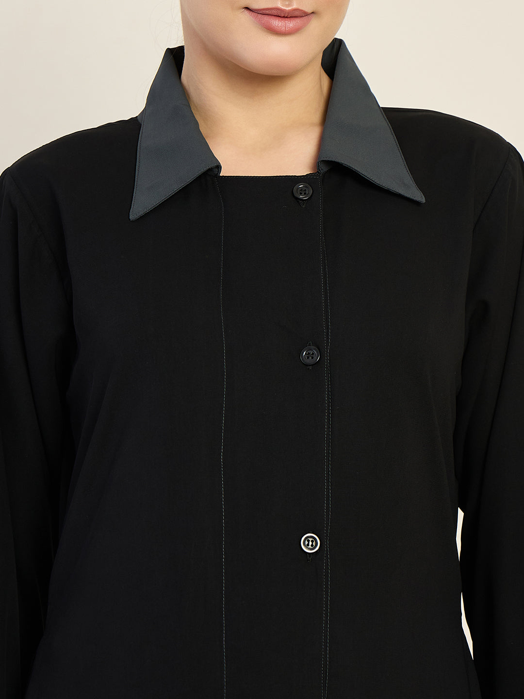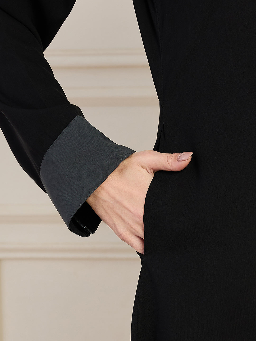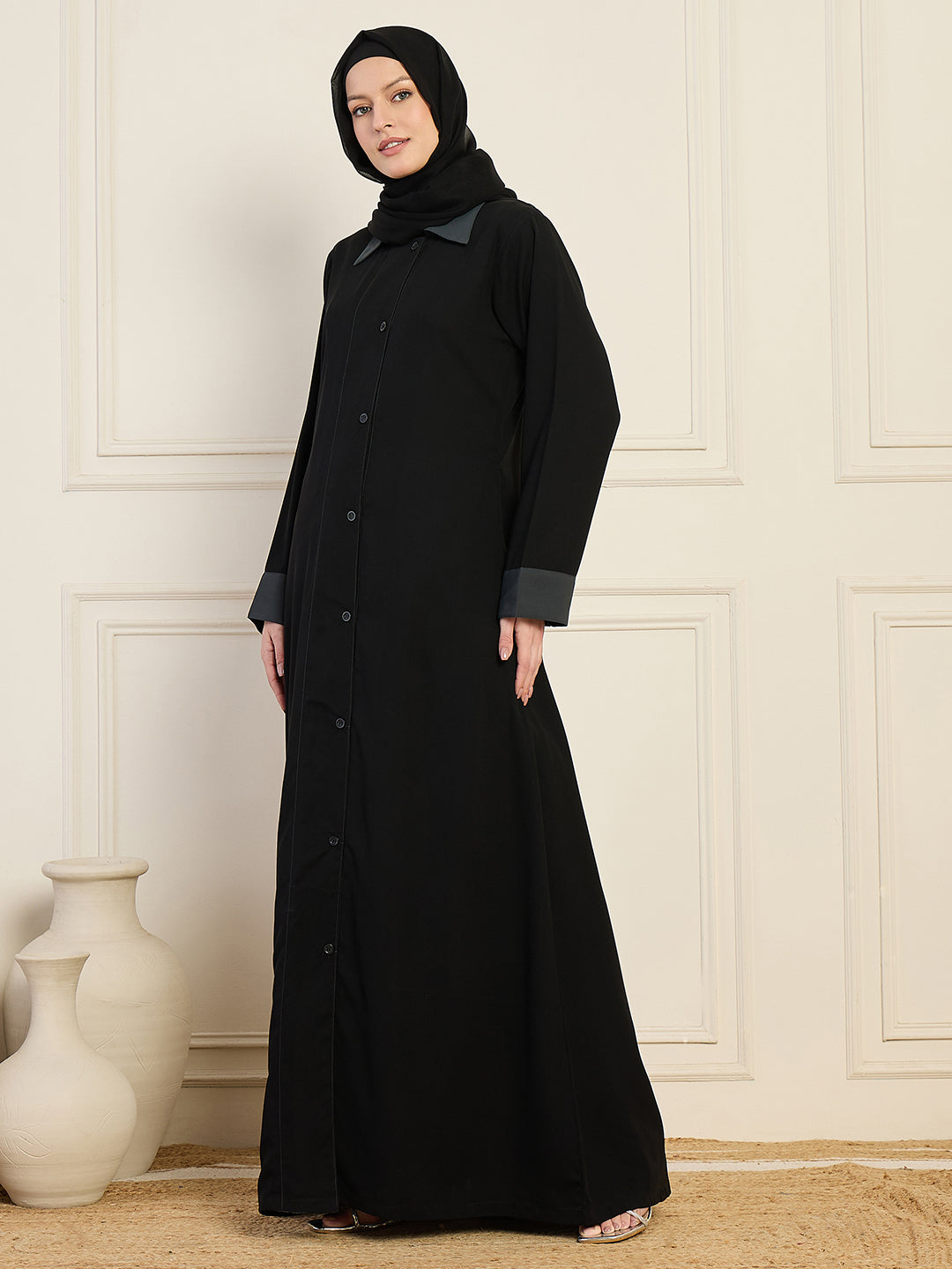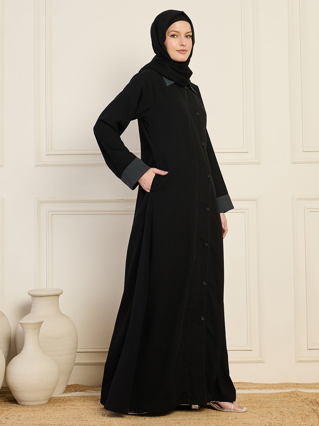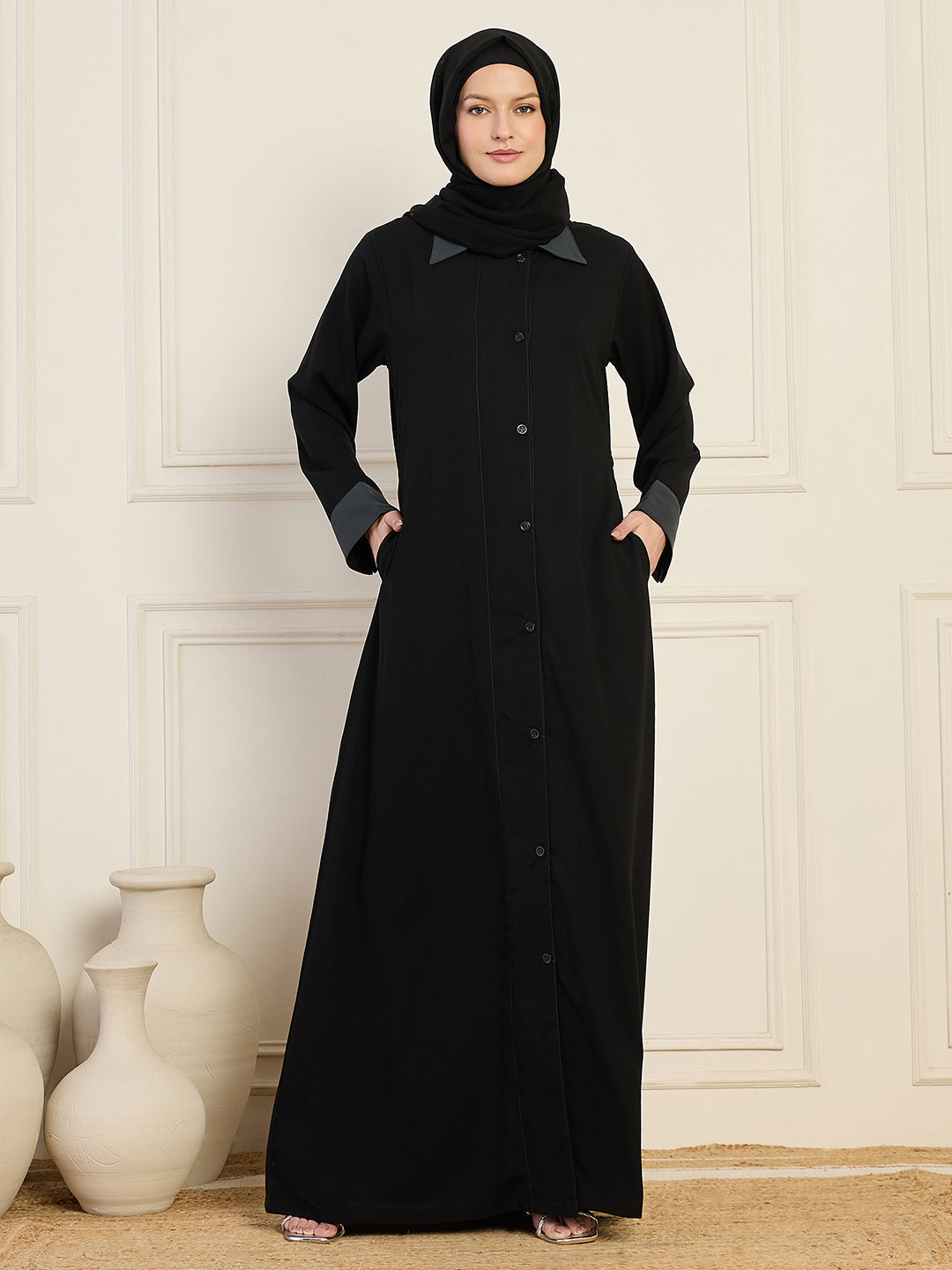 The Nabia black solid abaya burqa exudes understated elegance for Islamic and Muslim women. Crafted from luxurious Nida Matte fabric, it features side pockets for added convenience and a stylish shirt collar for a contemporary touch. The olive black piping detailing enhances its refined look. From the latest collection, this abaya offers a versatile and modest design, making it perfect for any occasion, blending comfort, style, and sophistication effortlessly.
