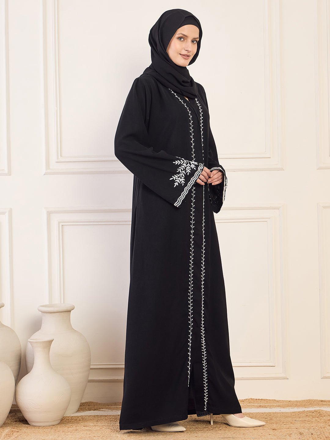 Experience timeless elegance with this black solid luxury abaya burqa, featuring intricate handwork detailing for a sophisticated look. Designed with a relaxed fit, it offers comfort and grace, while the front-open style with tich button closure ensures effortless wear. Perfect for both special occasions and everyday outings, this abaya seamlessly combines tradition with contemporary fashion, making it a refined and versatile choice for modern modest wardrobes.
