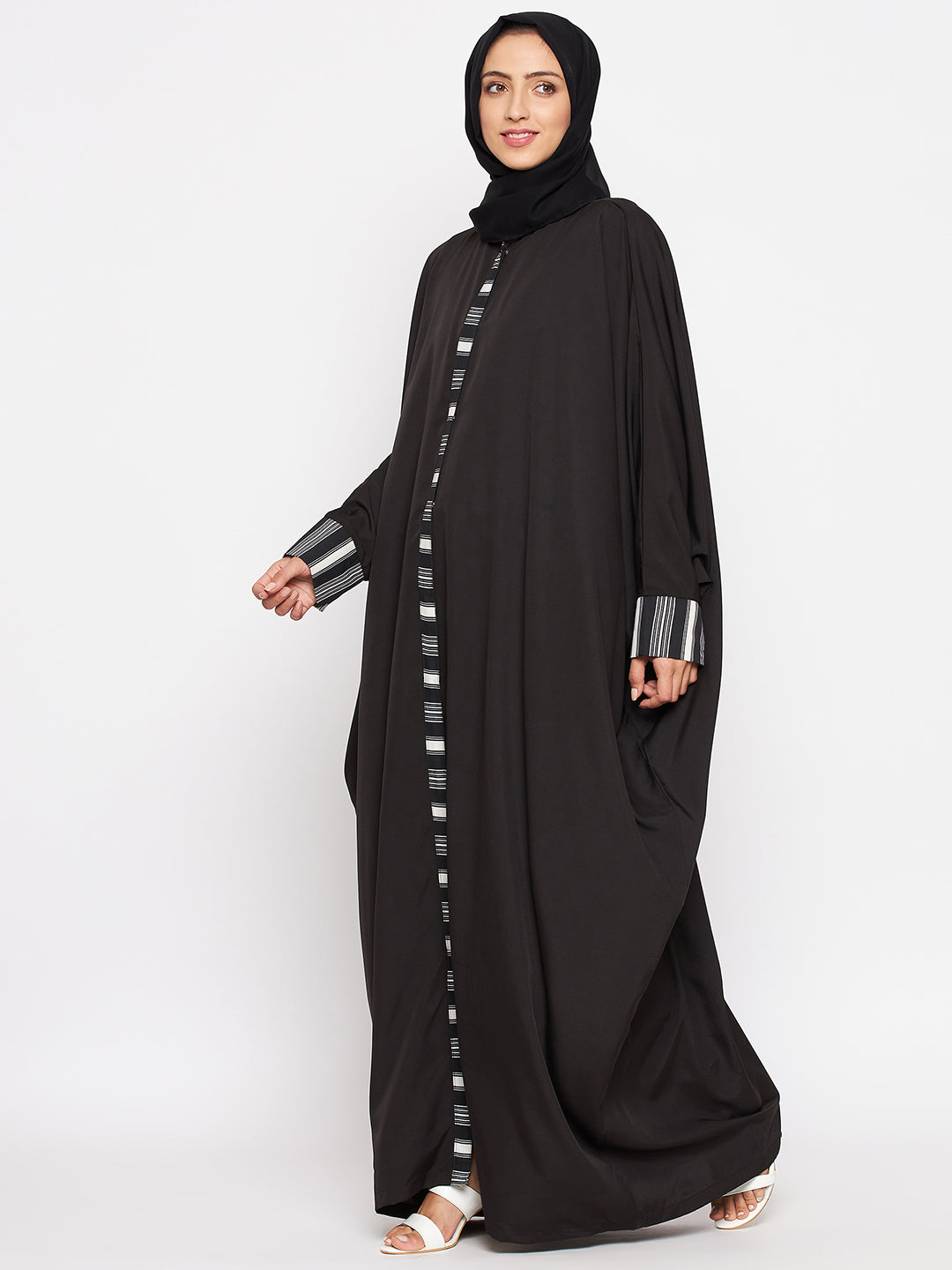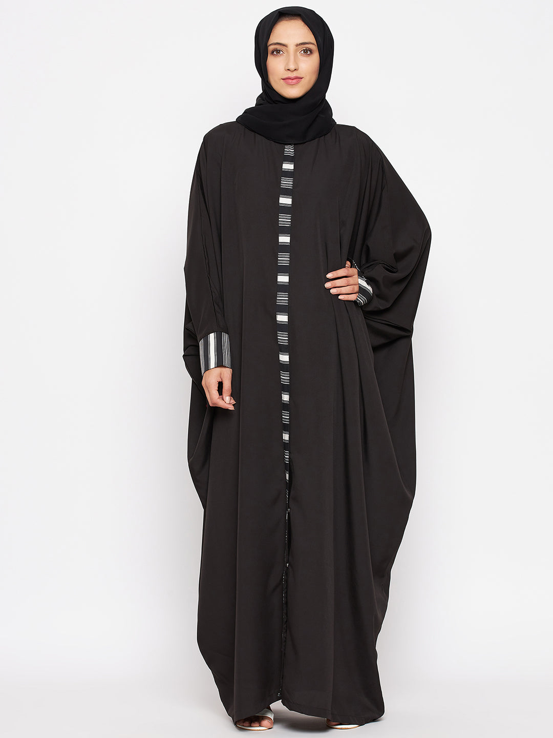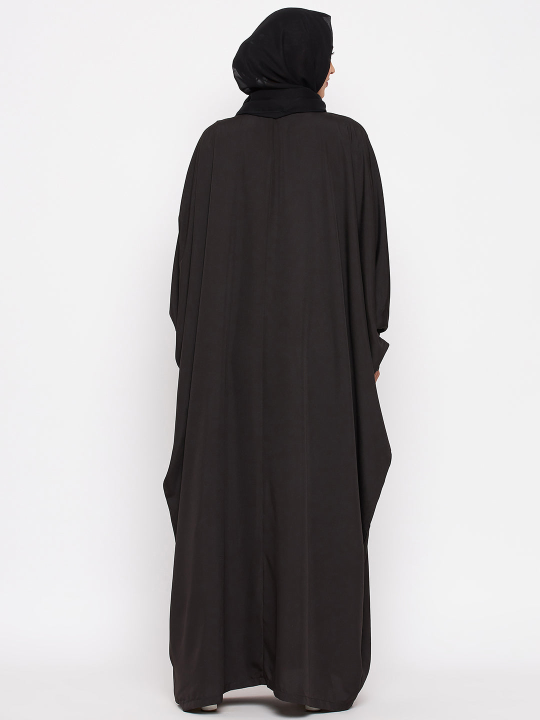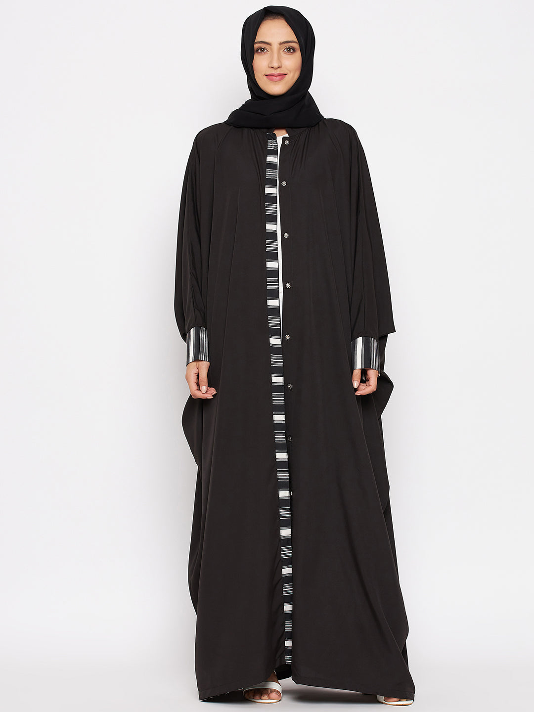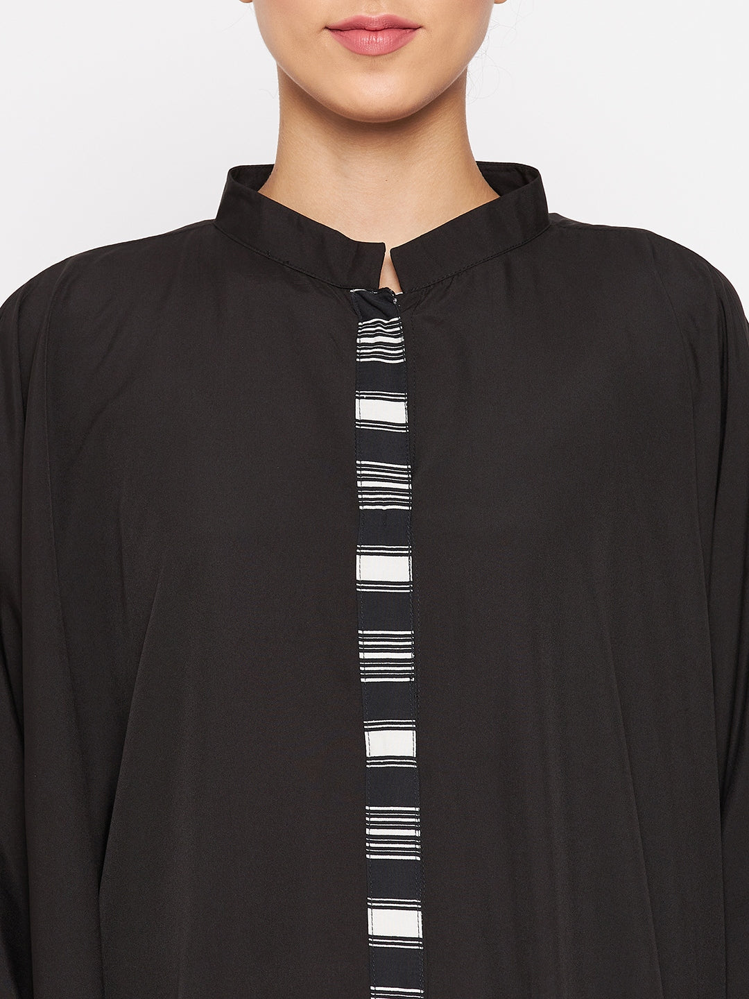 Thenabia black front open solid kaftan made for your modesty and elegance while being a perfect comforting wear. It has been made in soft crepe fabric which is soft, light weight and easy to maintain. It has mandarin collar, flared cuff sleeves and button cosure.