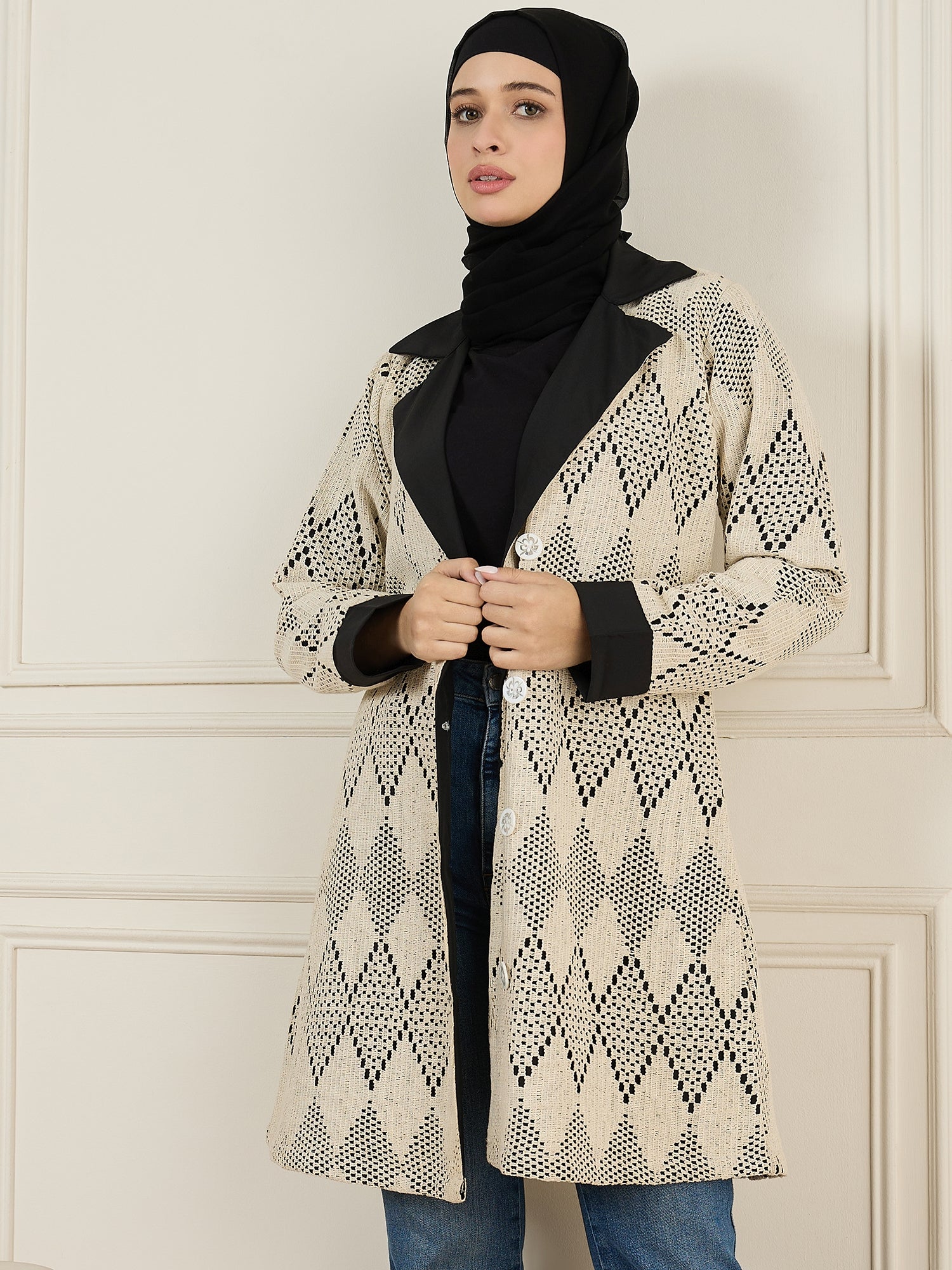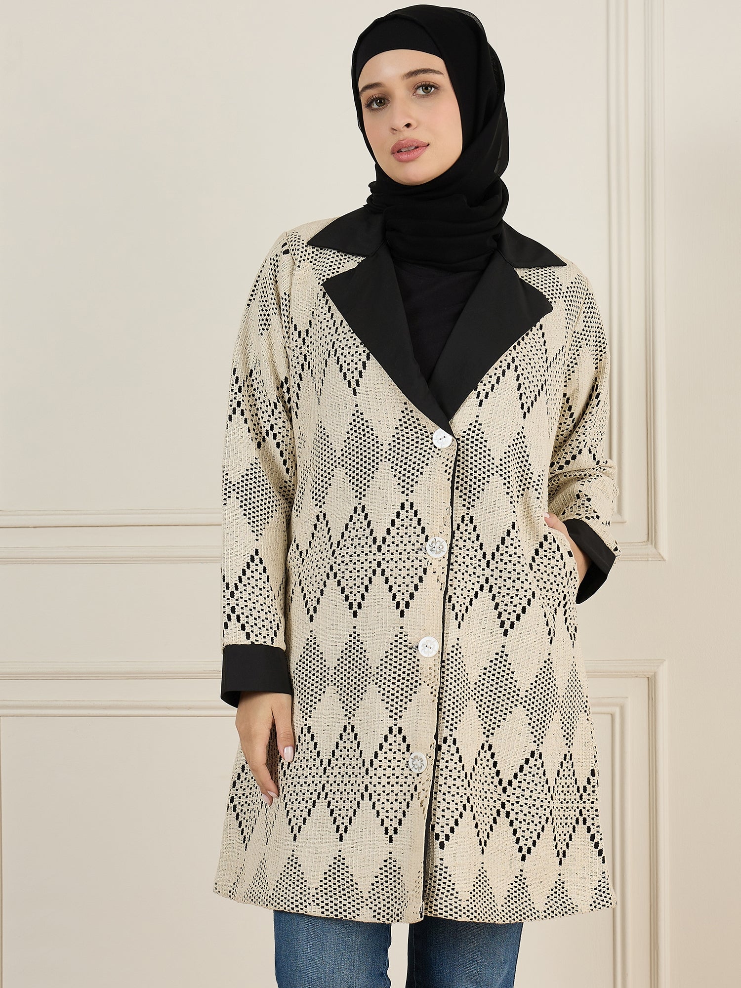 This knitted outerwear jacket for women, crafted from breathable cotton, boasts a classic collar with a chic black accent. Designed with practical side pockets and a front-open button closure, it combines elegance and functionality effortlessly. Perfect for any occasion, this versatile piece enhances both casual outings and formal events, adding a vibrant and sophisticated touch to your wardrobe.