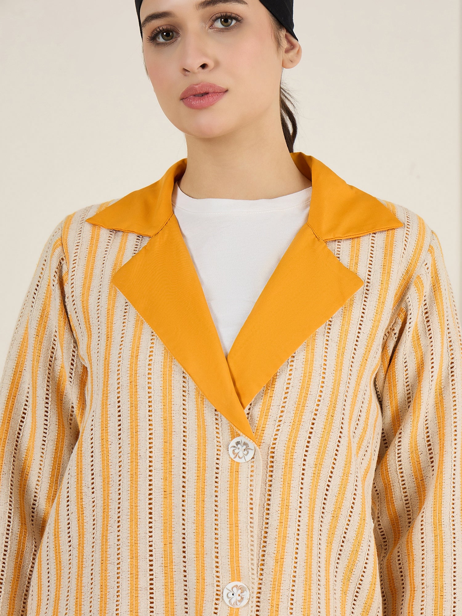 This knitted outerwear jacket for women, crafted from breathable cotton, boasts a classic collar with a chic yellow accent. Designed with practical side pockets and a front-open button closure, it combines elegance and functionality effortlessly. Perfect for any occasion, this versatile piece enhances both casual outings and formal events, adding a vibrant and sophisticated touch to your wardrobe.