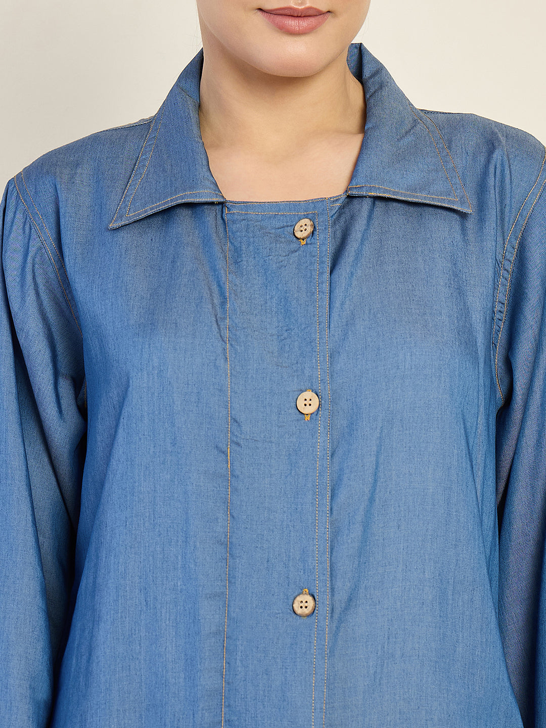 The front-open blue abaya burqa combines modesty with modern style, tailored for Islamic and Muslim women. Crafted from high-quality denim, it showcases a chic design enhanced by two functional patch pockets for practicality and flair. Part of the latest modest fashion collection, this abaya offers a versatile and attractive look, making it perfect for casual outings or special occasions. Elevate your wardrobe with this stylish and comfortable piece.
