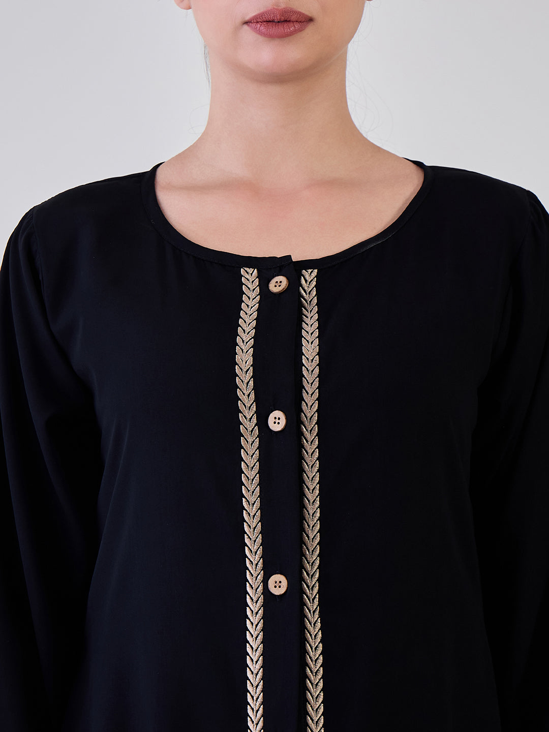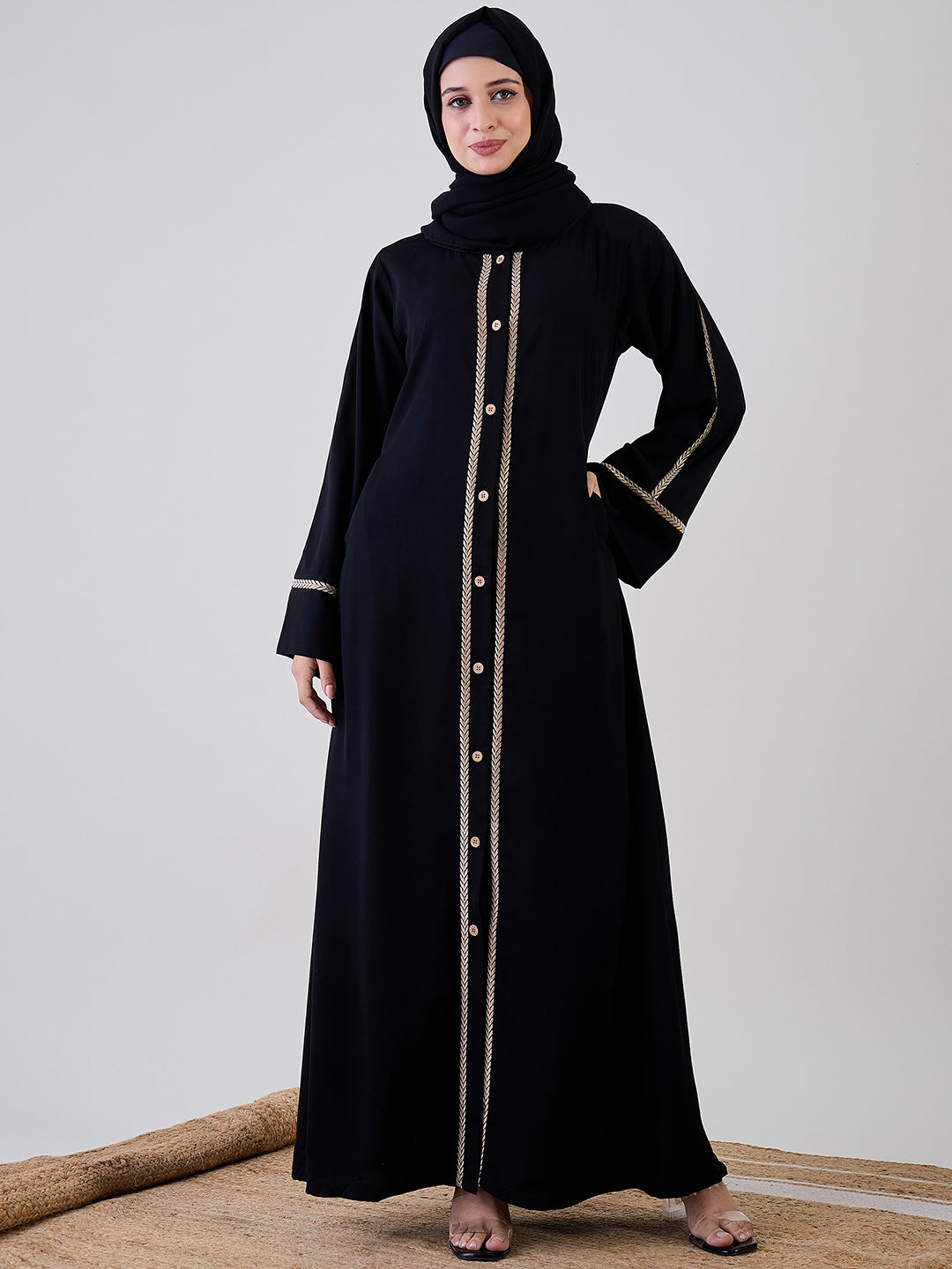 This embroidered black front-open abaya burqa, crafted from luxurious soft Nida Matte fabric, is a timeless piece for modern Muslim women. Designed with elegant bell sleeves, practical side pockets, and intricate embroidery, it combines modesty with contemporary style. Perfect for any occasion, this versatile abaya offers a graceful, sophisticated look that seamlessly blends fashion with everyday functionality.