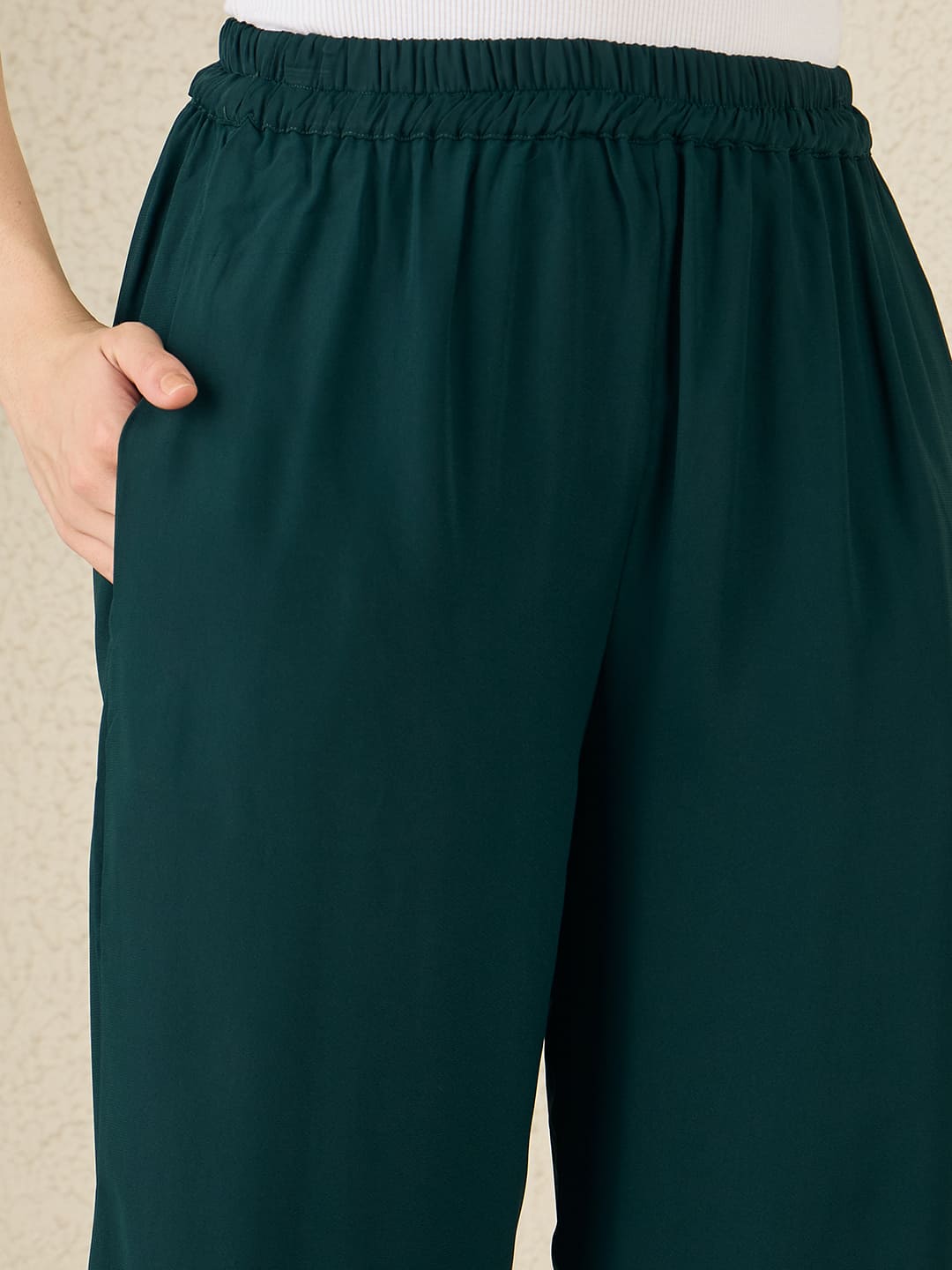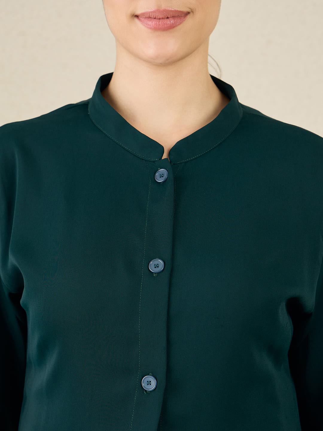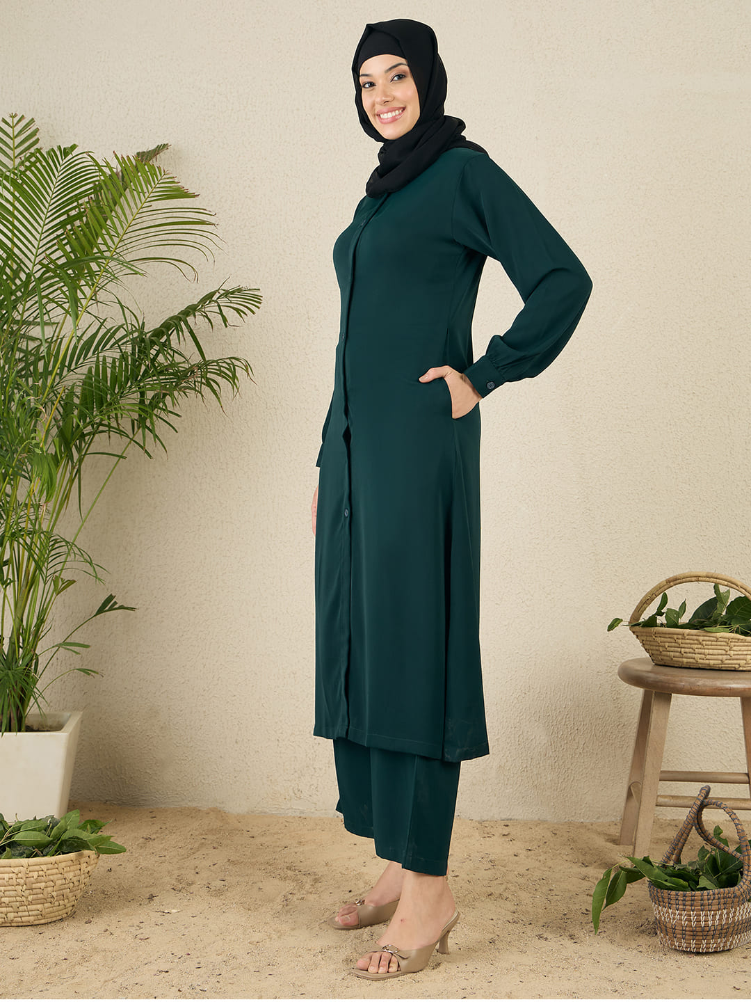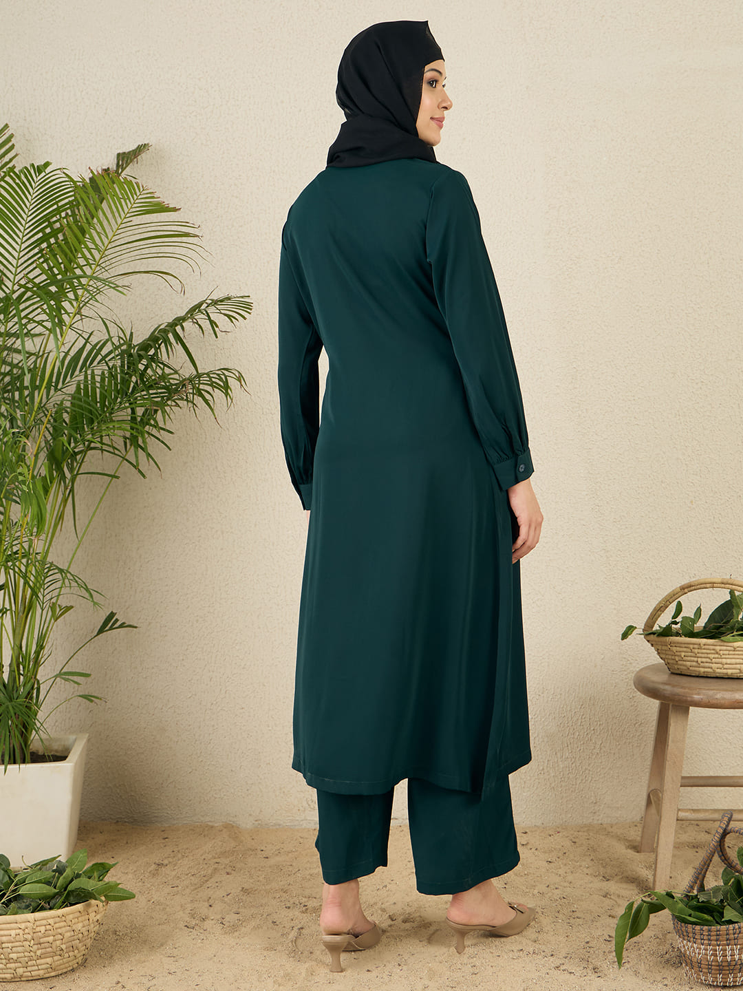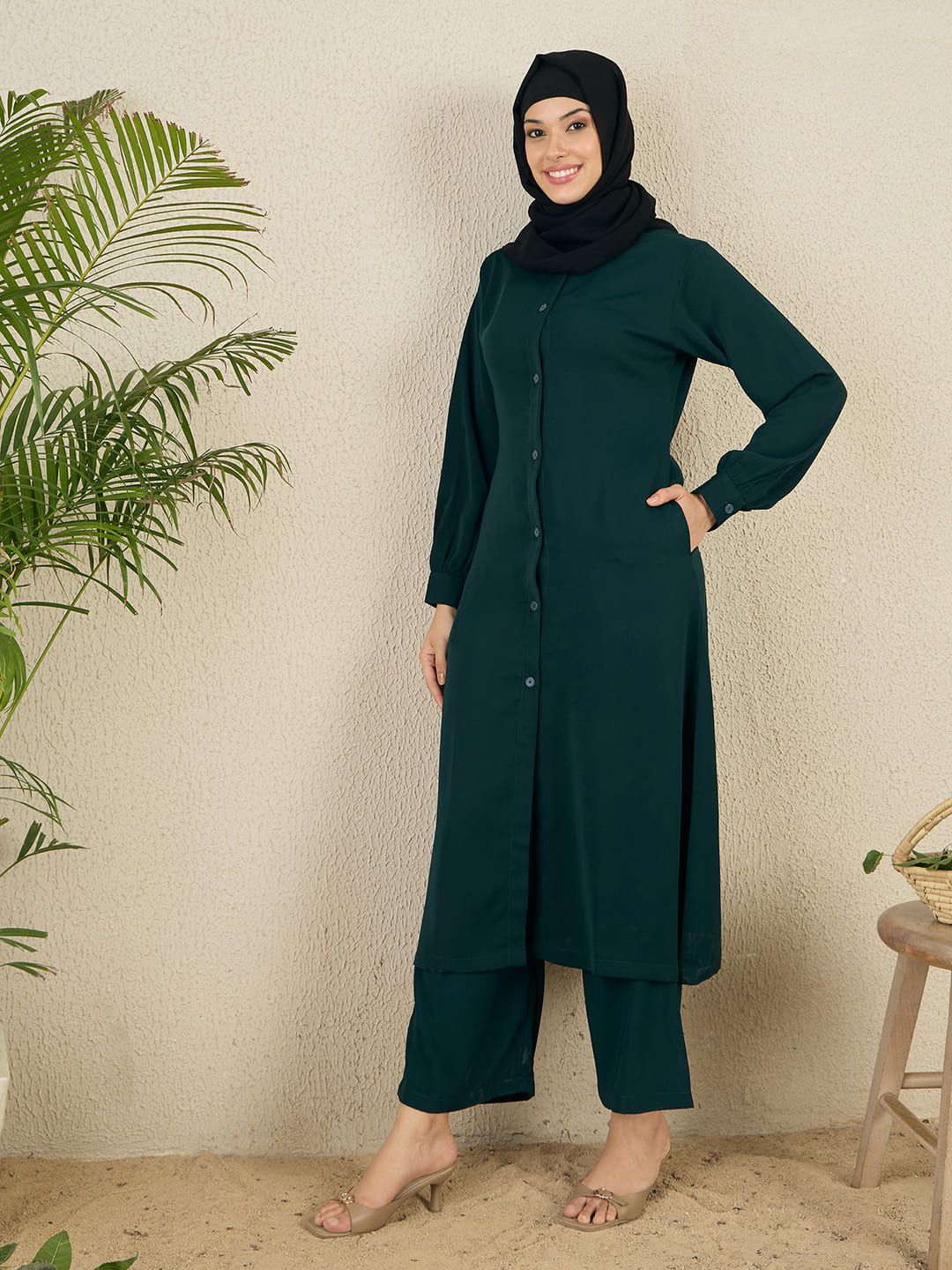 The Nabia Modest Matching Set combines a full-sleeved top with wide-leg pants, both made from premium bottle green solid parada fabric. This ensemble strikes the perfect balance between style and modesty, offering a comfortable and fashionable option. Ideal for those embracing modest fashion, it allows for a modestly elegant and stylish look