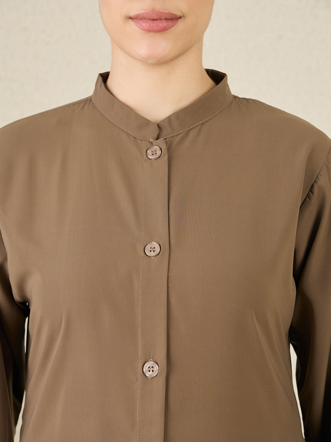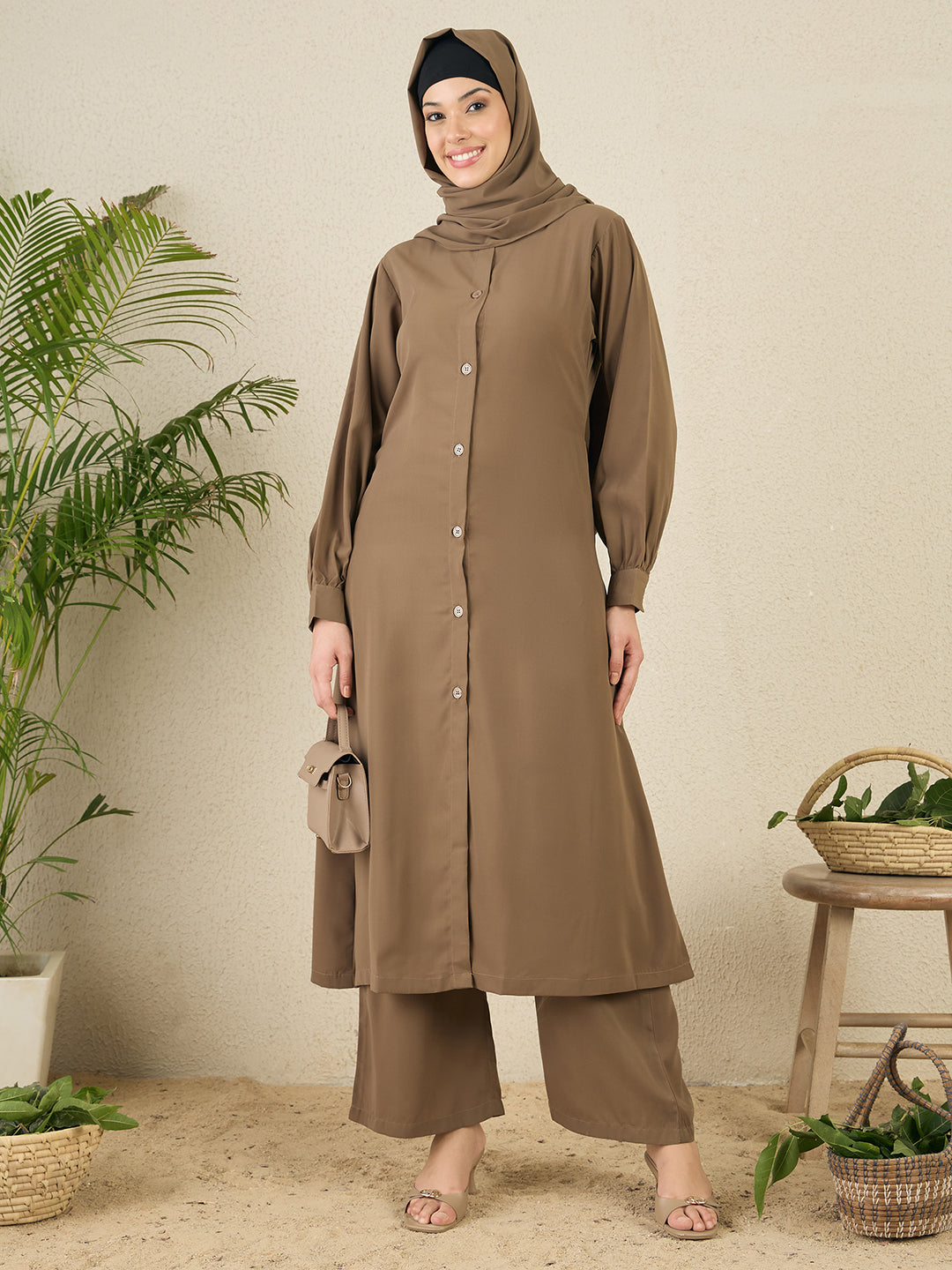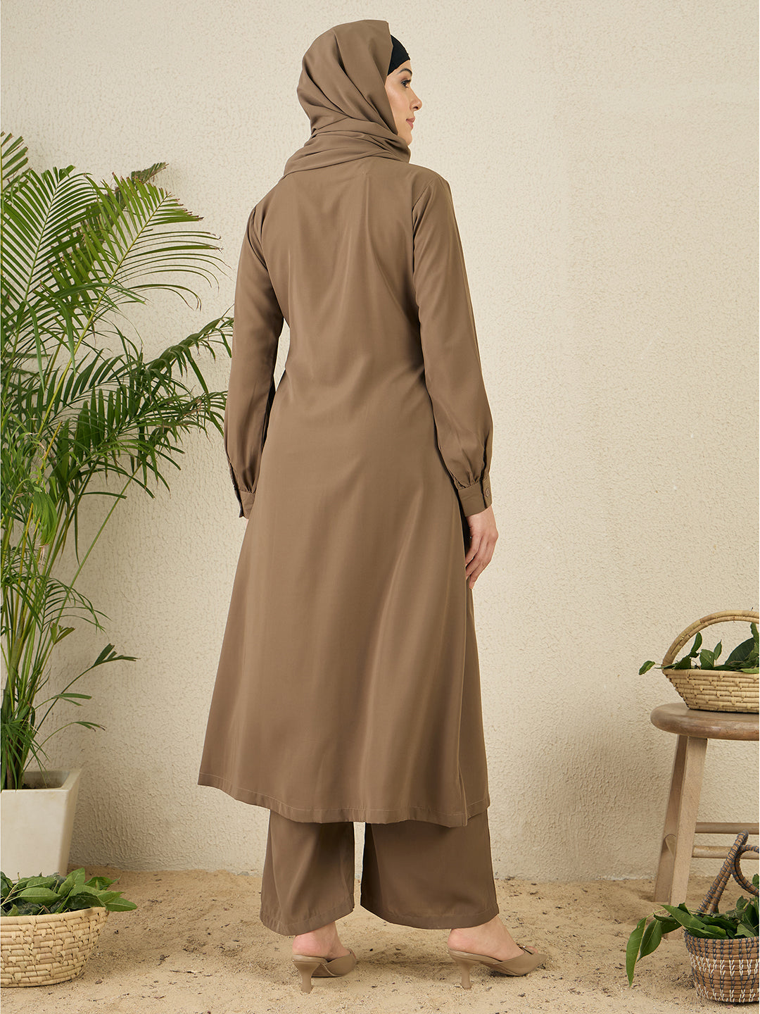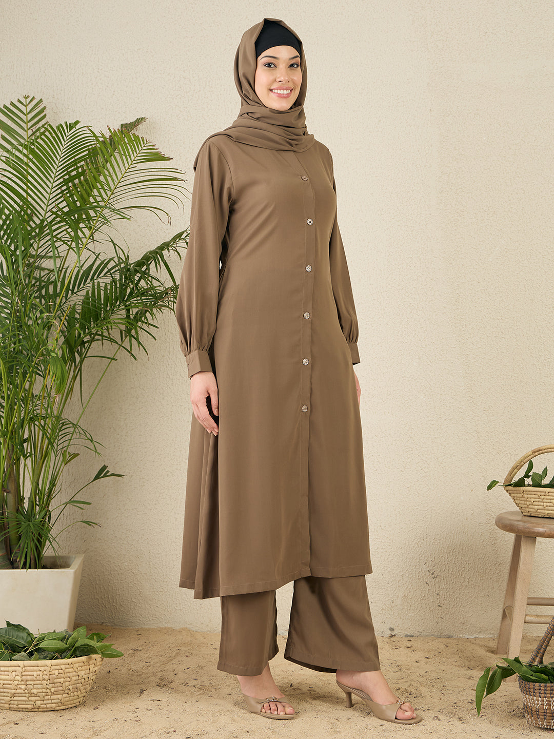 The Nabia Modest Matching Set combines a full-sleeved top with wide-leg pants, both made from premium Khaki (Oat) solid Nida matte fabric. This ensemble strikes the perfect balance between style and modesty, offering a comfortable and fashionable option. Ideal for those embracing modest fashion, it allows for a modestly elegant and stylish look