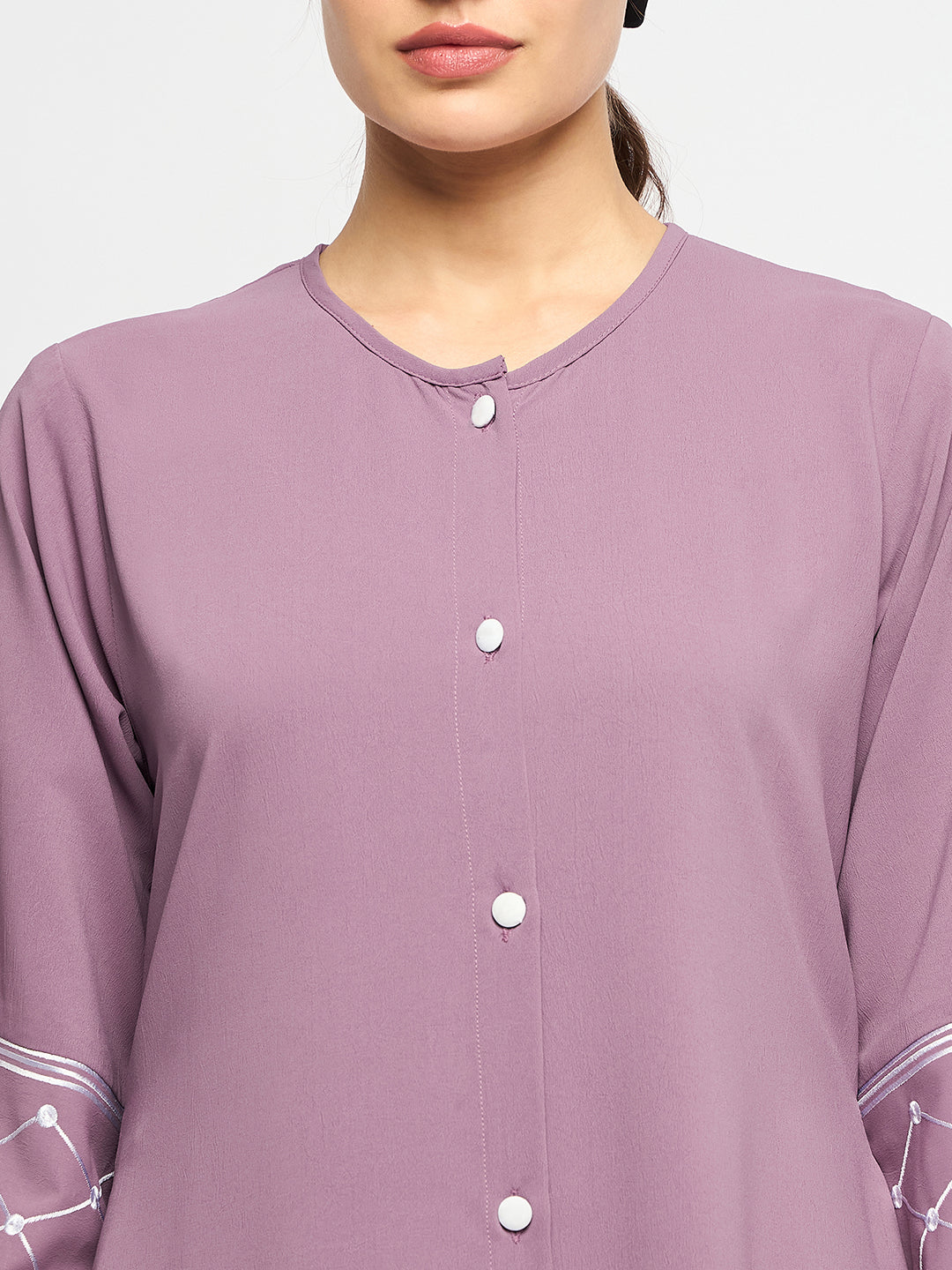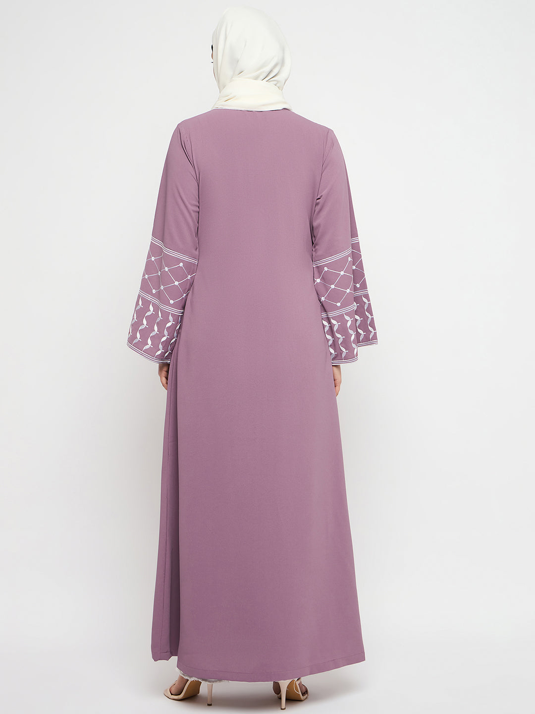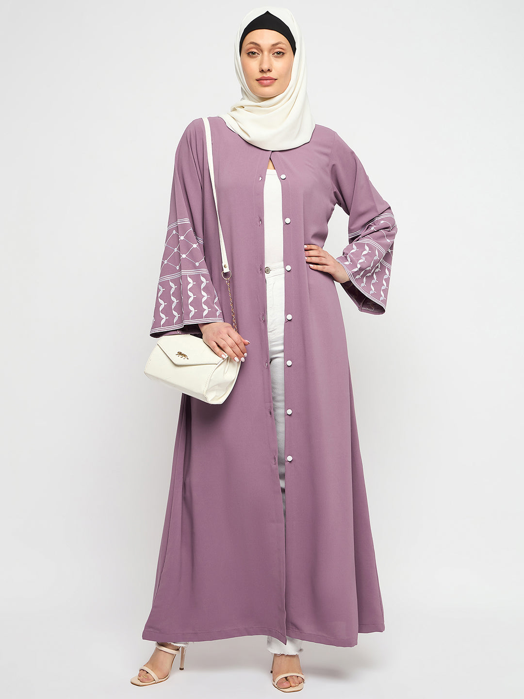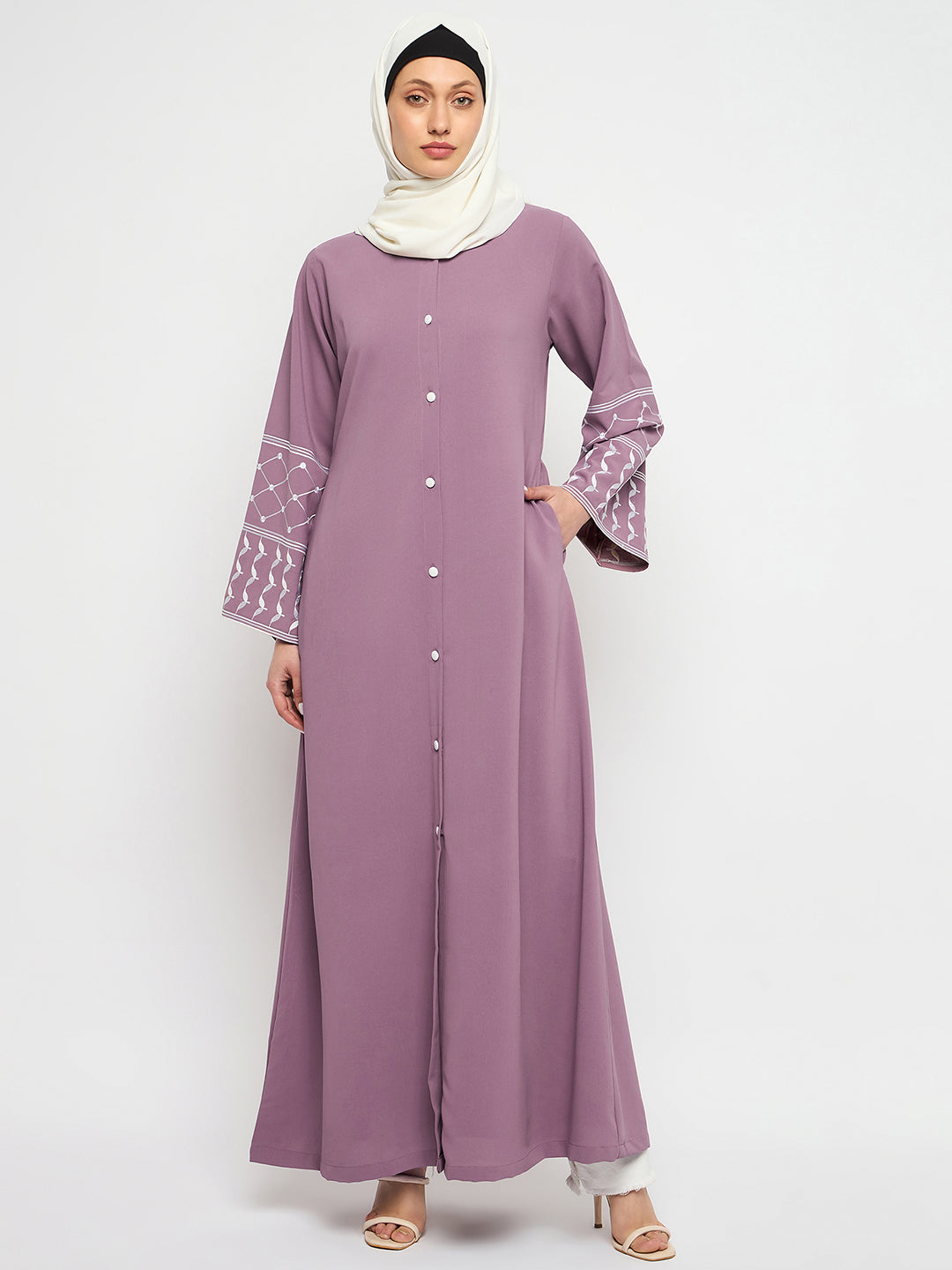 Elevate your style with the pink Palestine Abaya, adorned with intricate embroidery inspired by Palestinian heritage. Crafted from breathable cy crush, featuring front open, button closure, free sleeves, a round neck, and a solid pattern, this abaya embodies modesty, comfort, and cultural grace for Islamic women.