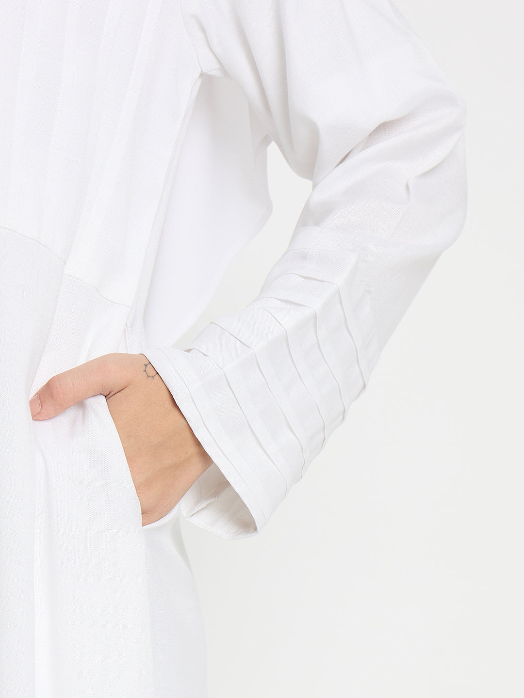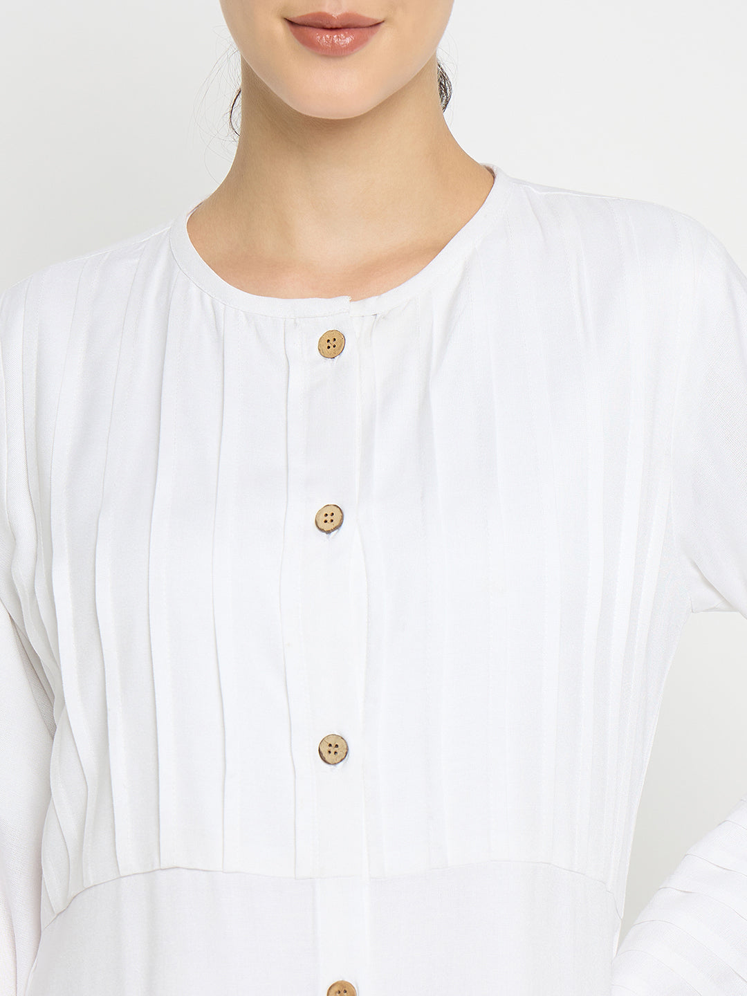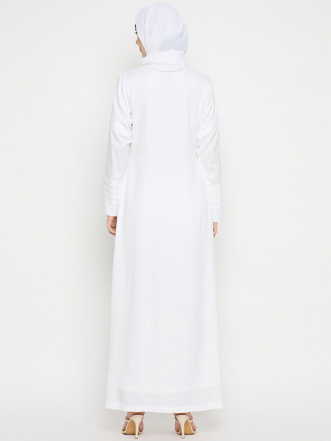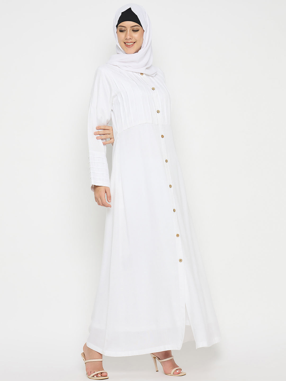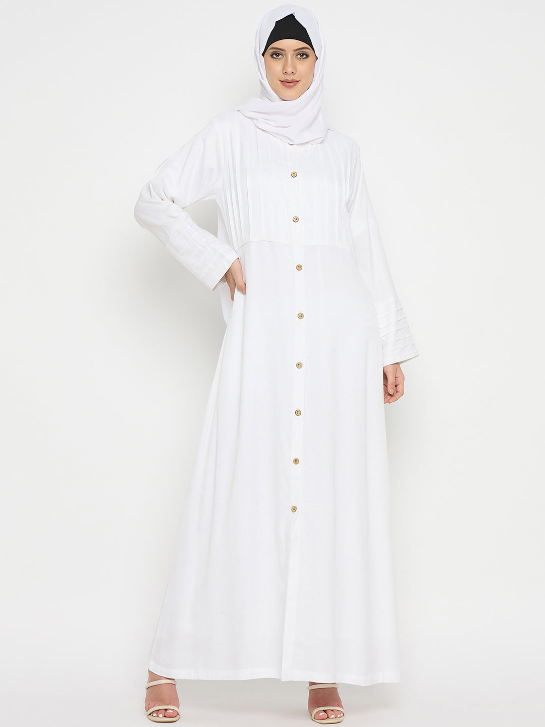 Tailored for Islamic women, this white, solid rayon Front Open Abaya boasts a front button closure, round neck, and handy side pockets. With its emphasis on modesty and comfort, it provides a relaxed fit. Suited for Umrah or Hajj, this abaya merges practicality with elegance, ensuring a stylish and comfortable experience during religious pilgrimages.