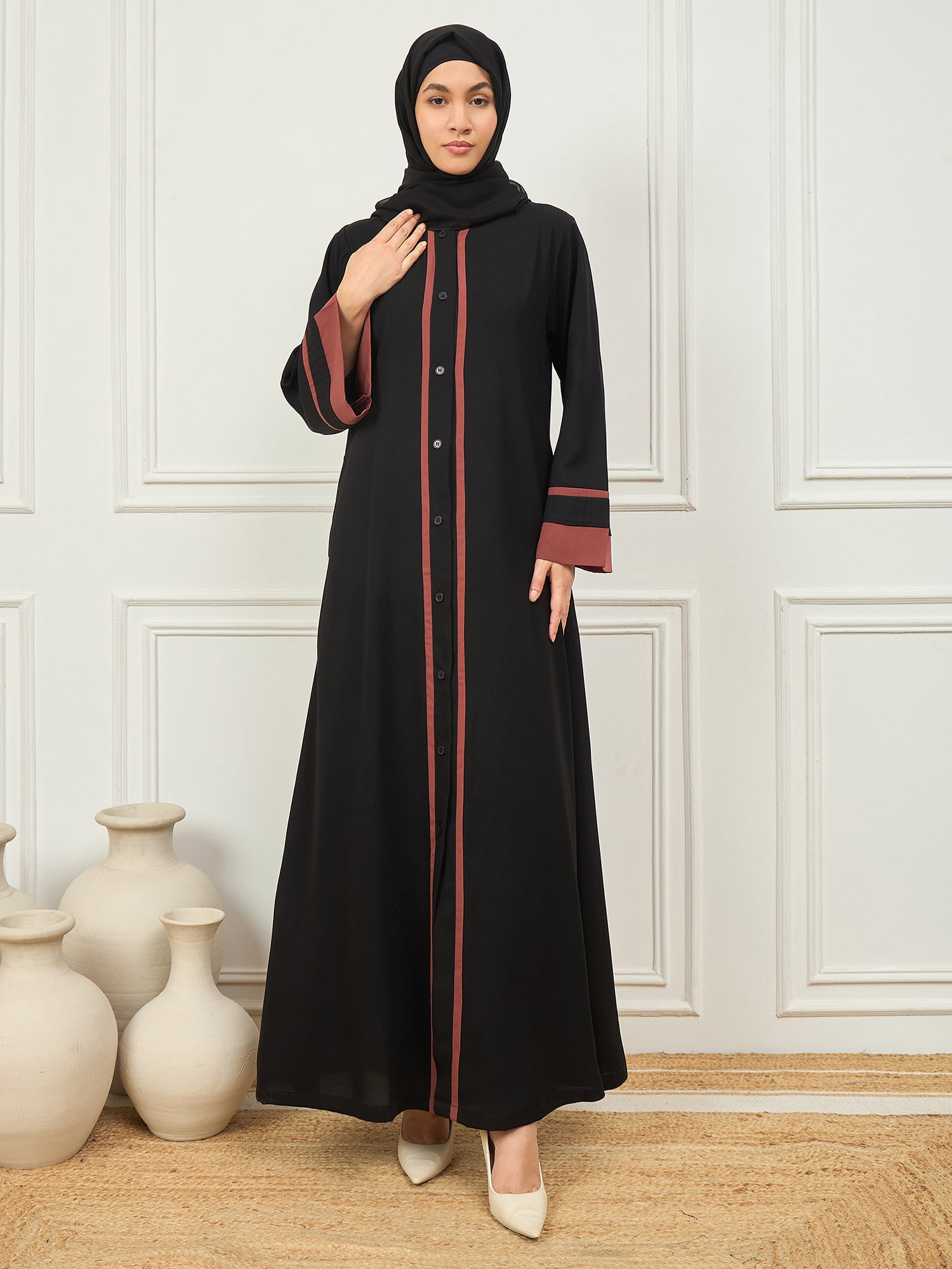 Elevate your modest wardrobe with this two-colored abaya burqa in black, beautifully accented with rust piping. Crafted from soft Nida matte fabric, it features a round neck, front-open style, bell sleeves, and button closure for added elegance. Designed for Muslim and Islamic women, this abaya is perfect for both casual and special occasions. Its timeless design blends classic charm with modern modest fashion, offering comfort, grace, and sophisticated style.