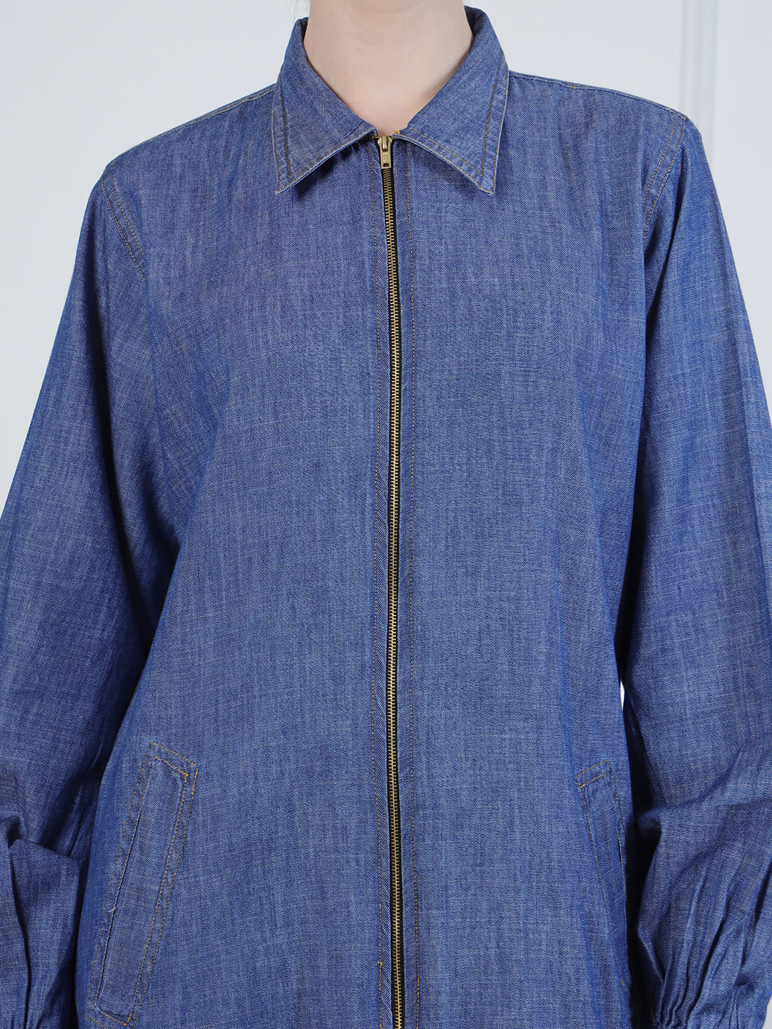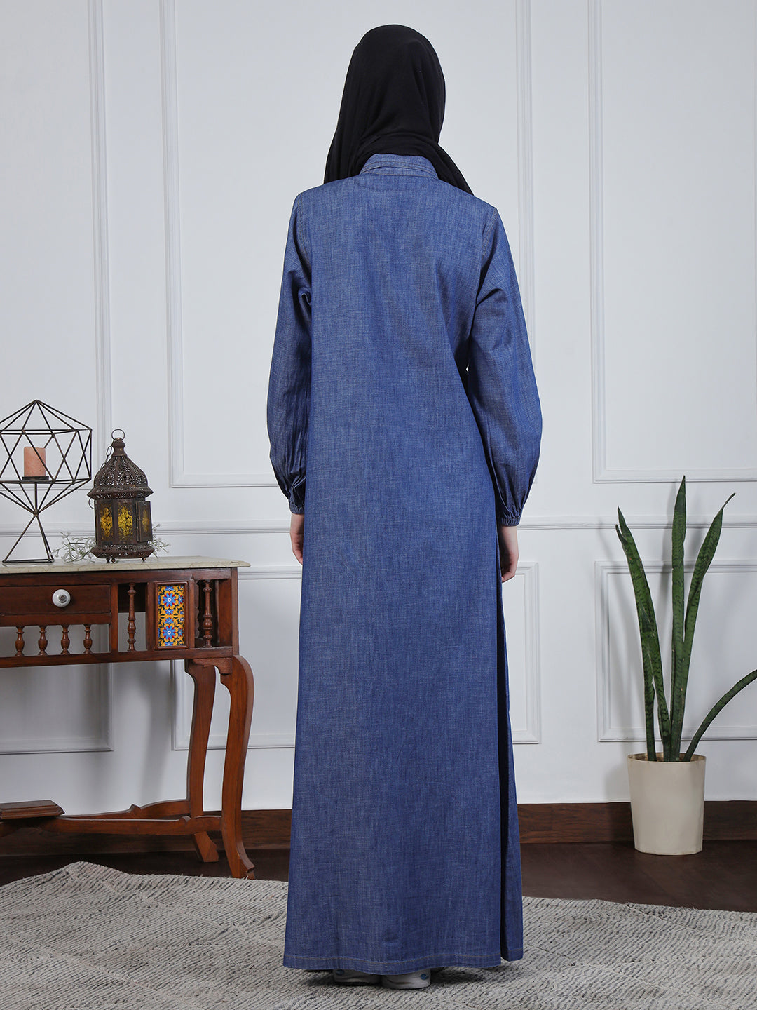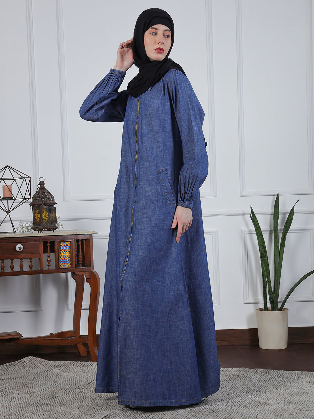 This denim zip-closure abaya burqa for Islamic women features side pockets for convenience. Combining modesty with modern fashion, it offers a relaxed fit and comfortable wear. The latest design ensures an attractive look, making it a stylish and practical choice for contemporary Muslim women.