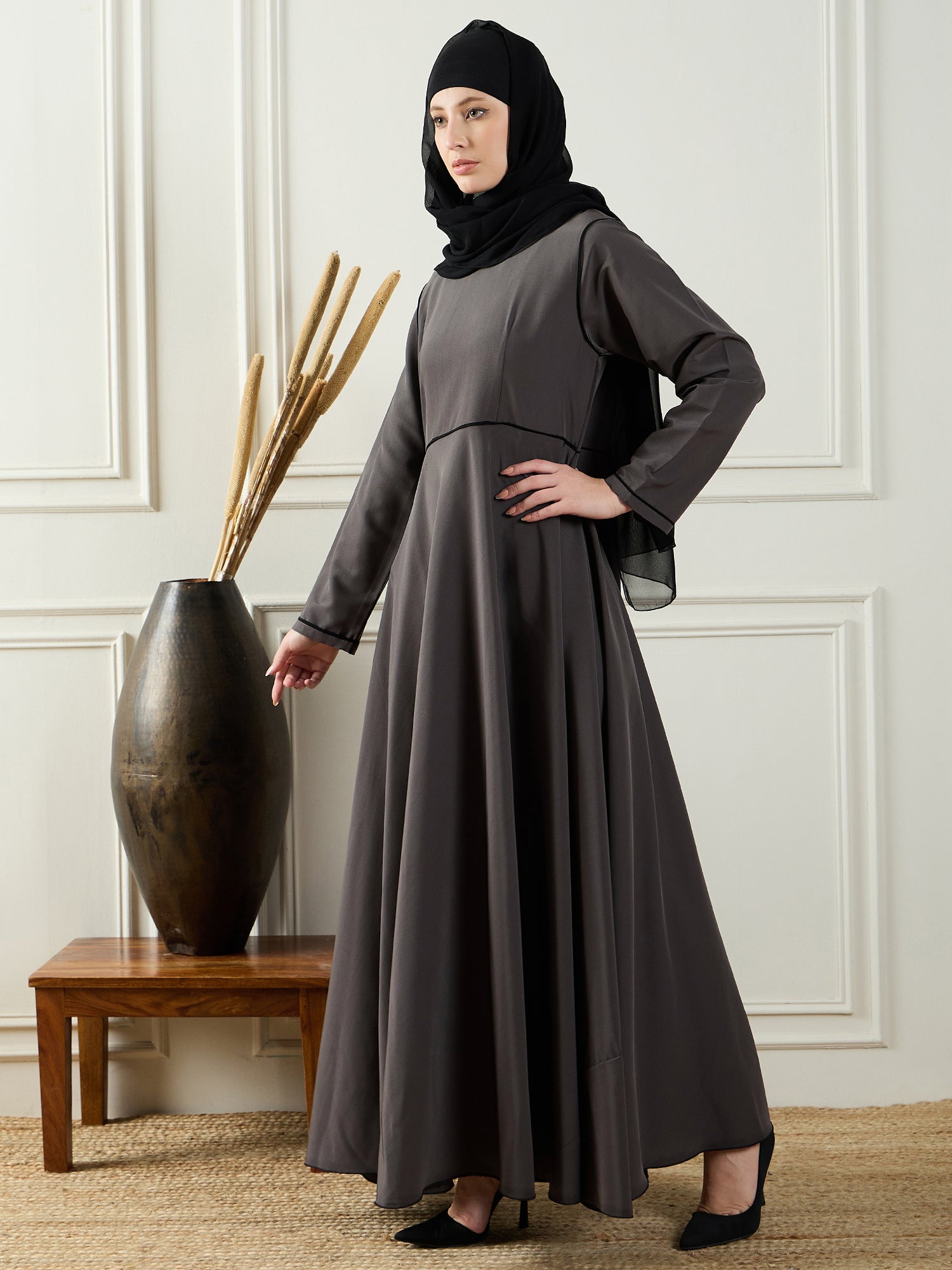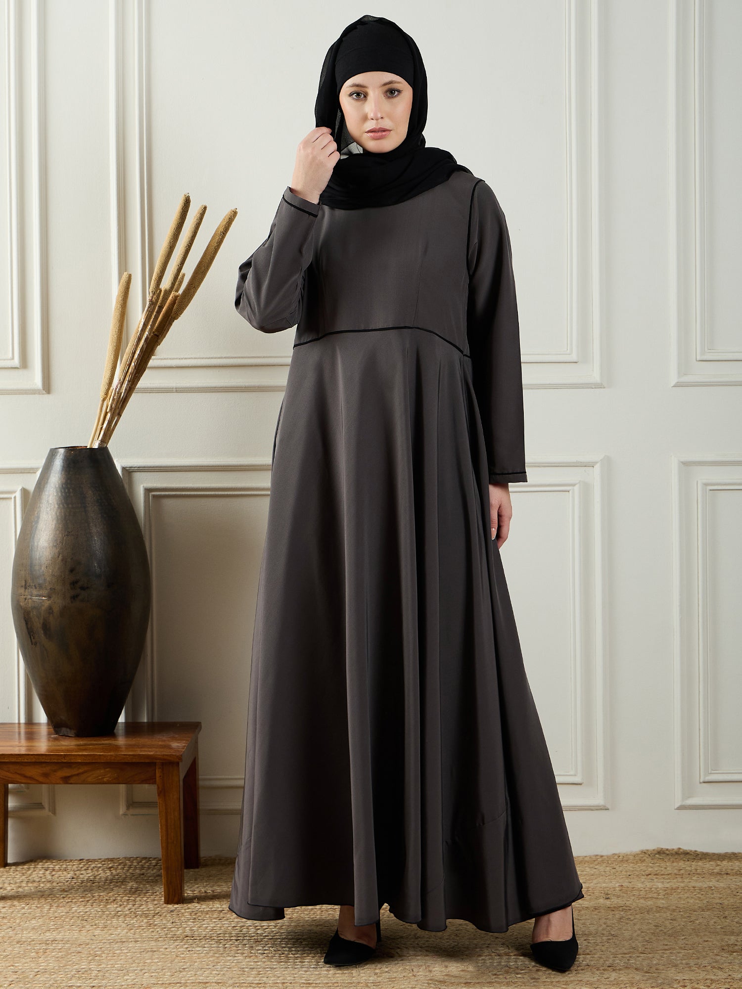 AThe Nabia Soft Abaya Burqa in Grey offers a blend of modern style and traditional modesty. Made from soft nida matte fabric, this abaya ensures a comfortable and breathable fit. The solid round neckline gives it a sleek, timeless appeal, while the refined piping detailing adds a chic touch to the overall design. Bell sleeves further enhance its elegant silhouette, offering a flowy, graceful look. Perfect for everyday wear, this abaya caters to Muslim women seeking both modesty and fashion-forward elegance in their wardrobe.